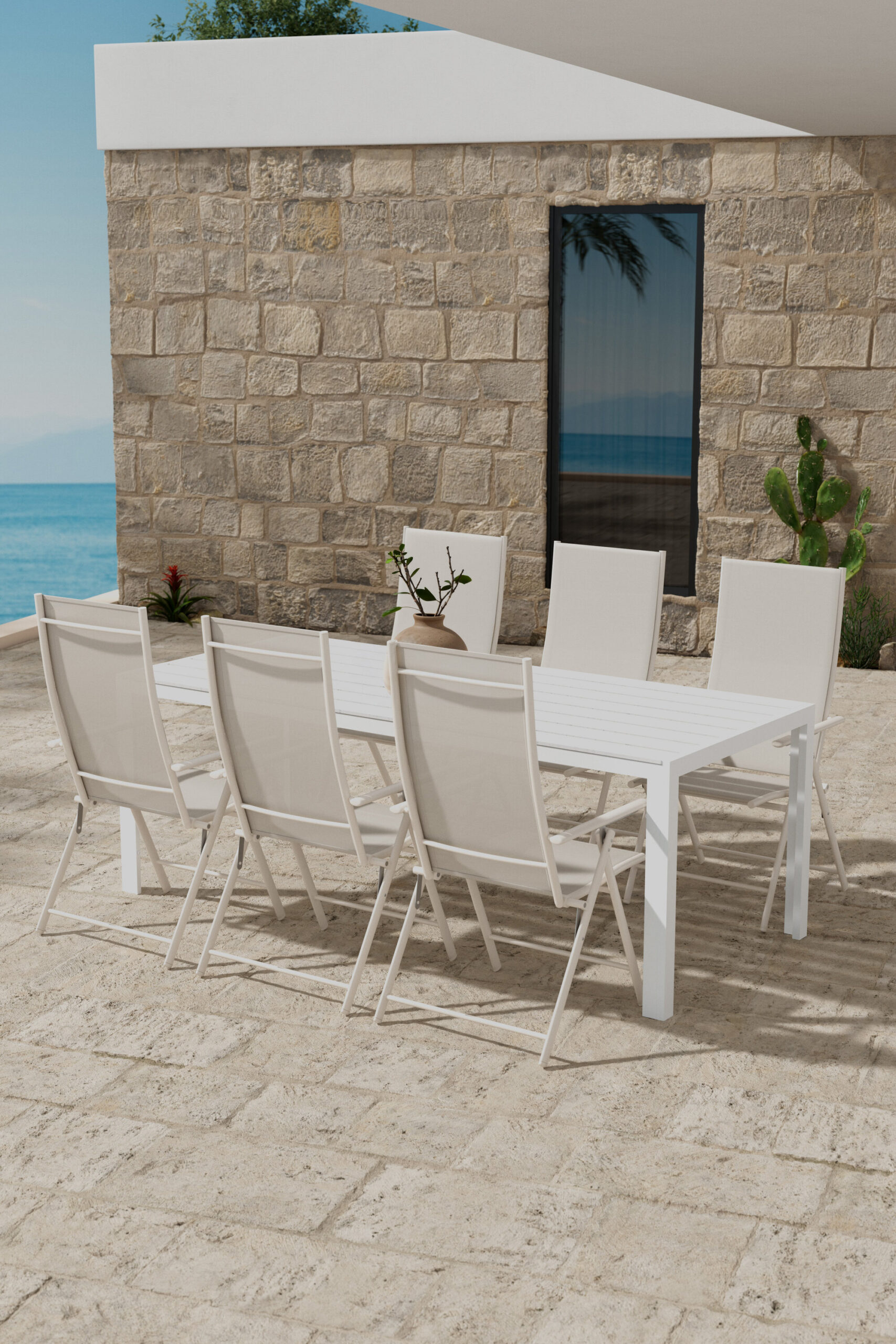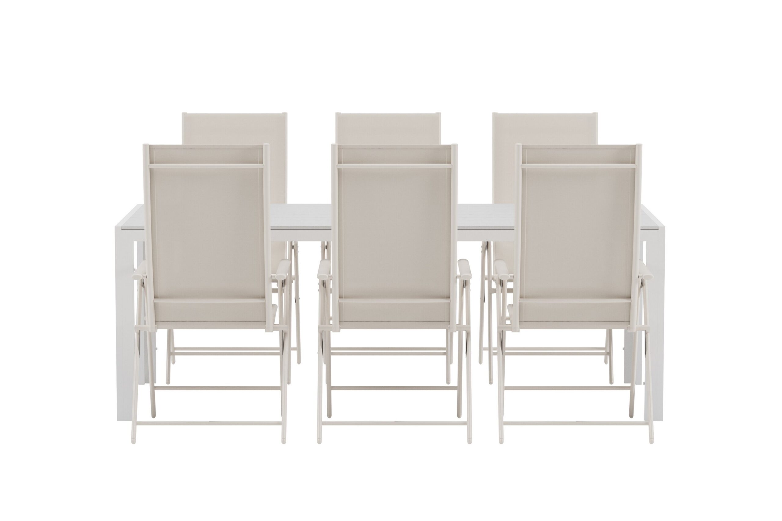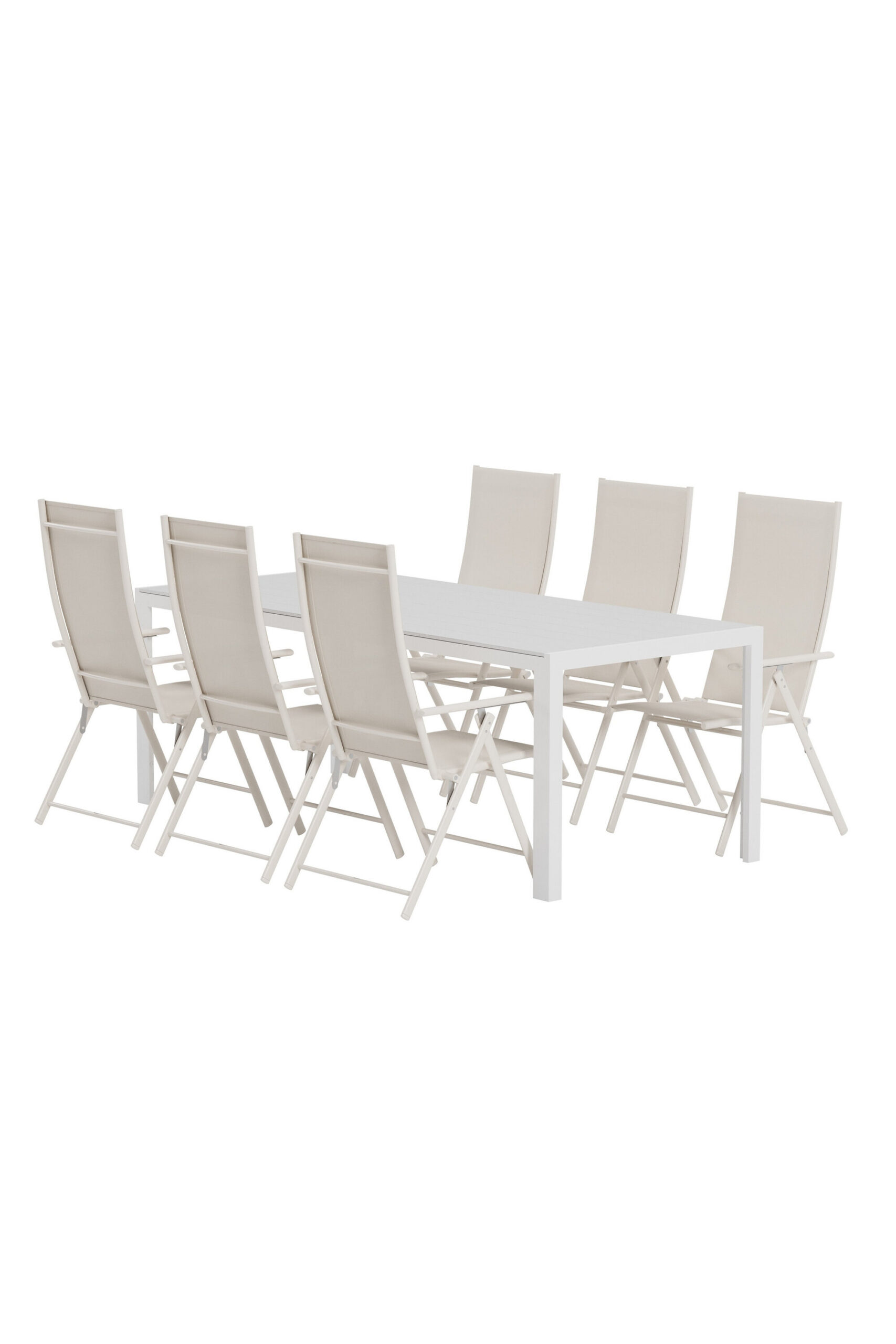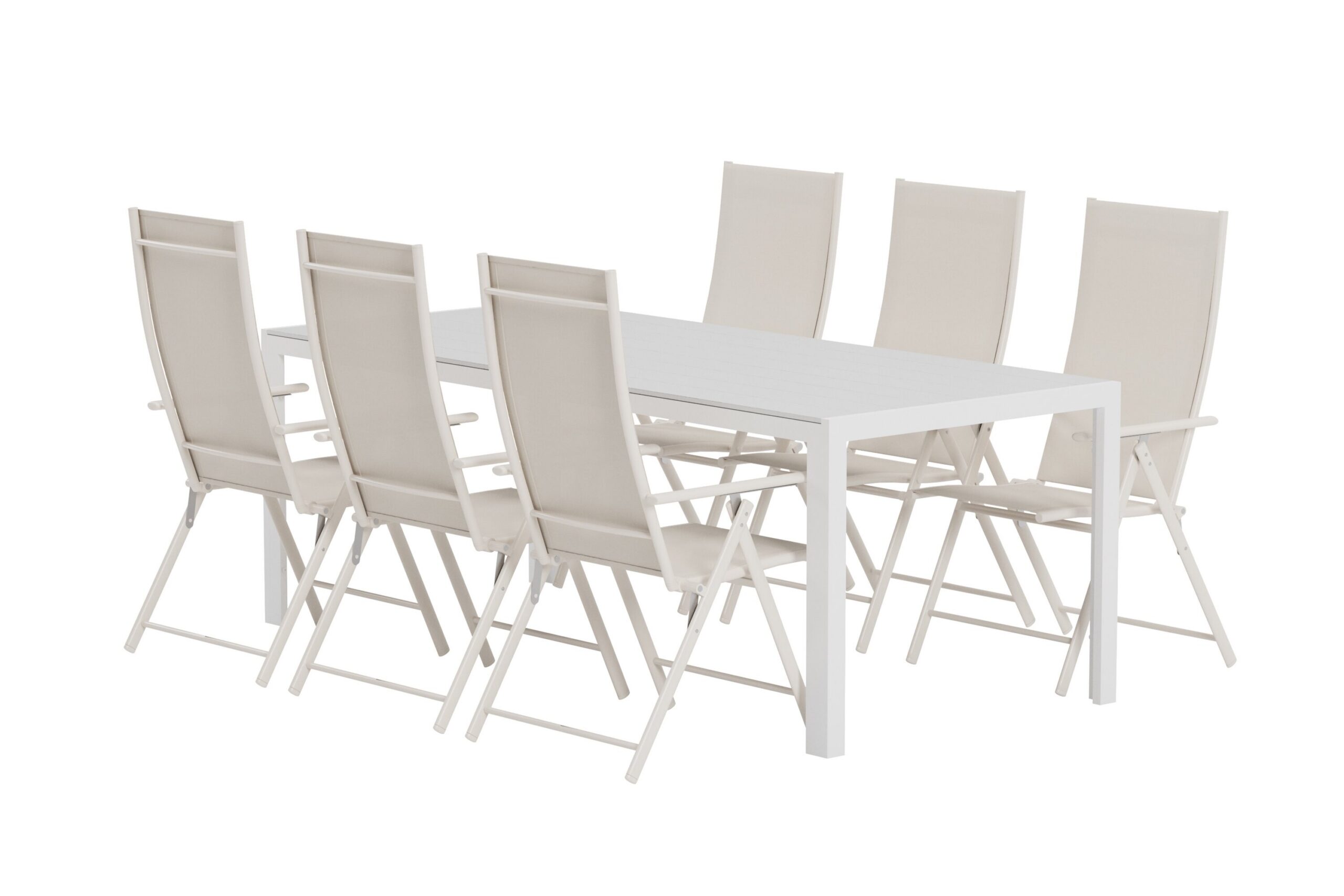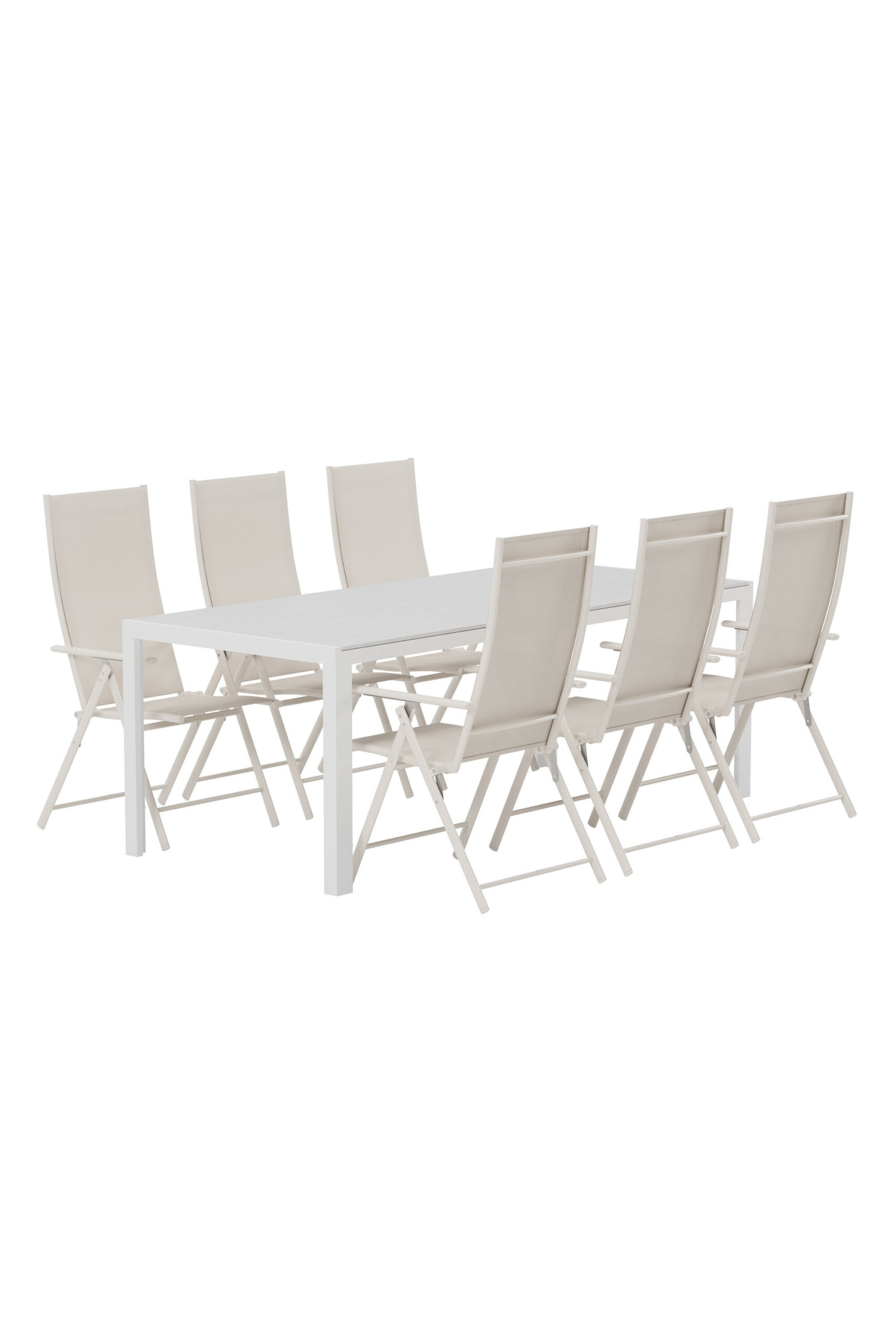 Selle kuuest Lavenzo söögitoolist ja ristkülikukujulisest Break söögilauast koosneva söögikomplektiga looge elegantne väljas einestamisnurk. Lavenzo toolidel on kaasaegne beež terasraam ja mugav tekstiilist iste. Need on kokkupandavad, et neid oleks lihtne hoida, ja neil on reguleeritav seljatugi, mis lisab mugavust nii söömise kui ka lõõgastumise ajal.