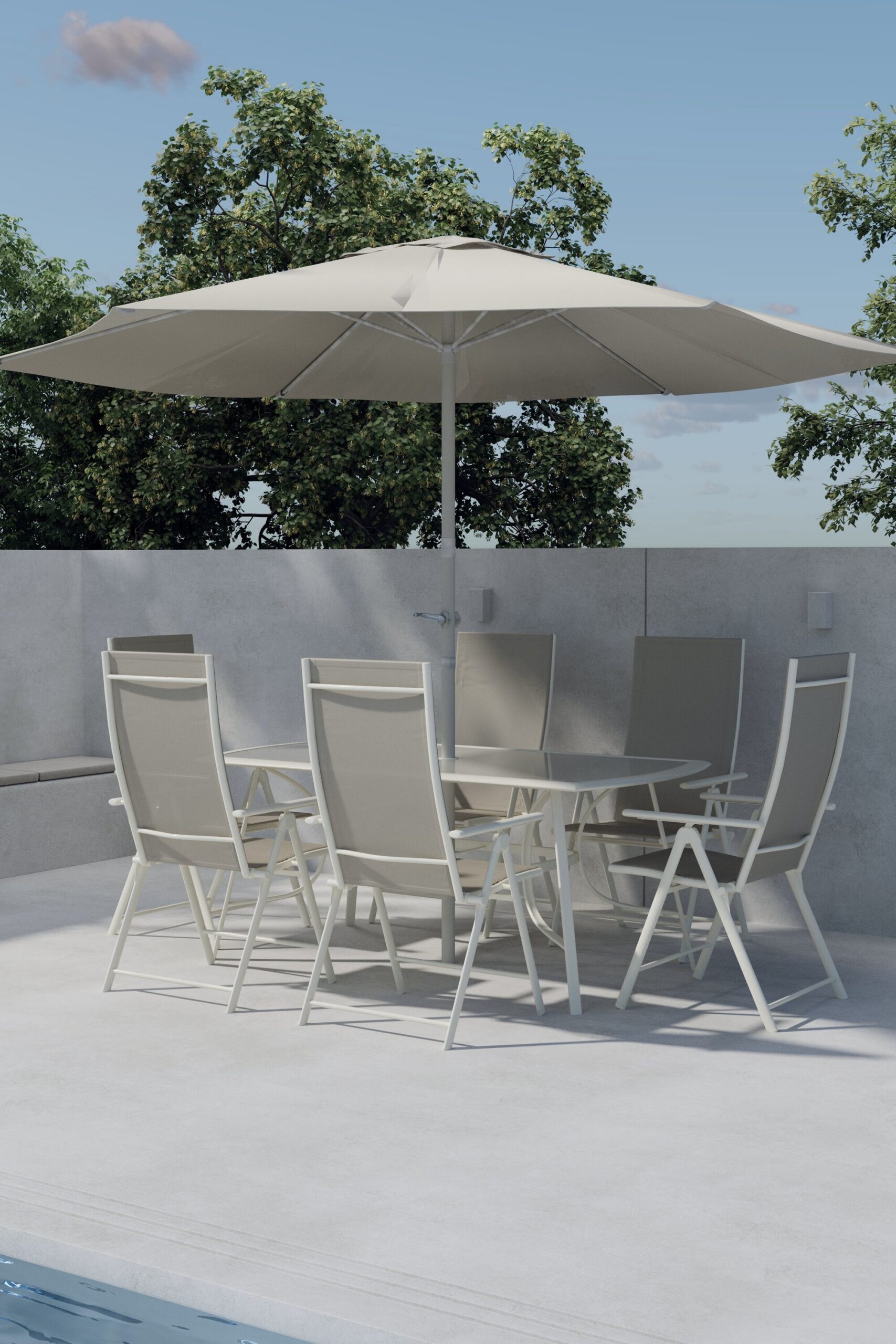Loo Brekki söögikomplektiga ideaalne koht suvisteks einestamisteks ja koosviibimisteks. Komplekti kuulub mahukas klaasplaadiga söögilaud, kuus mugavat lamamistooli ja klanitud päikesevari, mis pakub päikeselistel päevadel värskendavat varju.