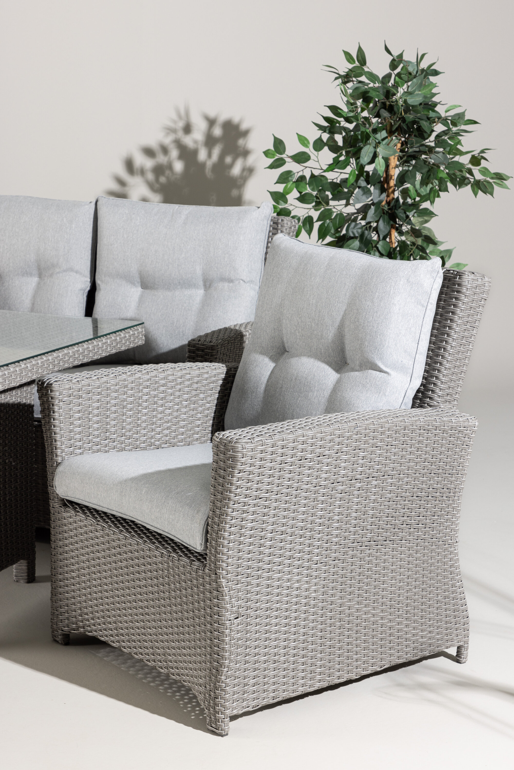 Kõrgema lauaga salongikomplekt terrassile või rõdule, sealhulgas helehallid padjad. Diivan on valmistatud hallist sünteetilisest rotangist ja lauaga on kaasas kaasaegne lauaplaat. Vajalik lihtne kokkupanek.