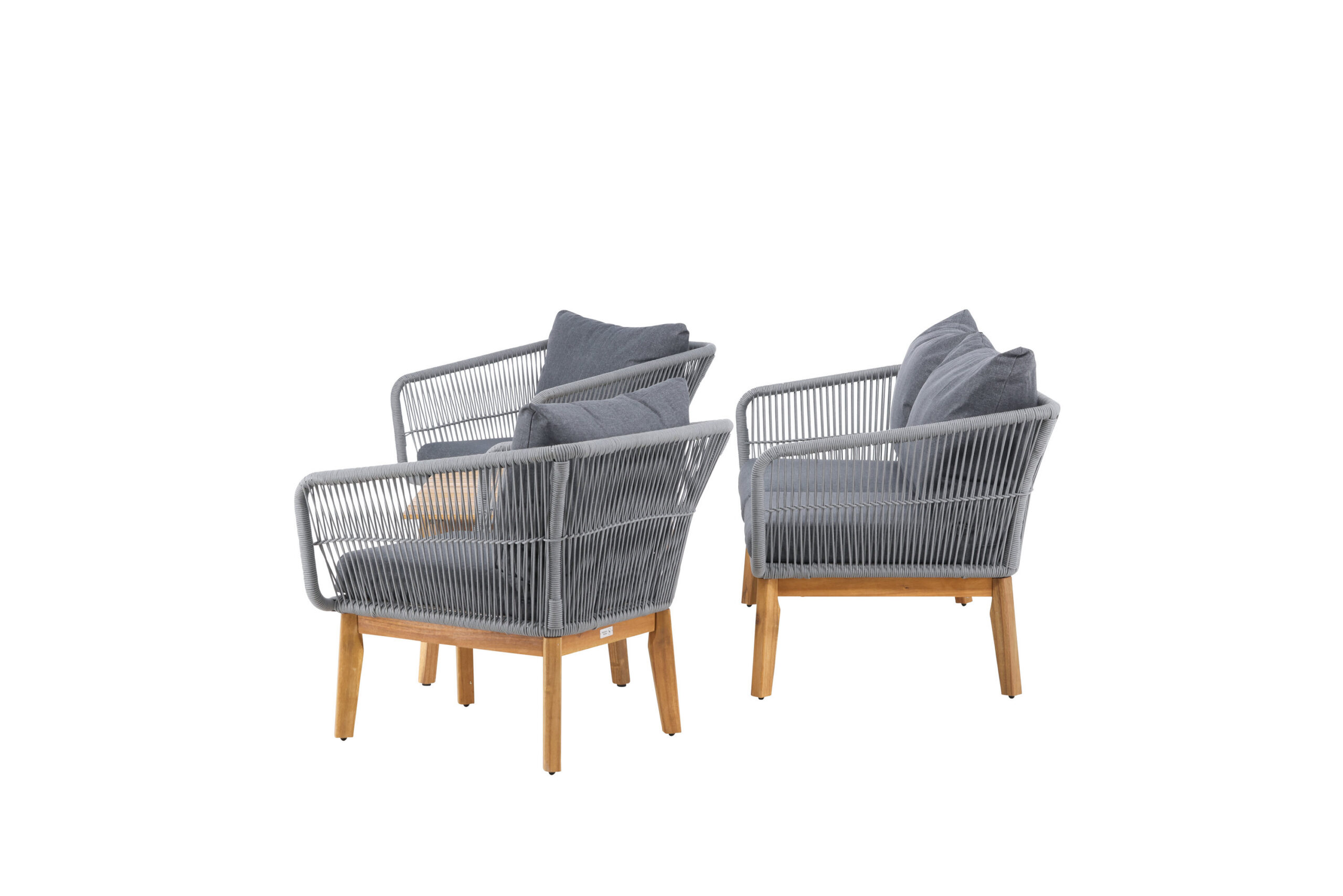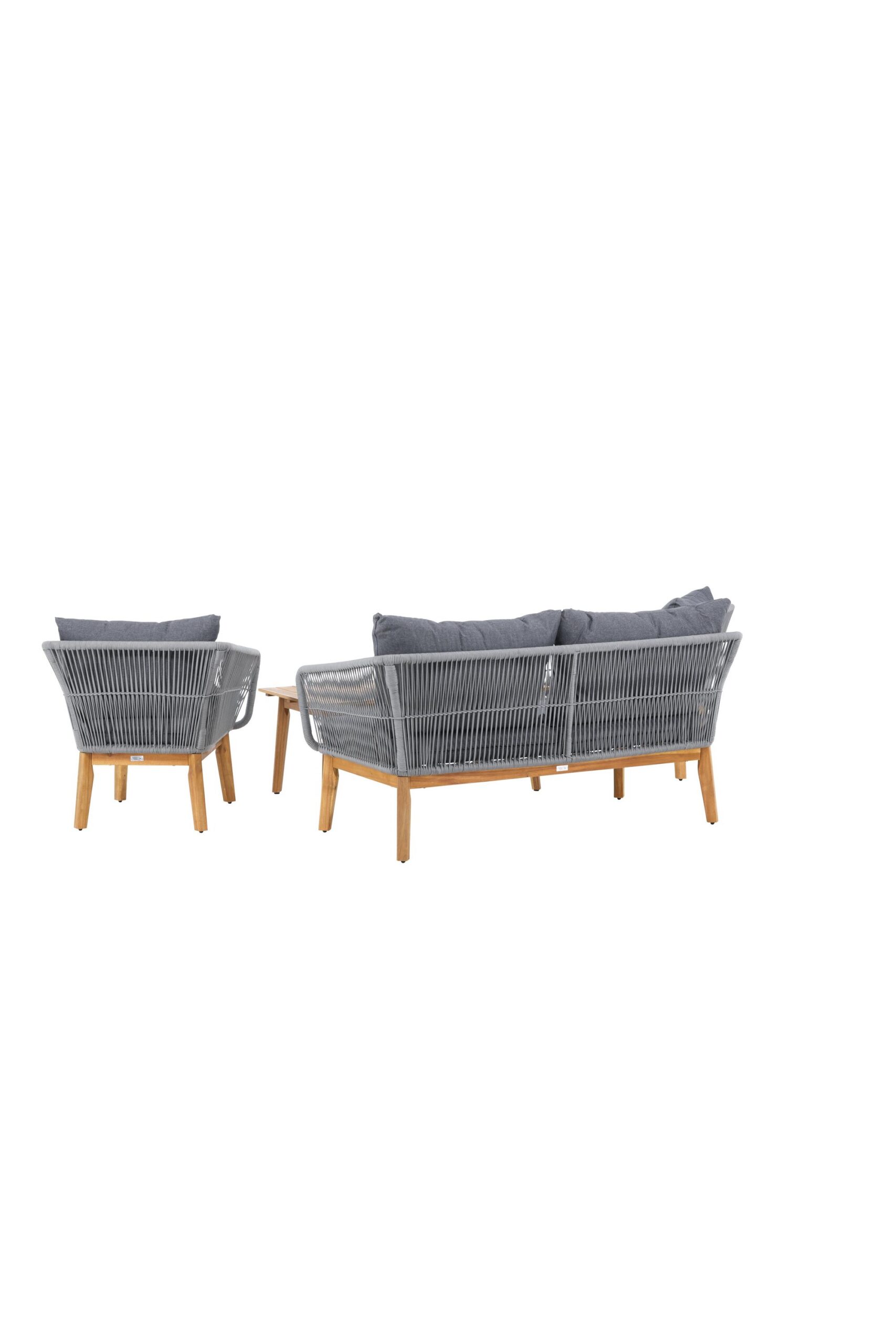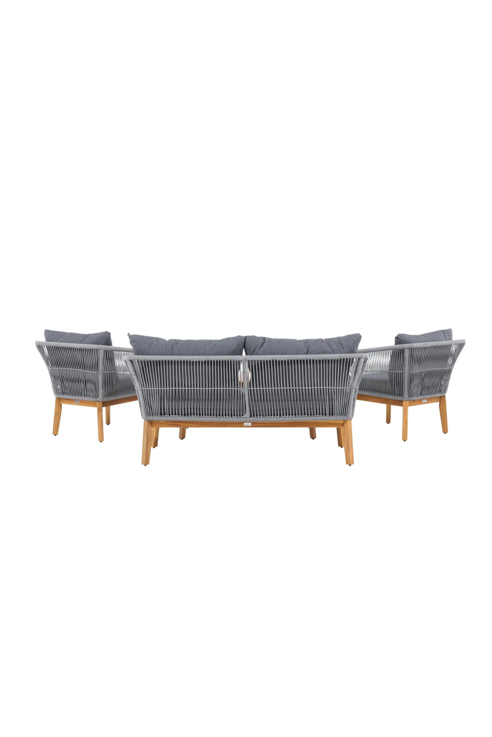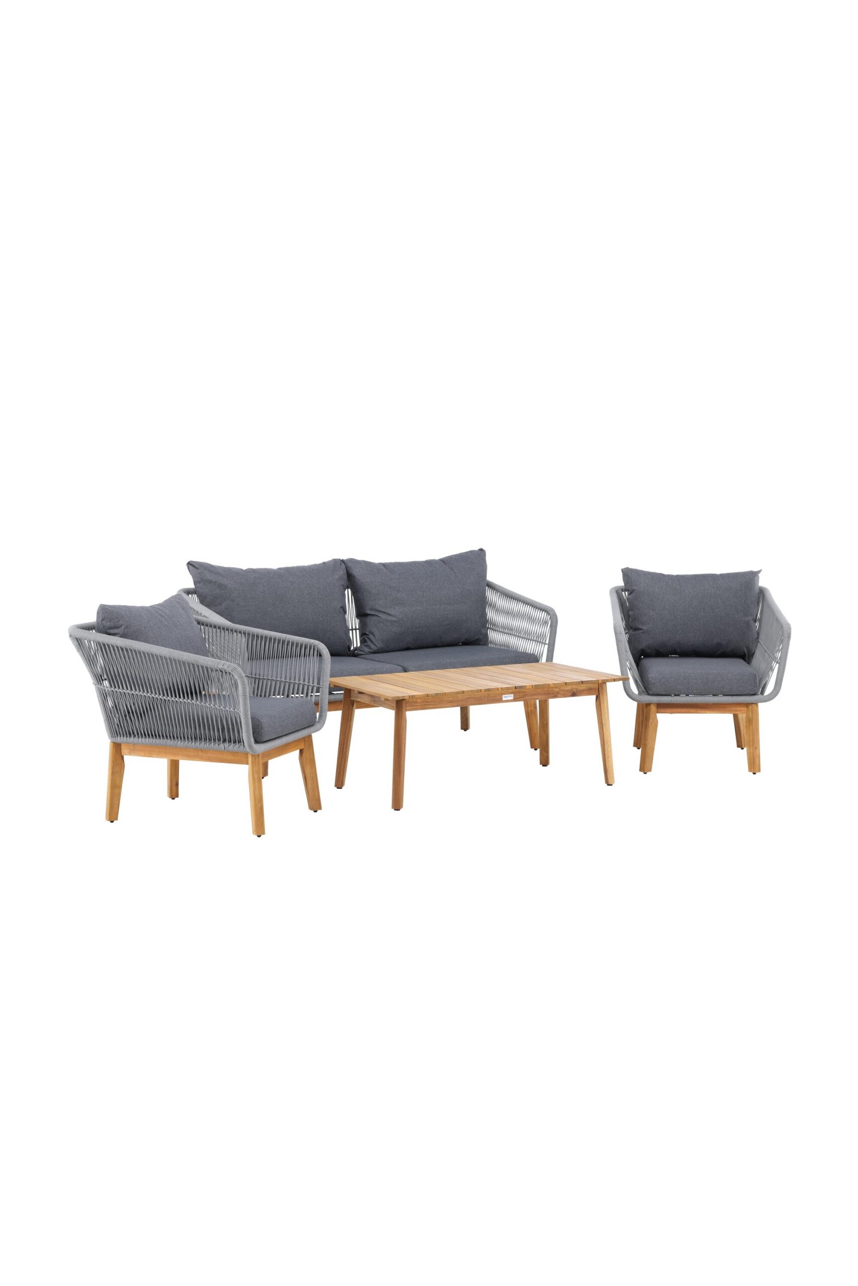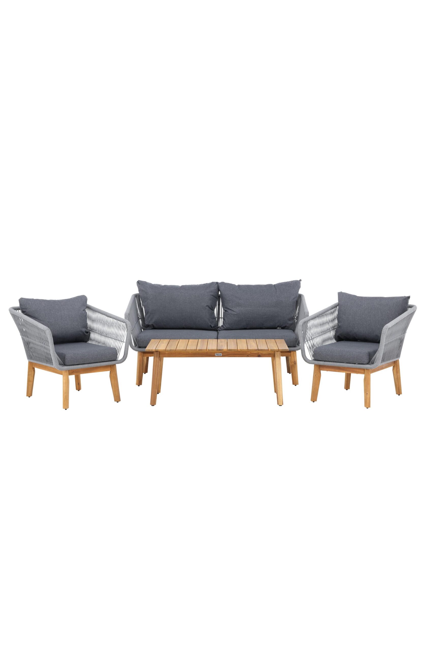 Chania – trendikas diivanikomplekt, mis keskendub mugavusele ja pilkupüüdvale disainile. Komplekt koosneb kahekohalisest diivanist, kahest paksude vastupidavate tumehallide patjadega tugitoolist ja üleni kaunist akaatsiapuust valmistatud madalast diivanilauast. Diivanikomplektil on akaatsiast jalgadega alumiiniumraam, tagumine osa ja küljed on aga põimitud helehalli köiega, et tagada stiilne disain. Akaatsia detailid koos kohvilaua klassikalise kujuga loovad eksklusiivse ja ühtse välimuse.
