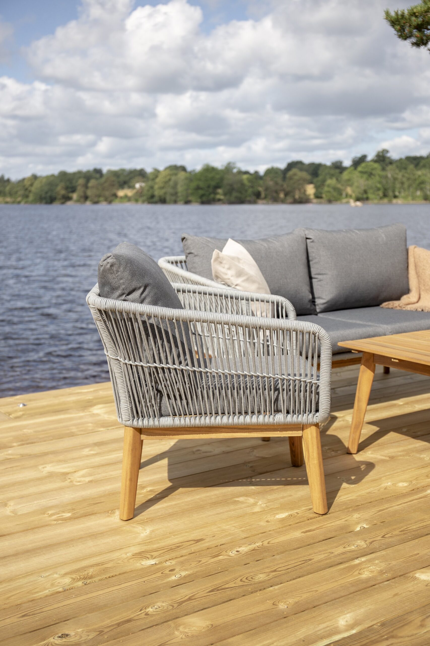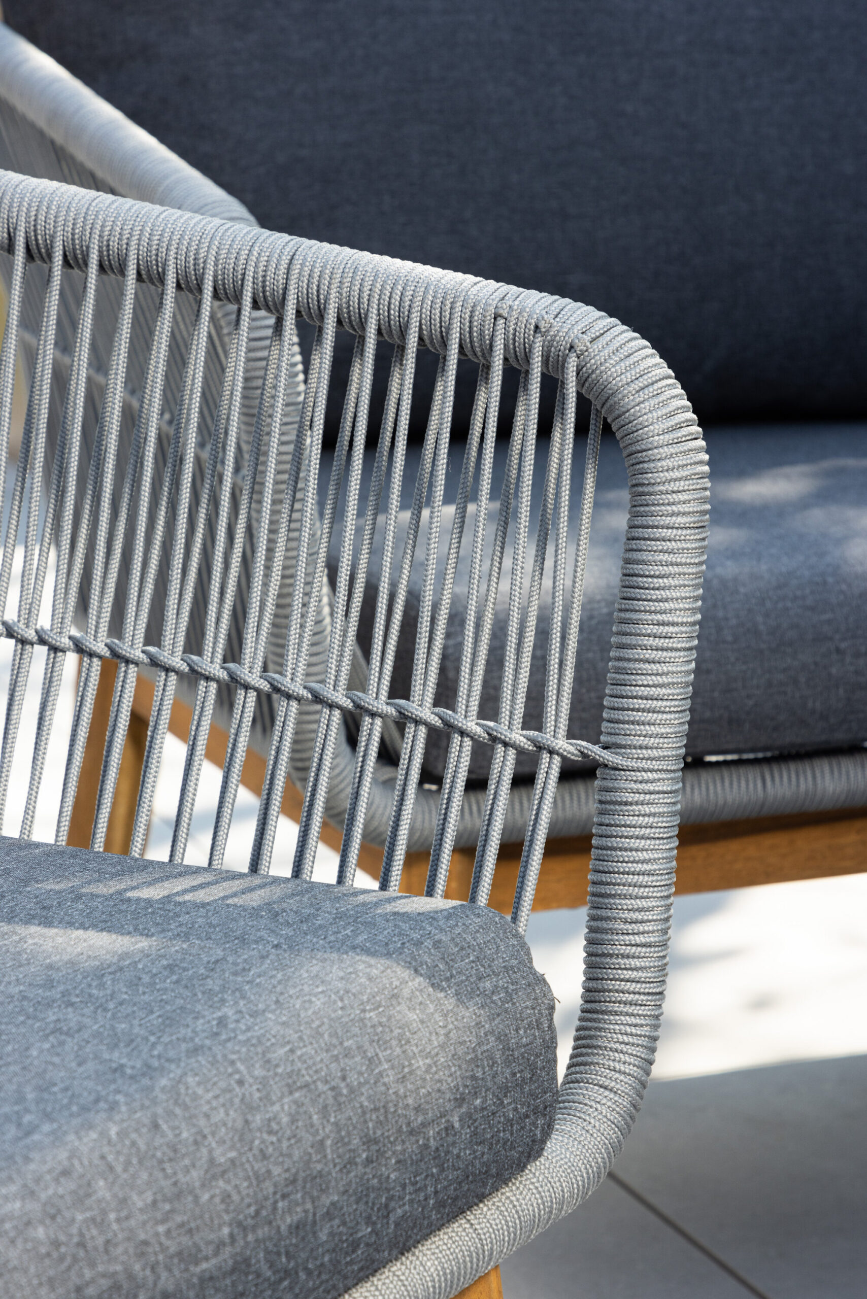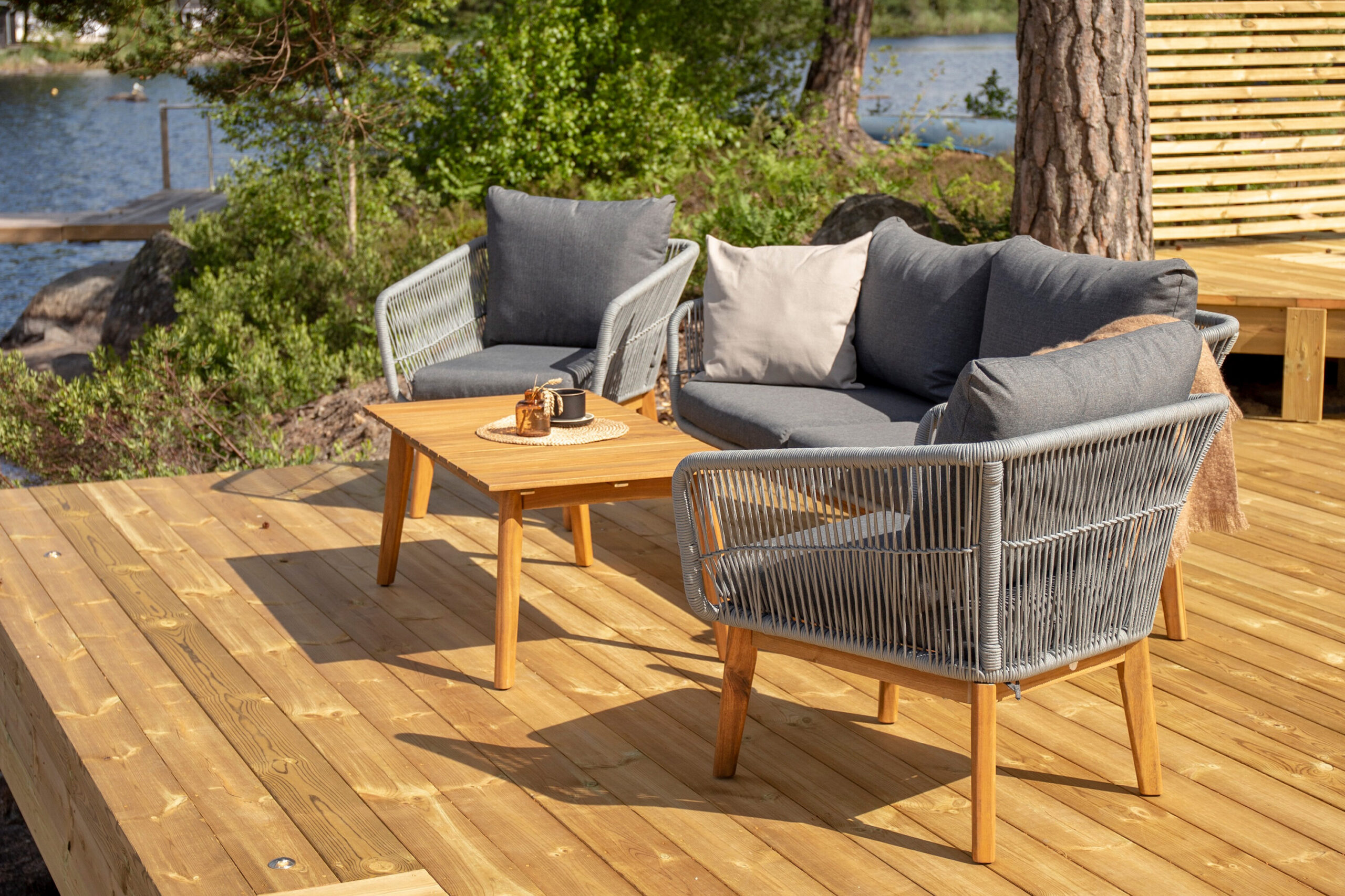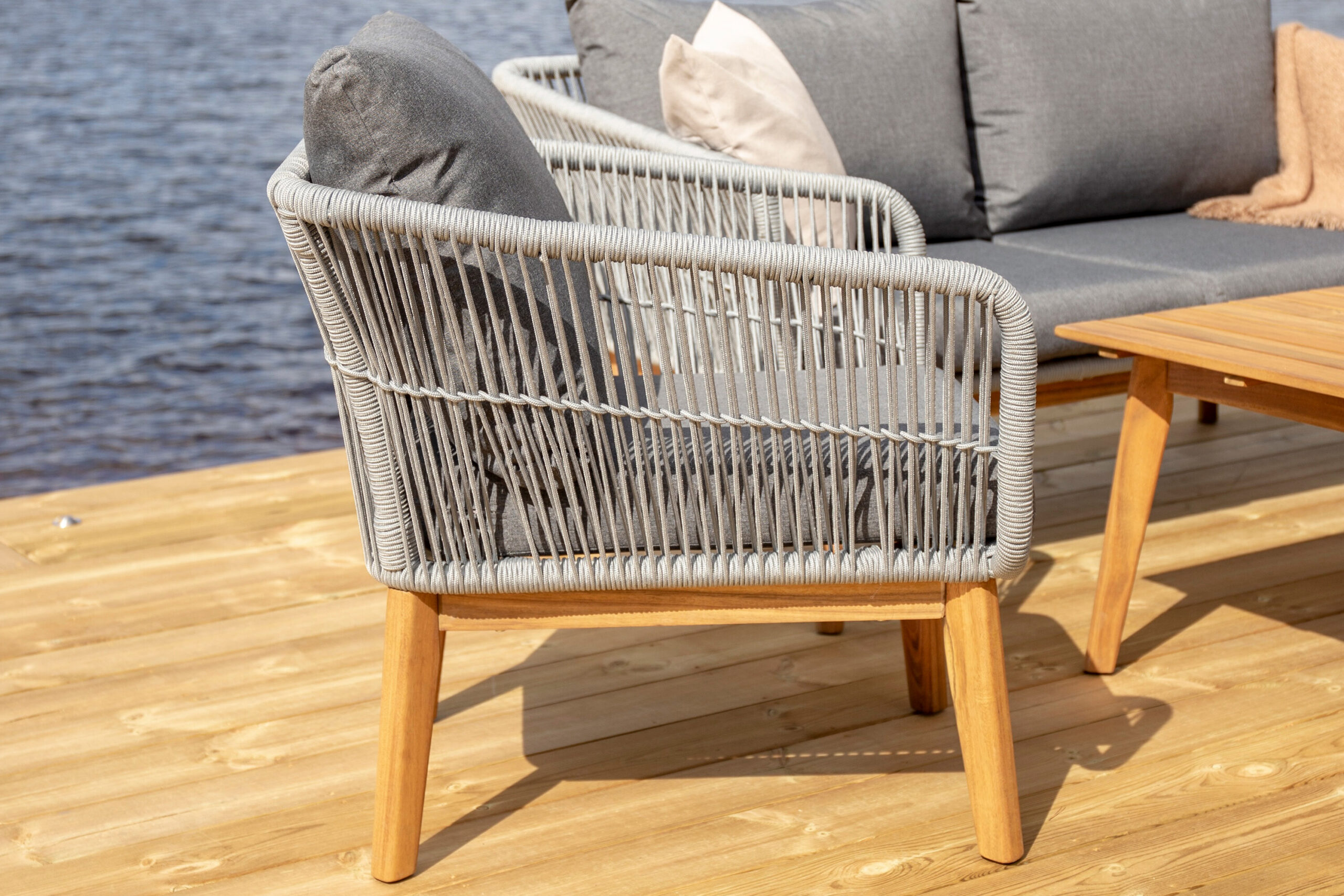Chania – trendikas diivanikomplekt, mis keskendub mugavusele ja pilkupüüdvale disainile. Komplekt koosneb kahekohalisest diivanist, kahest paksude vastupidavate tumehallide patjadega tugitoolist ja üleni kaunist akaatsiapuust valmistatud madalast diivanilauast. Diivanikomplektil on akaatsiast jalgadega alumiiniumraam, tagumine osa ja küljed on aga põimitud helehalli köiega, et tagada stiilne disain. Akaatsia detailid koos kohvilaua klassikalise kujuga loovad eksklusiivse ja ühtse välimuse.