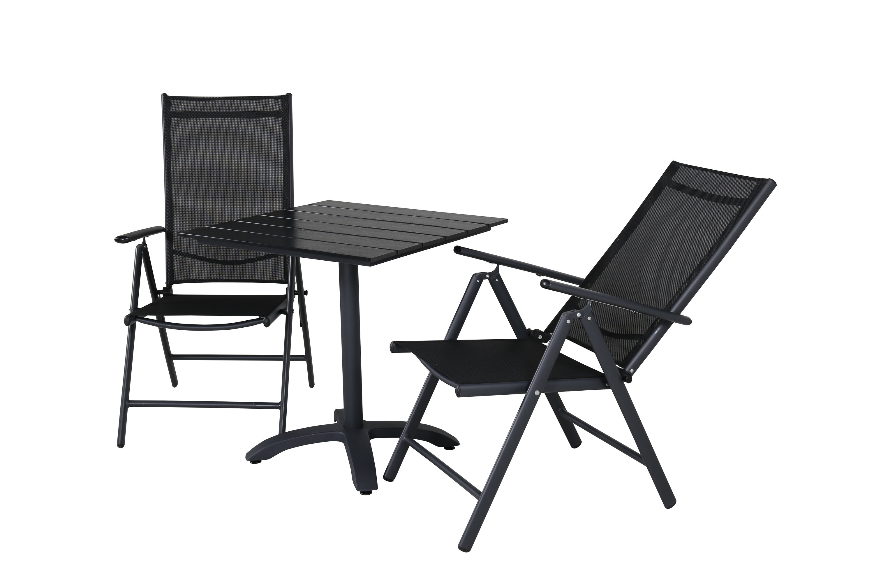 Väike, ilus ja kaasaegne elegantse musta värvi toidugrupp, mis sobib ideaalselt rõdule või rõdule! Söögilaua Colorado ja mugavate söögitoolide Break kombinatsioon annab hubase ja luksusliku ilme igal terrassil. Lauaplaat on mustast Aintwoodist ja veermik alumiiniumist ning toolid mustast tekstiilist ja alumiiniumist – vastupidavatest materjalidest, mis peavad vastu aega. Visake kohv ära ja nautige päikeselisi hetki!
