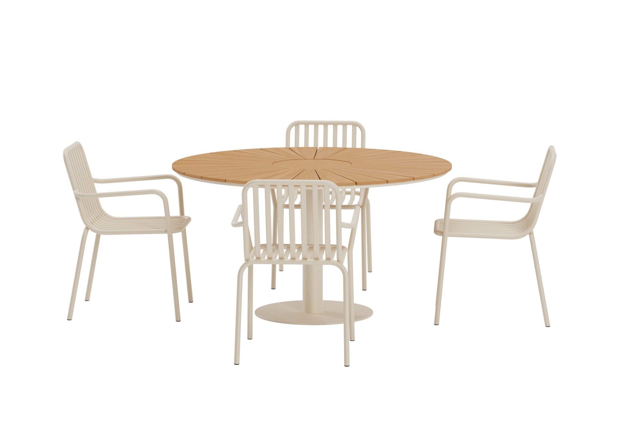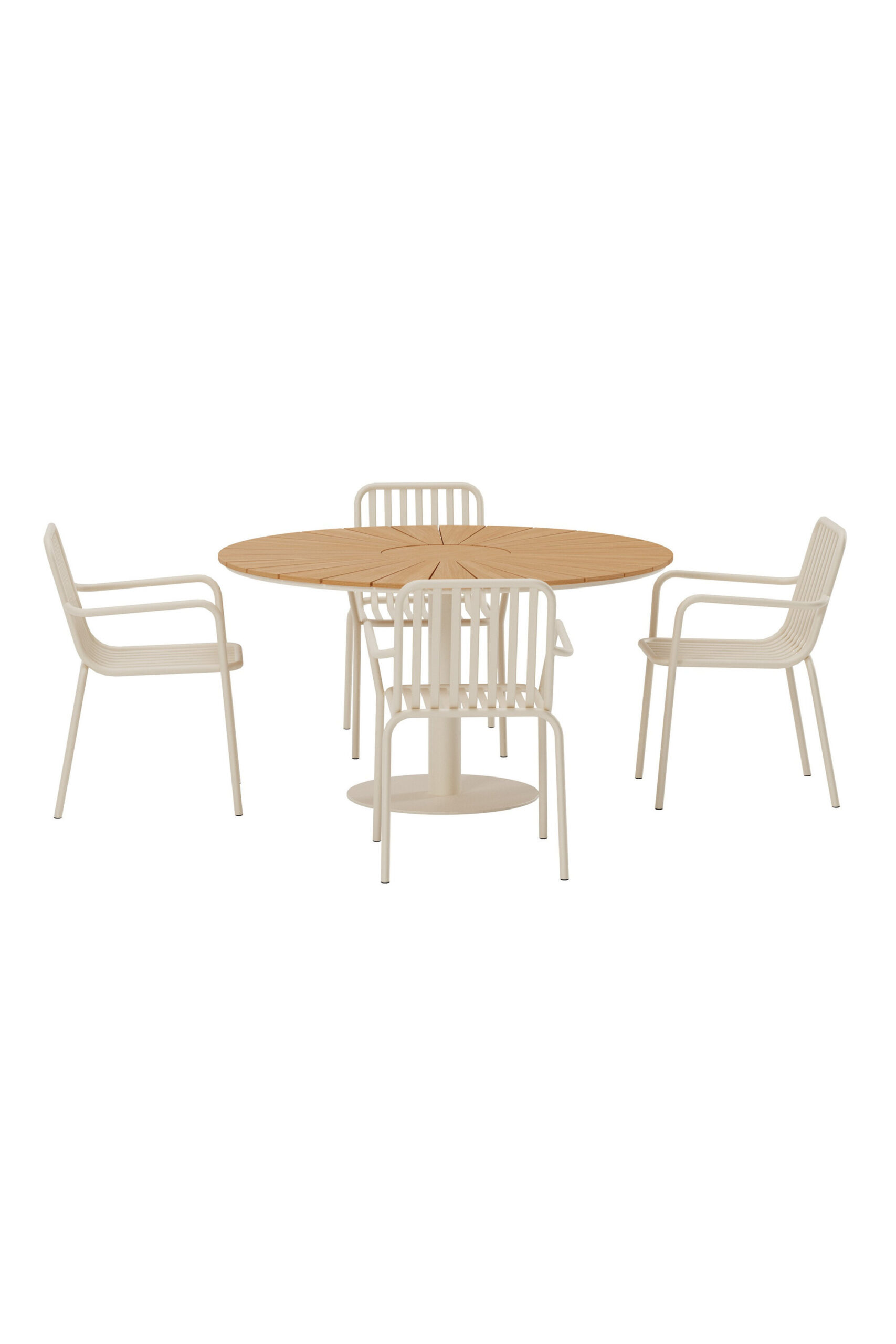 Selle stiilse Pekingi söögitoolide ja eksklusiivse Crofti söögilaua kombinatsiooniga looge elegantne ja kutsuv õuesöömisala. Pekingi söögitoolil on kaasaegne liistude disain ja soe beež värv, mis annab ajatu ja pehme ilme. See on valmistatud kergest alumiiniumist, varustatud integreeritud käetugedega ja on ka virnastatav – ideaalne nii mugavuseks kui ka mugavaks hoiustamiseks.