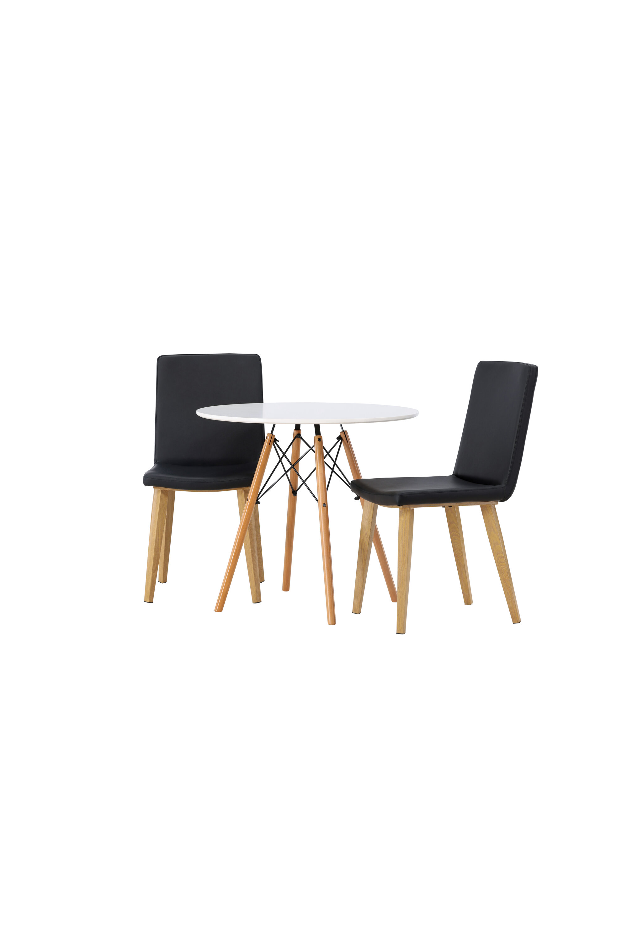 Ideaalne mustade värvide ja puitmaterjalide kokkusobivus! Ümmargune söögilaud Danburi on klassikalise disainiga, millel on valgest MDF-st ümmargune lauaplaat ja pöökpuidust kergelt laienevad jalad mustast terasest dekoratiivsete detailidega. Siin koos stiilsete mustade söögitoolidega sarjast Today. Toolil on põhjamaised sirged vormid ja üleni polsterdatud mustast kunstnahast iste. Naturaalsest puidust kergelt laienevad jalad jätavad ühtlase mulje. Siin istud mõnusalt kaua! Laua läbimõõt: 60 cm.