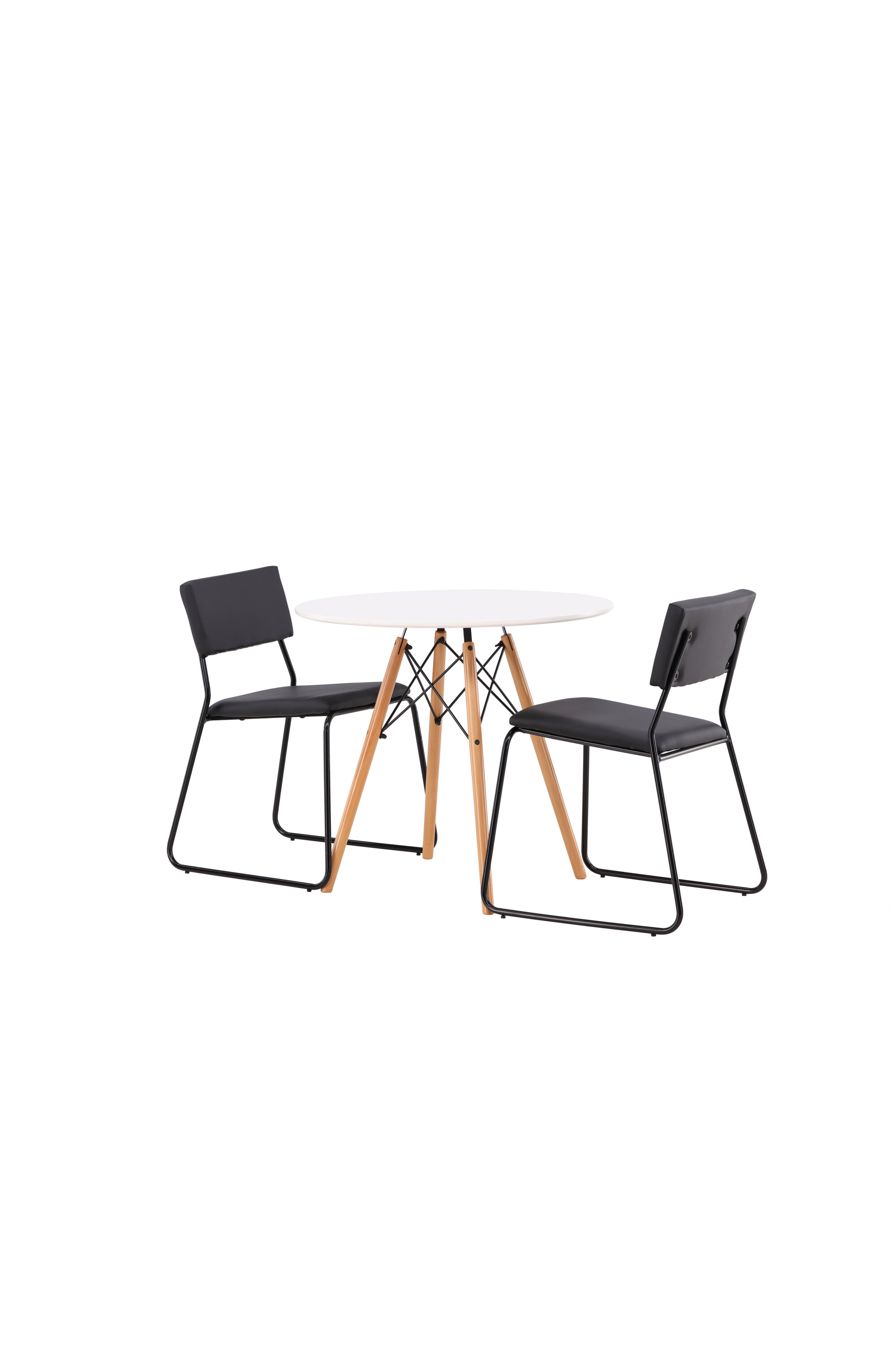 Ideaalne söögigrupp väikesesse kööki! Ümmargune söögilaud Danburi on klassikalise disainiga, millel on valgest MDF-st ümmargune lauaplaat ja pöökpuidust kergelt laienevad jalad mustast terasest dekoratiivsete detailidega. Siin koos meie mustade söögitoolidega sarjast Kenth. Minimalistlik kaasaegne disain loob õhulise tunde. Toolil on mustast polüuretaannahast ja polüestrist seljatugi ja iste ning dekoratiivsed kitsad rauast jalad. Vältige targa ja stiilse seltskonna vahel kompromisse! Laua läbimõõt: 60 cm.