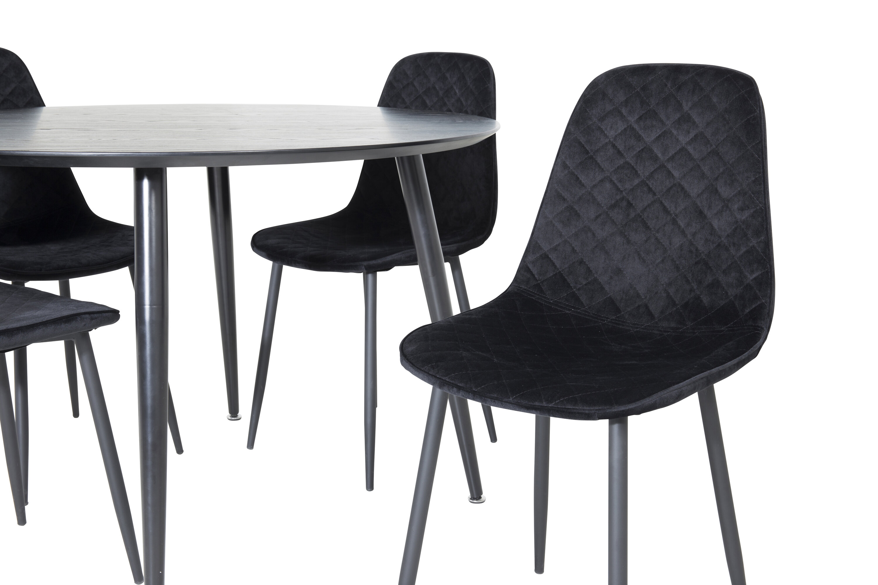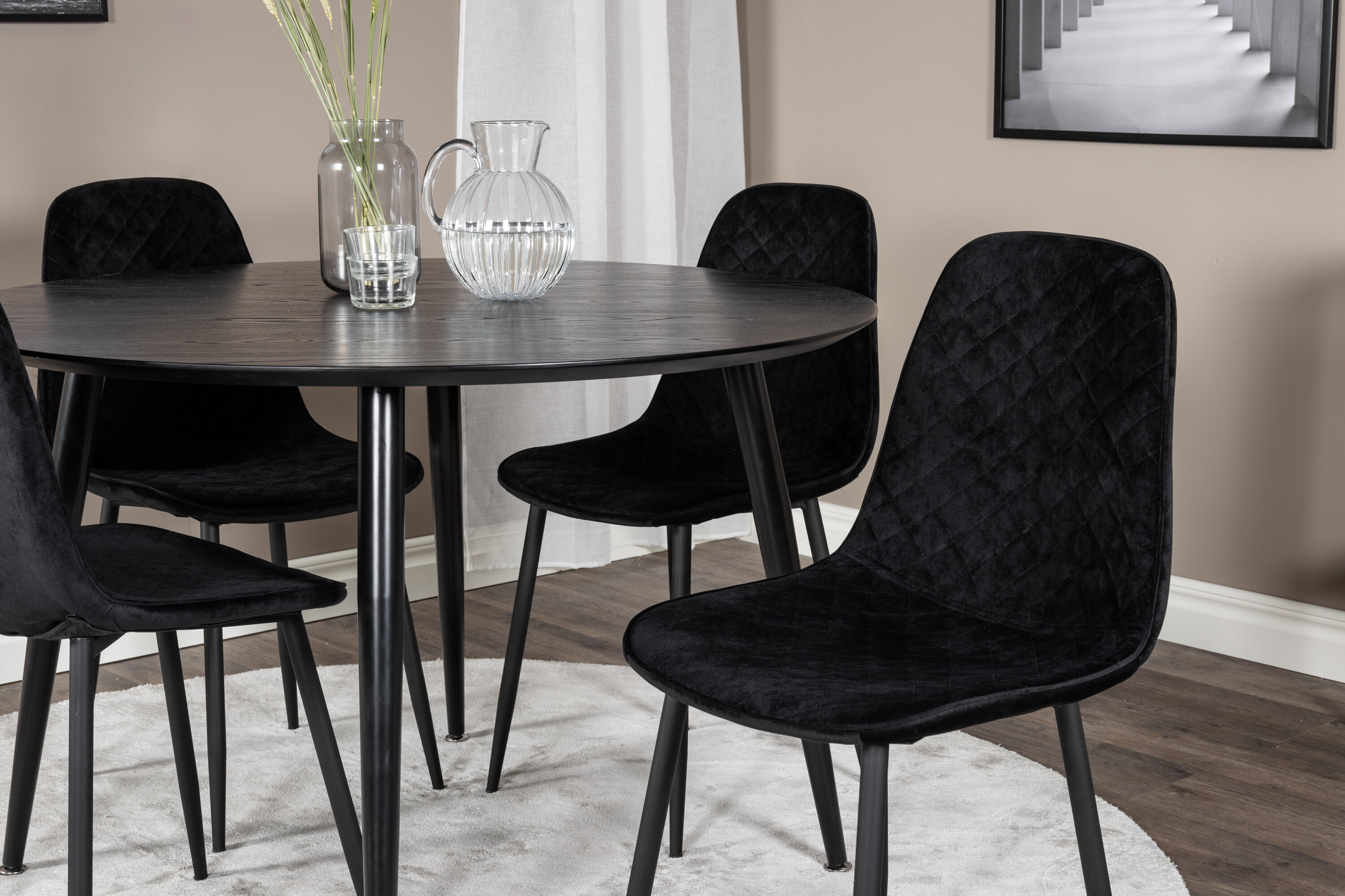 Dip, meie ümmargune elegantne söögilaud, siin koos meie maitsekate ja stiilsete Polari seeria musta samettoolidega. Moodne ja lihtne toidugrupp, mis maitselt sobib paljudele. Kutsu suhtlema ja lase kogu seltskonnal kaasa lüüa – ümmargused toidugrupid on turvaline kaart!