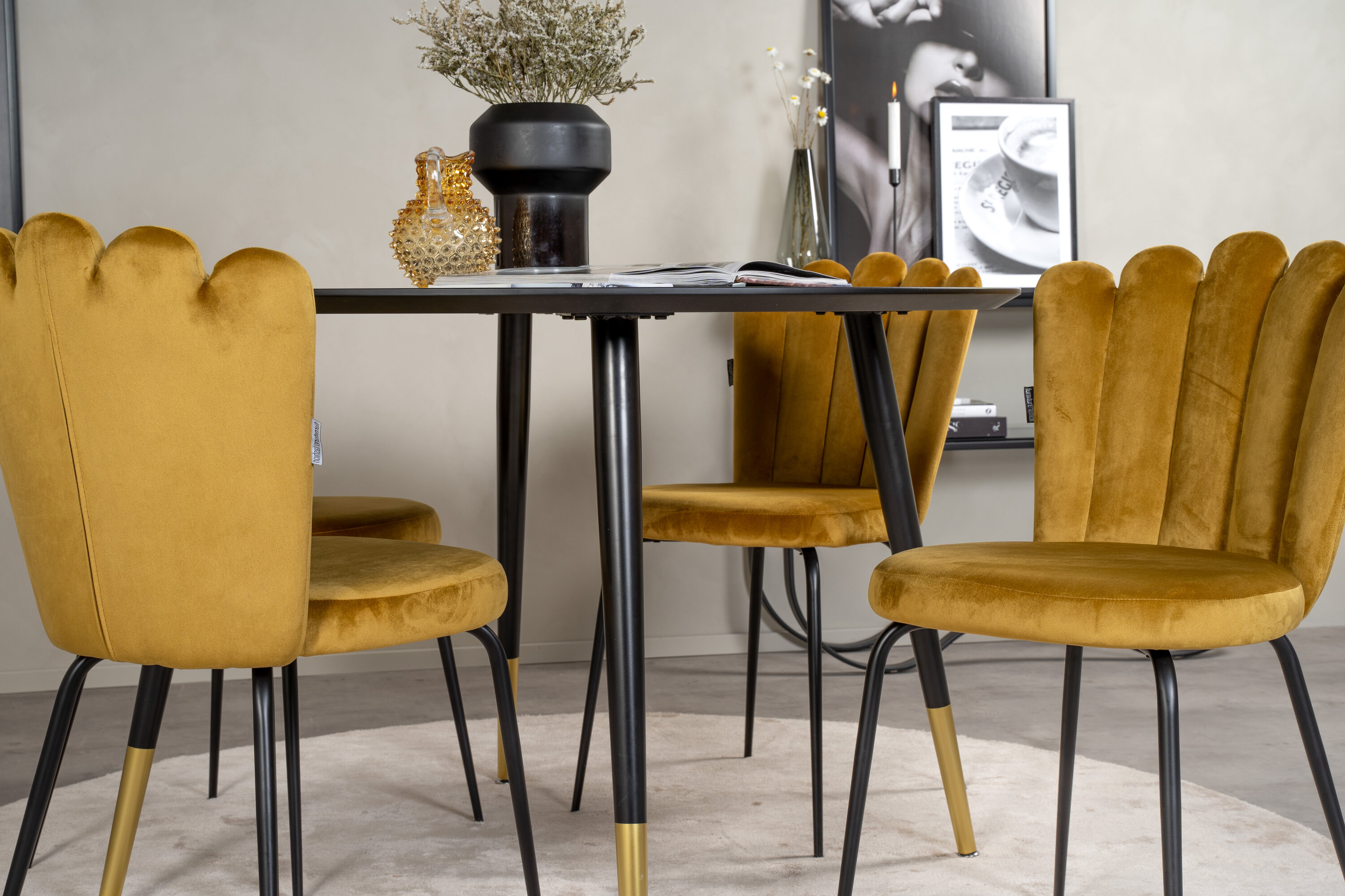 Erinevate värvide ja erinevate materjalide kombineerimine teeb kõik tavaliselt suurepäraselt. Stiilne söögilaud koos Limhamni seeria pehmete kuldsete samettoolidega loob modernse ja luksusliku tunde.
