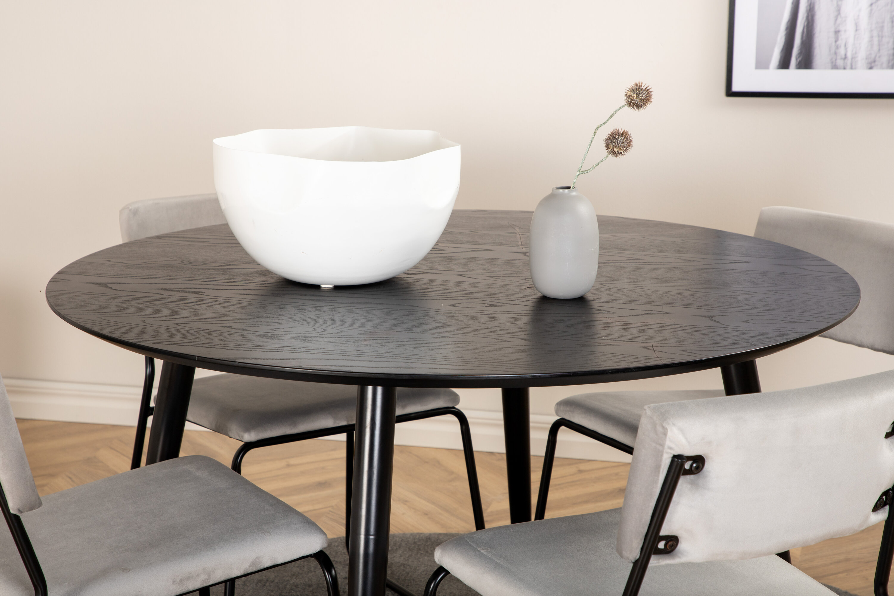 Saagu sellest kaunilt kokkusobivast tänapäevase tunnetusega toidugrupist loomulik kogunemispaik teie kodus. Söögilaua dips on läbimõeldud disainiga Skandinaavia kujunditega, mis annavad stiilse tunde, kergelt laienev metallist kont ja mustast MDF-ist lauaplaat. Siin koos Kenth sarja minimalistlike toolidega. Tooli jalad on stiilselt kitsad rauast ja iste helehallist sametist, mis annab ruumile kena läike. Toidugrupp, kus kõigil on õigus lihtsalt!