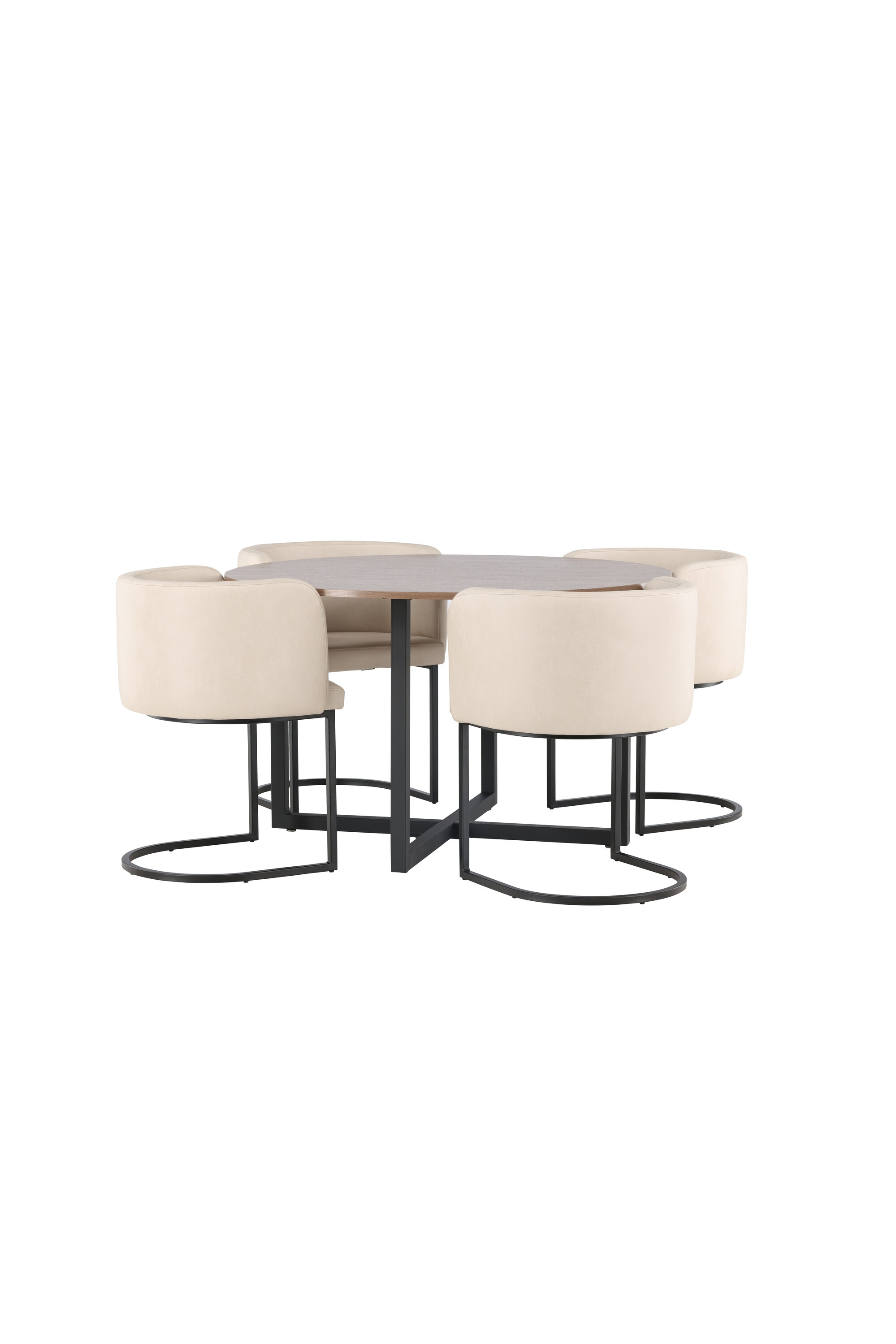 Kutsuvate vormide ja stiilse disainiga söögigrupp! Meie ümaral Durango söögilaual on pähklivärvi MDF-plaadist lauaplaat ja mustast terasest sirged lauajalad, mis kogunevad põrandale risti. Siin suurepärases kombinatsioonis meie luksuslike söögitoolidega Simrishamn. Toolil on täielikult polsterdatud iste, millel on ümar beežist TC-kangast seljatugi ja dekoratiivsed, minimalistlikud mustast terasest jalad. Loo suurejooneline ja elegantne pilgupüüdja! Laua mõõdud: 120 cm.