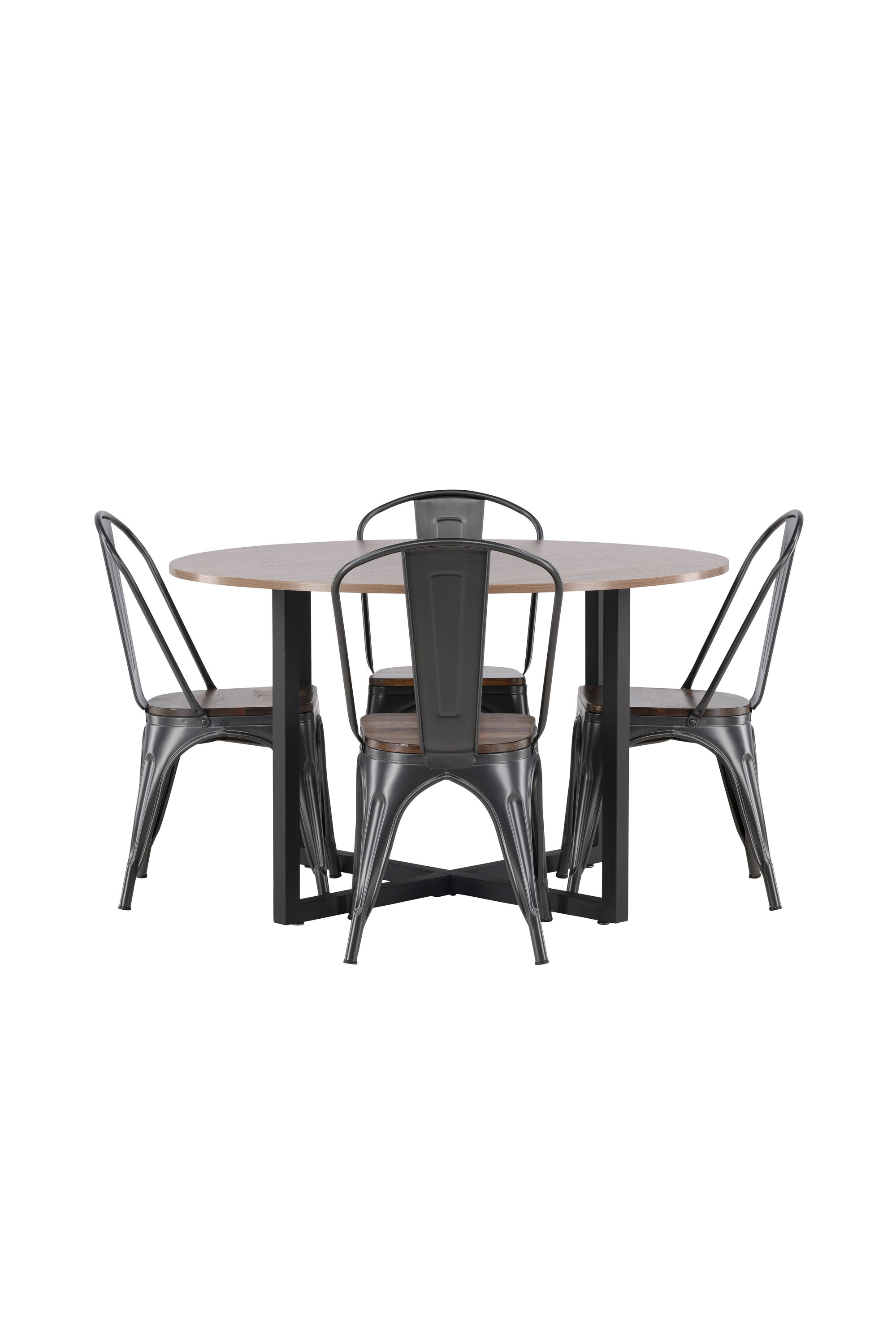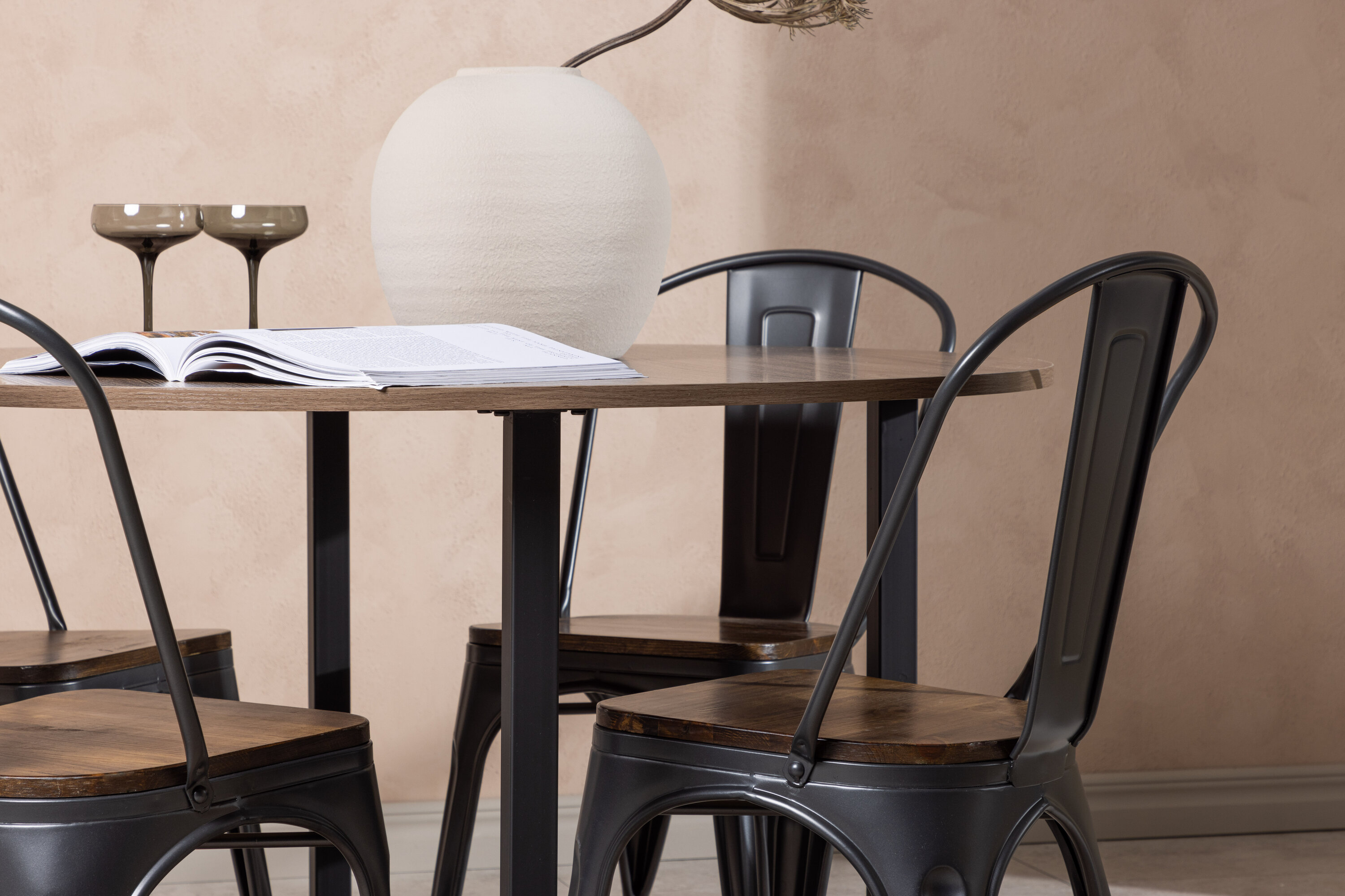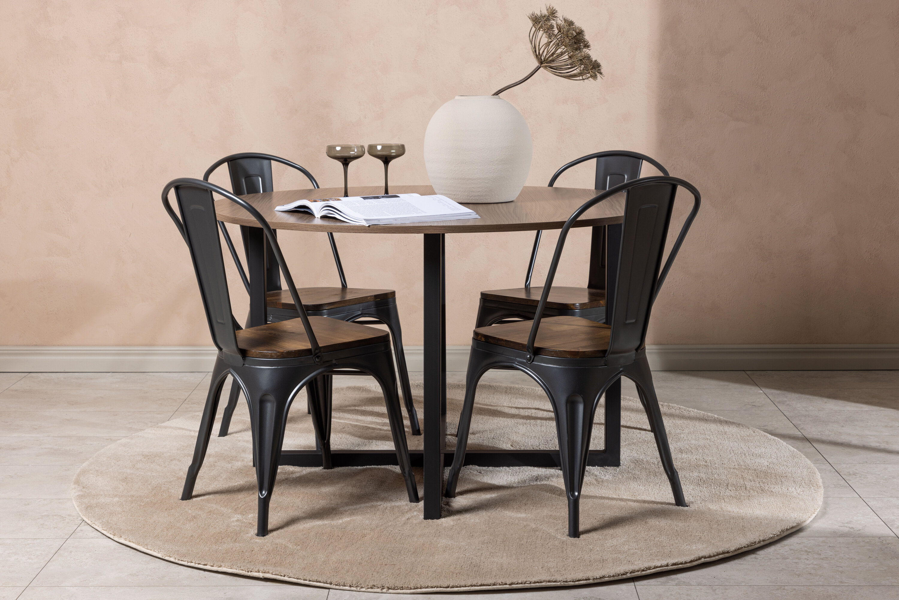 Pehmete vormidega trendikindel söögigrupp. Meie ümaral Durango söögilaual on pähklivärvi MDF-plaadist lauaplaat ja mustast terasest sirged lauajalad, mis kogunevad põrandale risti. Siin stiilses koosluses Tempe sarja trendikate toolidega. Toolil on klassikaline maalähedane tool, mille jalad on tumehallist terasest ja iste on tumedast puidust. See on stiilne ja luksuslik! Laua mõõdud: 120 cm.
