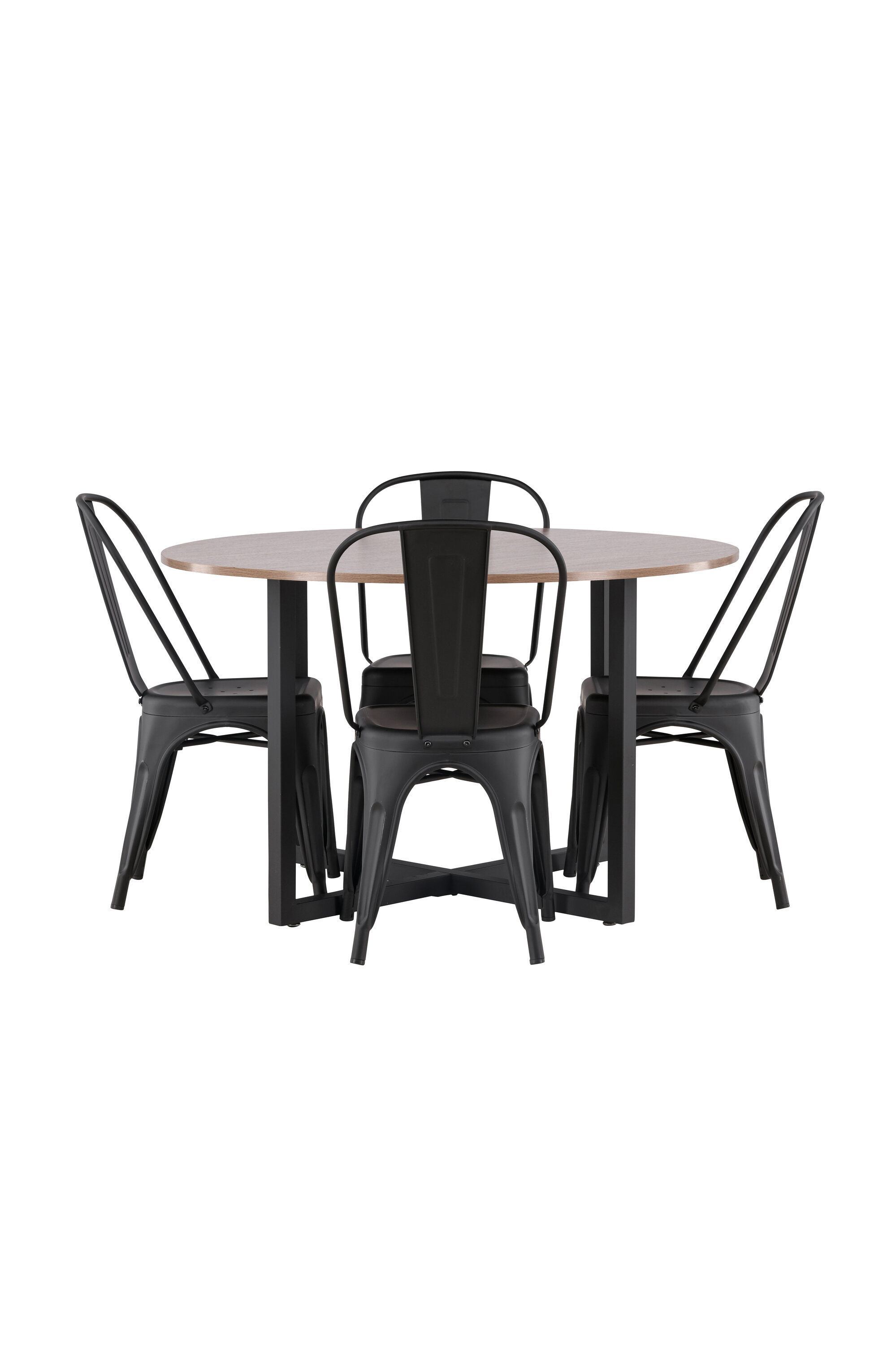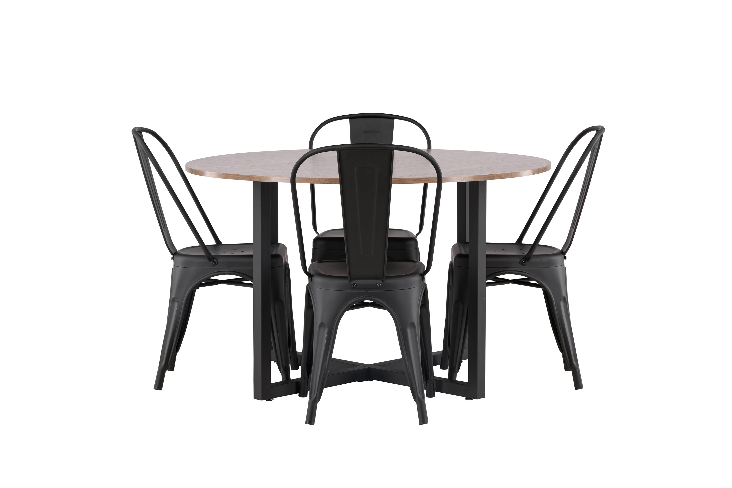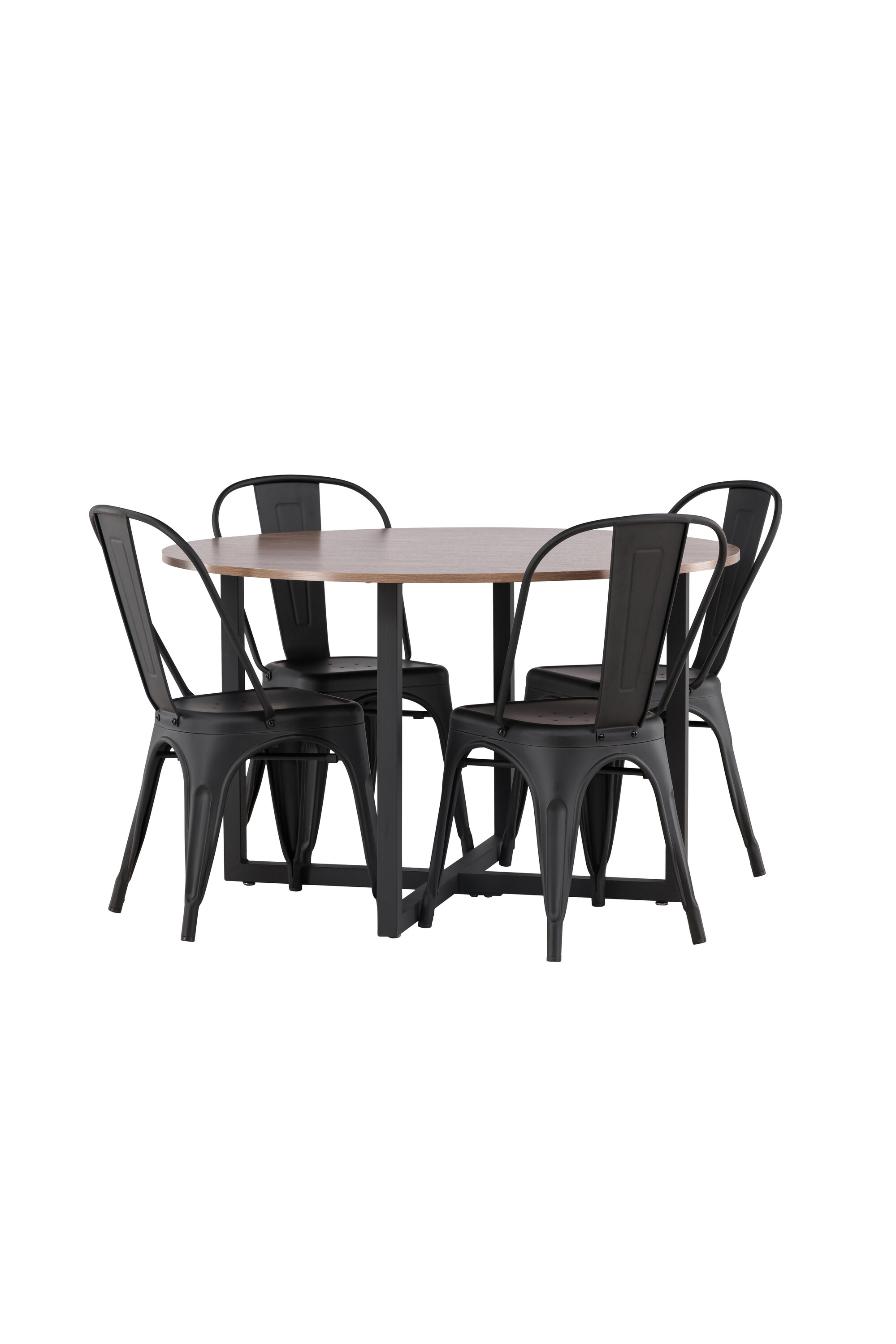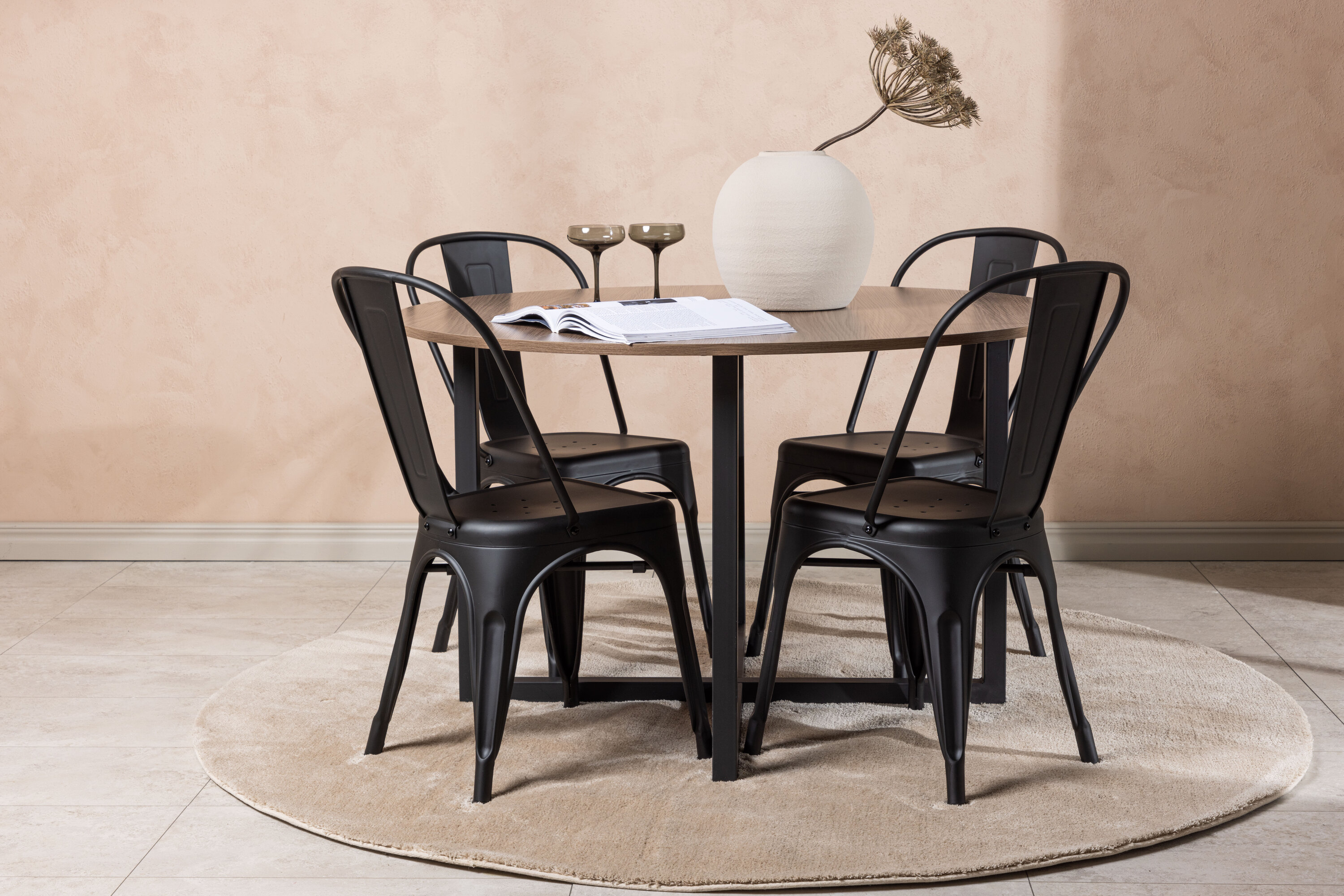 Kombineeri maalähedasi värve trendikate vormidega! Meie ümaral Durango söögilaual on pähklivärvi MDF-plaadist lauaplaat ja mustast terasest sirged lauajalad, mis kogunevad põrandale risti. Siin koos meie Tempe sarja mustade söögitoolidega. Tooli kergelt laienevad jalad, mis sujuvalt istme ja seljatoega kokku puutuvad stiilse disainiga, ühtlaselt mustast metallist. Sisusta kodu süda kutsuvalt! Laua mõõdud: 120 cm.