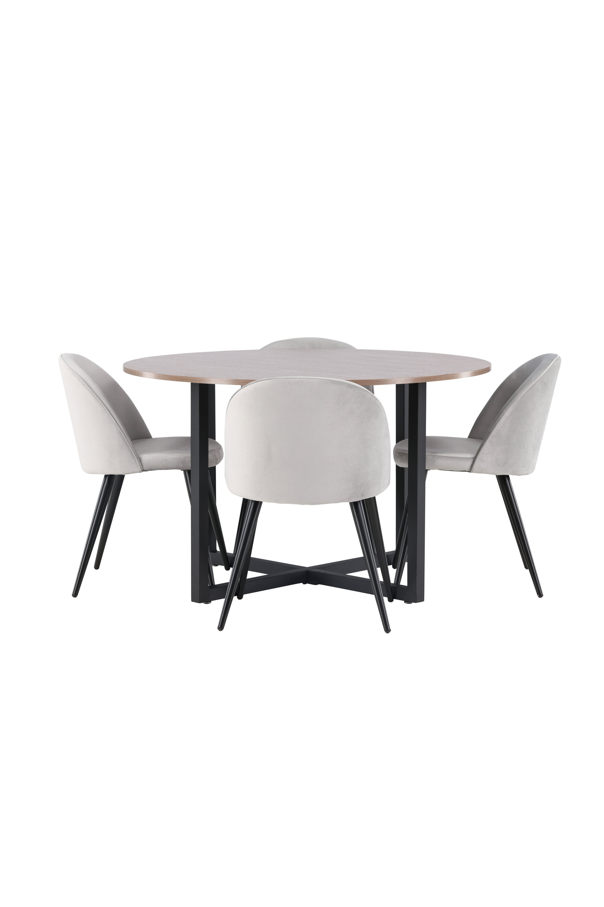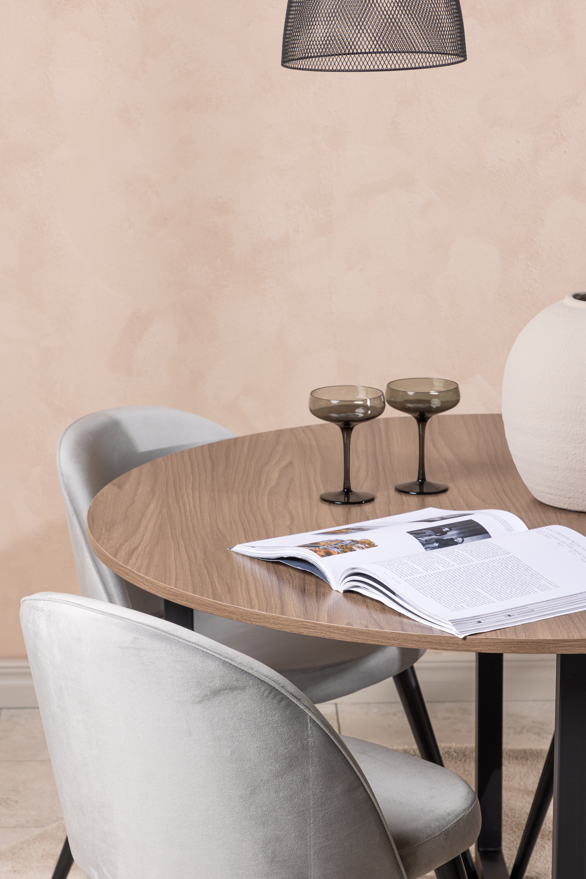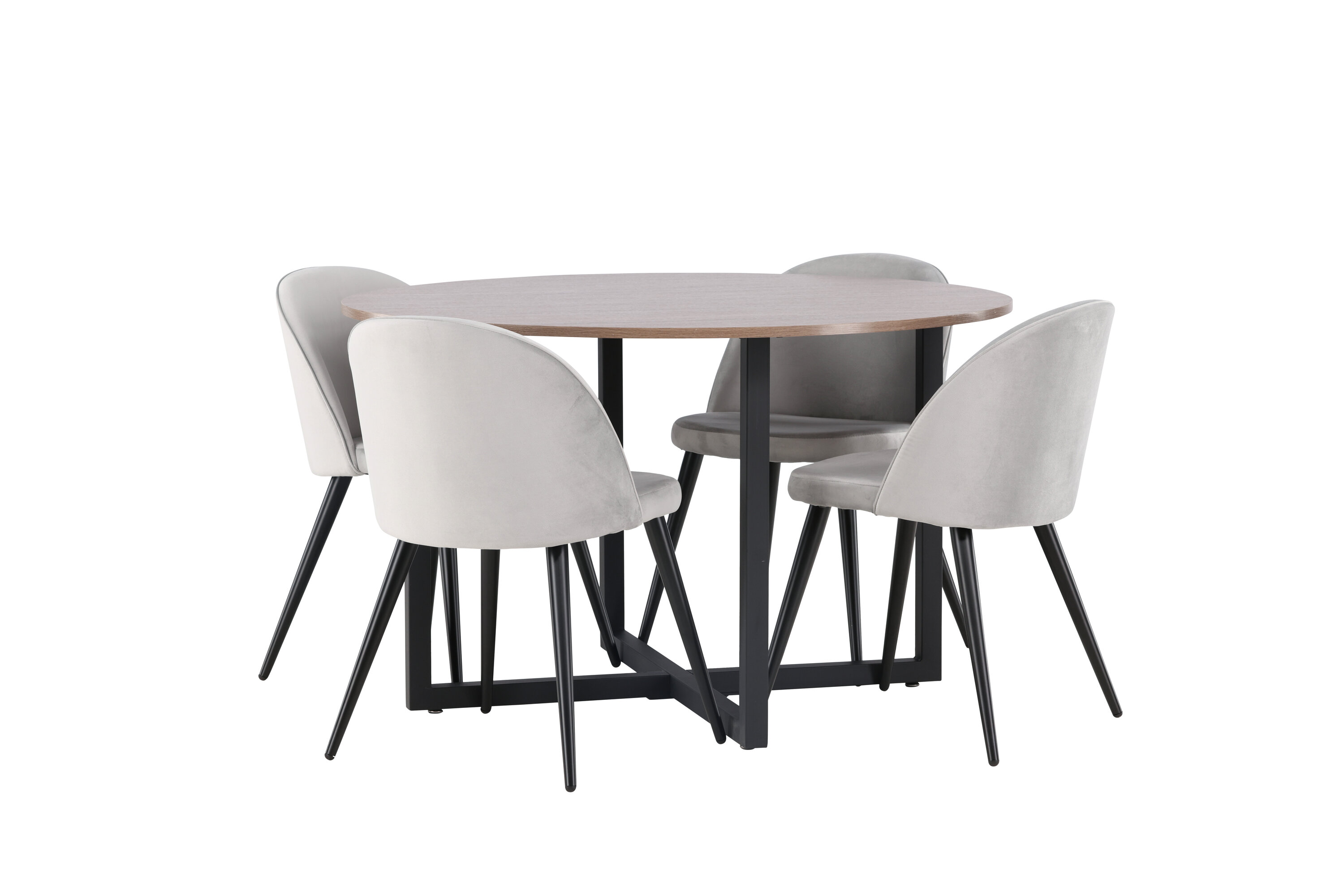 Särav ja värske – siin ühendame meeldivad värvid ja vastupidavad materjalid! Meie ümaral söögilaual Durango on pähklivärvi MDF-plaadist lauaplaat ja mustast terasest sirged lauajalad, mis kogunevad põrandale risti. Siin on täiuslik kombinatsioon meie Velvet sarja hallide söögitoolidega. Toolil on täielikult polsterdatud disain, jalad mustast pulbervärvitud metallist ning ümar seljatugi ja iste hallist sametkangast ja pehme polstriga. Istu mugavalt ja sisusta nutikalt! Laua mõõdud: 120 cm.
