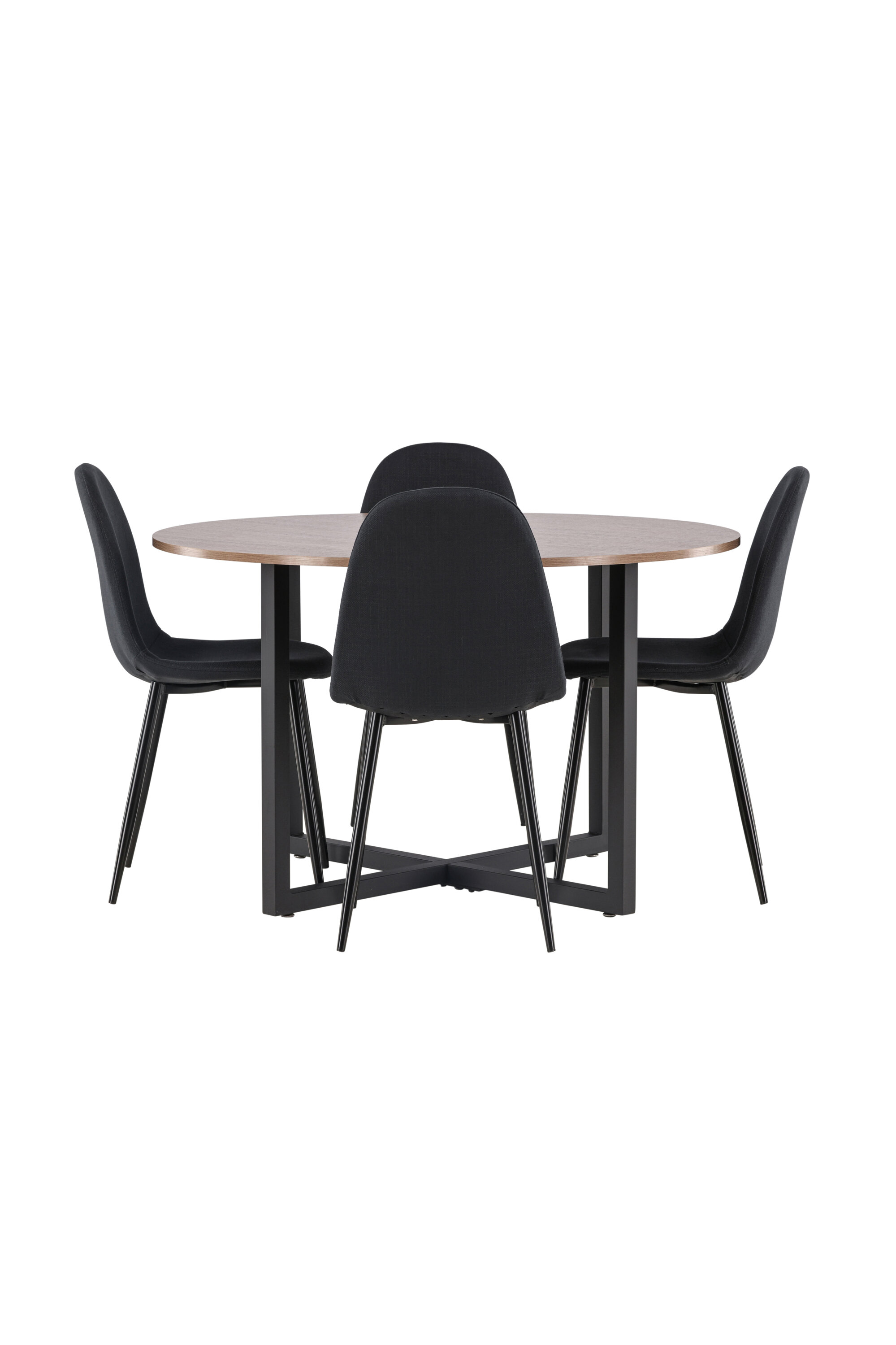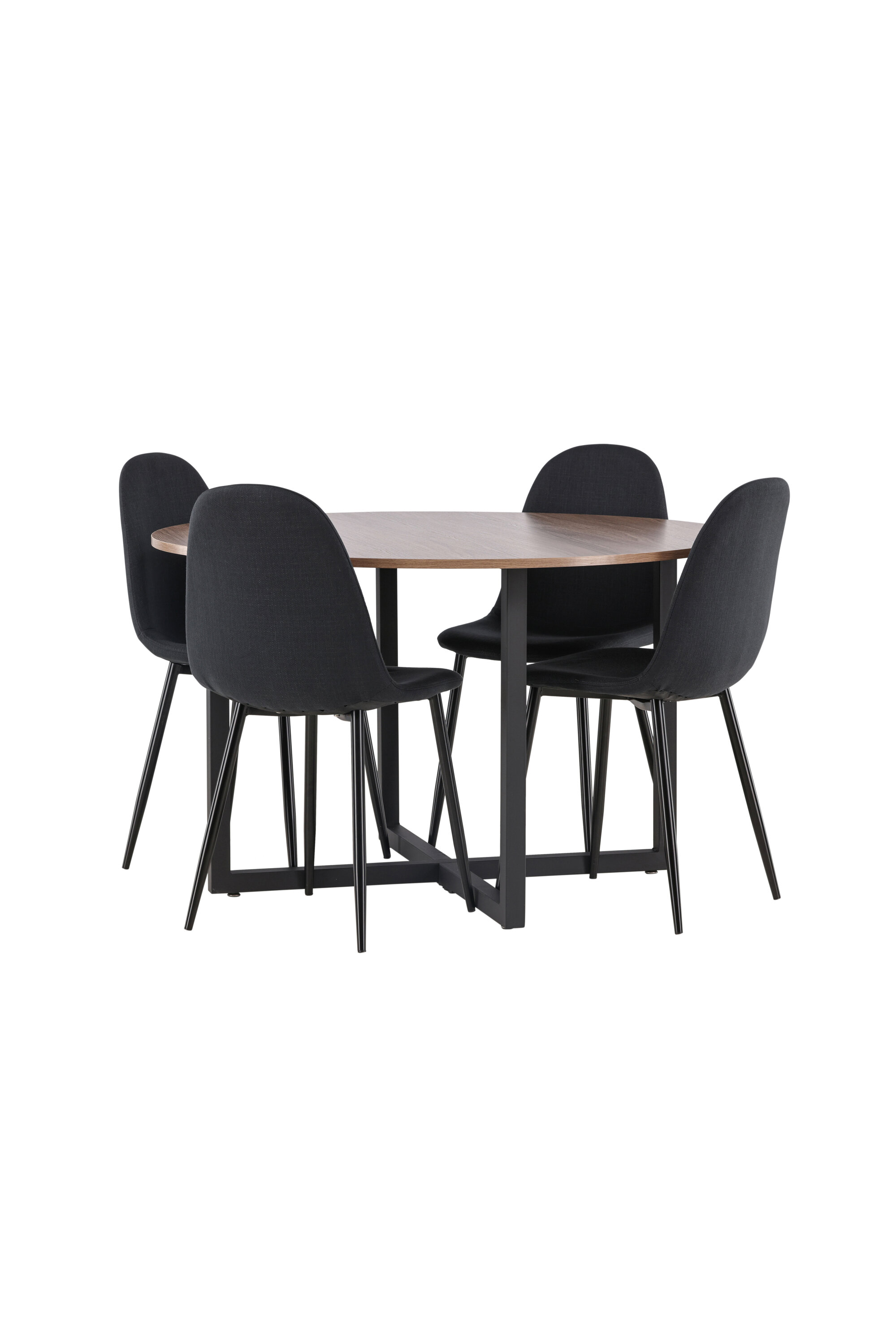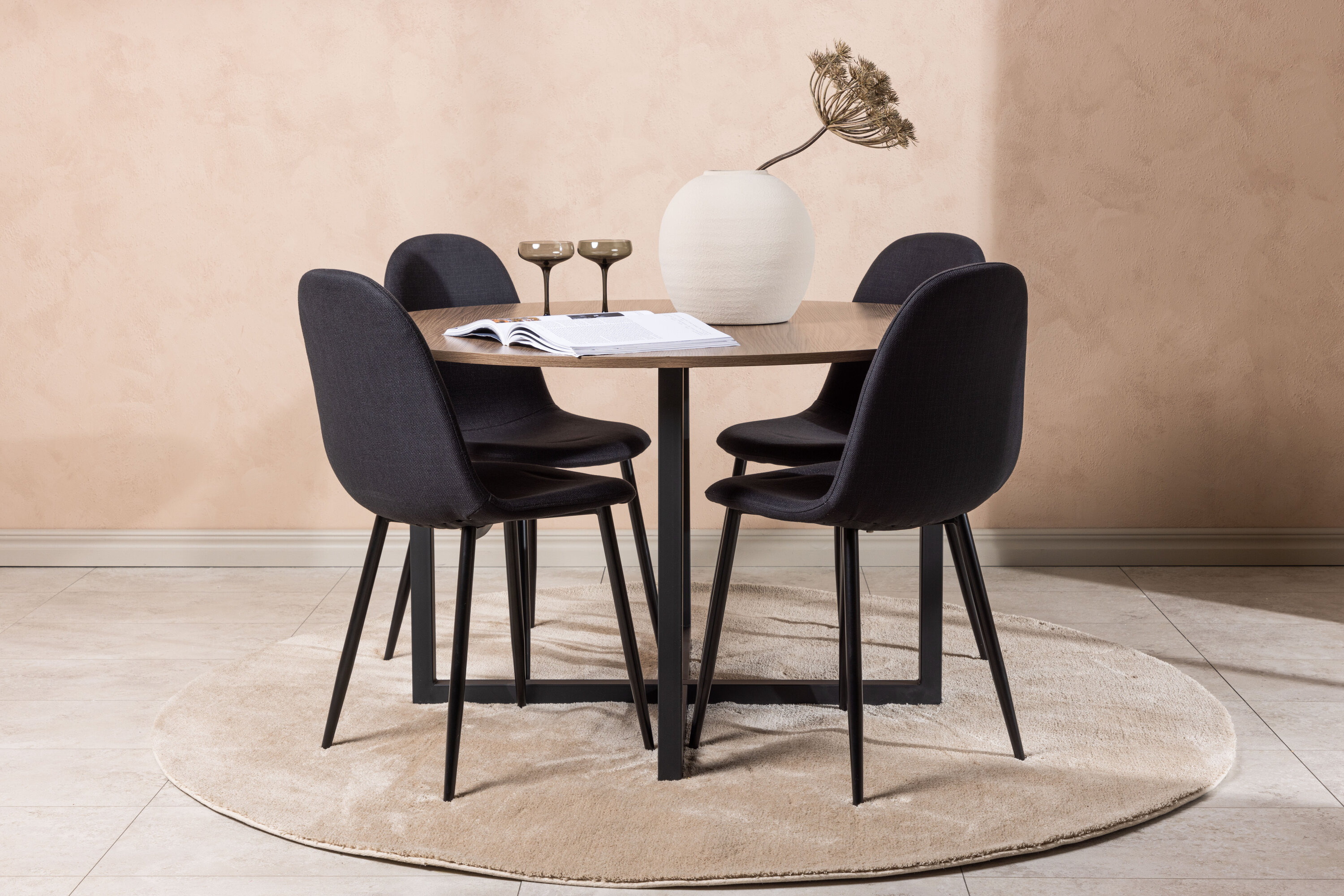 Trendikate detailidega must söögigrupp! Meie ümaral söögilaual Durango on pähklivärvi MDF-plaadist lauaplaat ja mustast terasest sirged lauajalad, mis kogunevad põrandale risti. Siin on laud kombineeritud Polari sarja mustade söögitoolidega. Toolil on ümar disain ja klassikaline disain – nii praktiline kui ka ajatu. Seljatugi ja iste on polsterdatud musta polüesterkangaga ning jalad musta pulbervärvitud metalliga. Siit saate ajatu söögigrupi! Laua mõõdud: 120 cm.