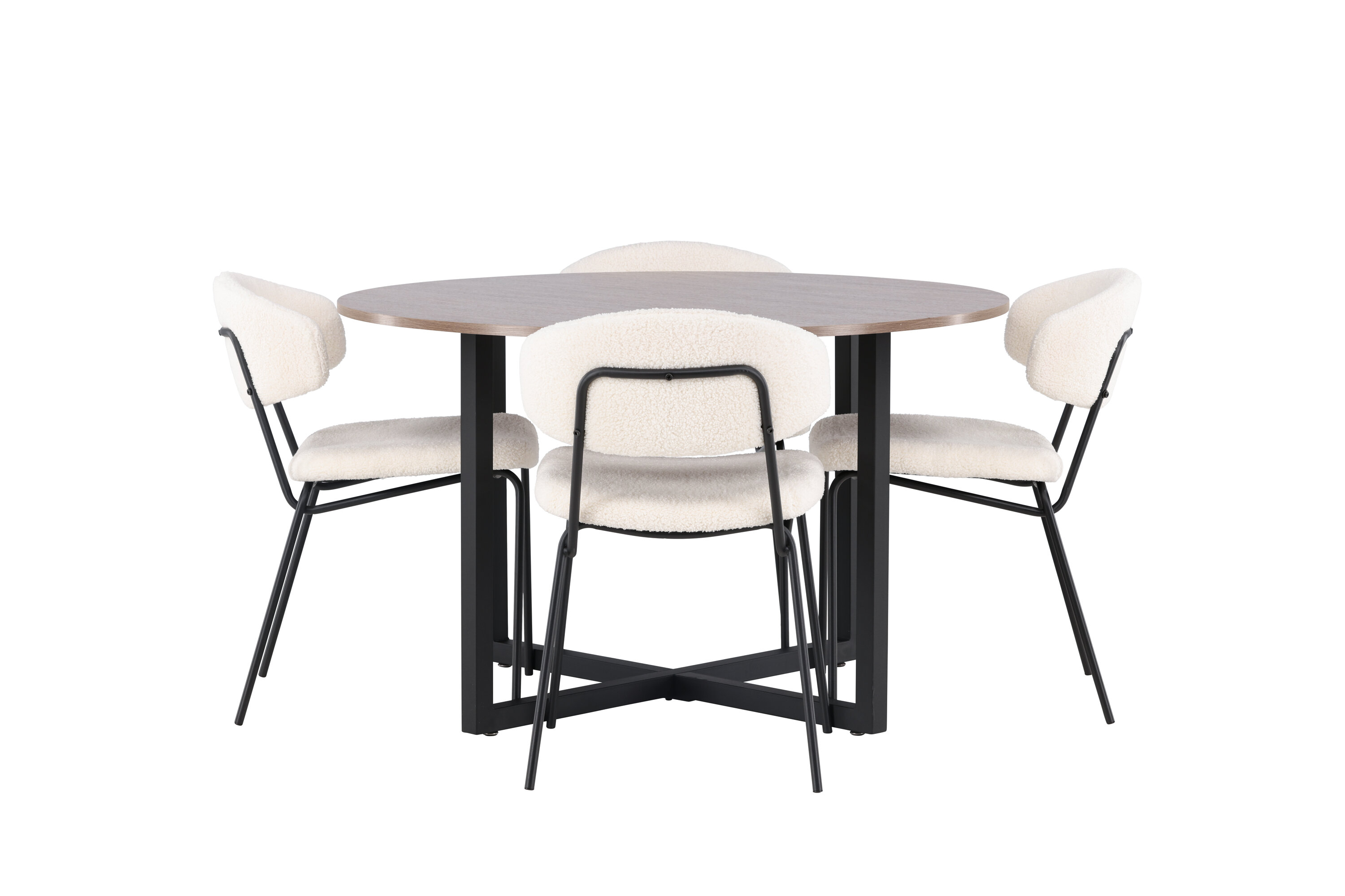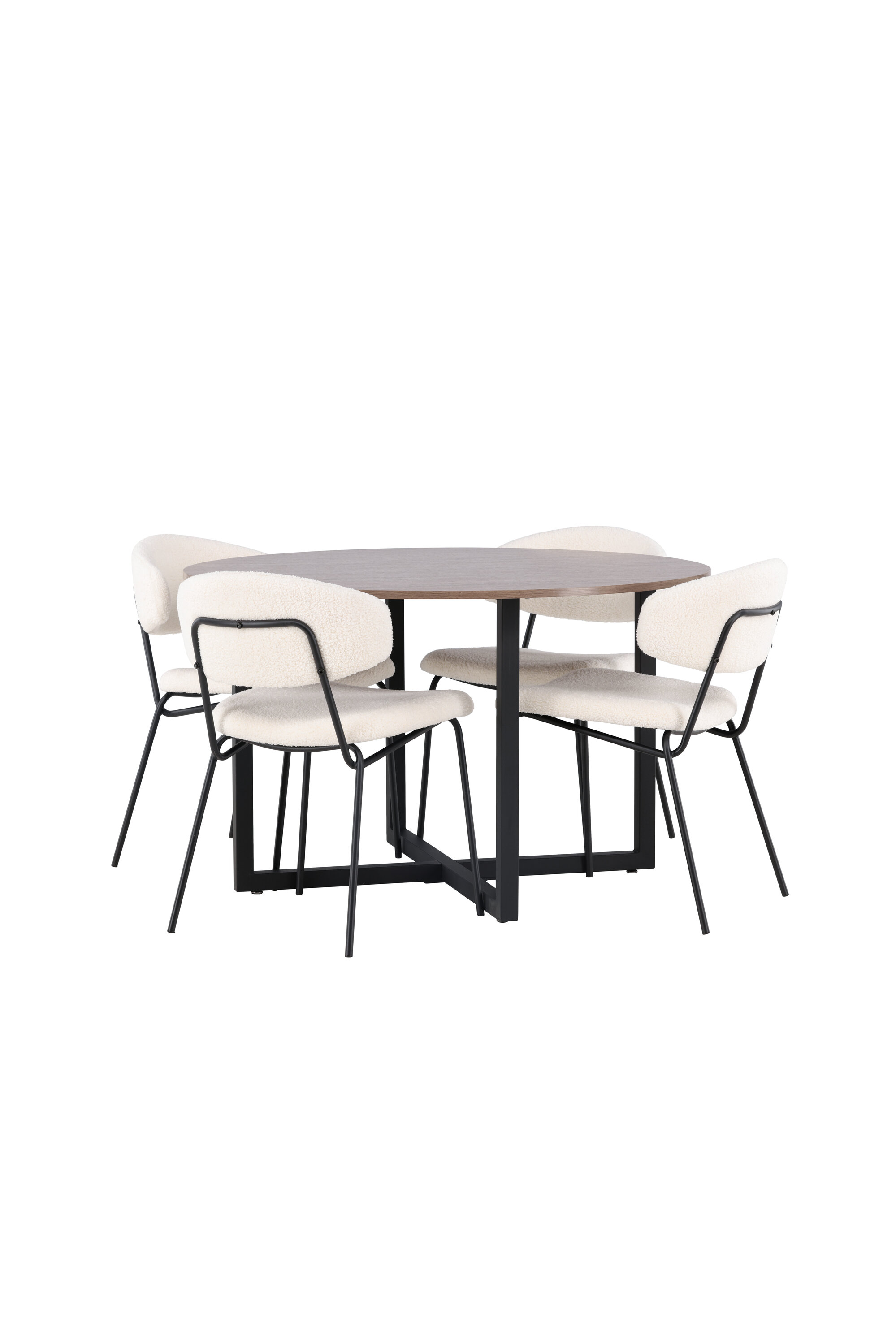 Võluv pehmete vormidega söögigrupp! Meie ümaral söögilaual Durango on pähklivärvi MDF-plaadist lauaplaat ja mustast terasest sirged lauajalad, mis kogunevad põrandale risti. Siin koos meie imeliste valgete söögitoolidega Chico sarjast. Tool on valgest boucle kangast, polsterdatud istme ja seljatoega lisamugavuse tagamiseks. Jalad on kitsad mustast terasest, mis annab toolile õhulise tunde. Loo moodne sooja tundega pilgupüüdja! Laua mõõdud: 120 cm.