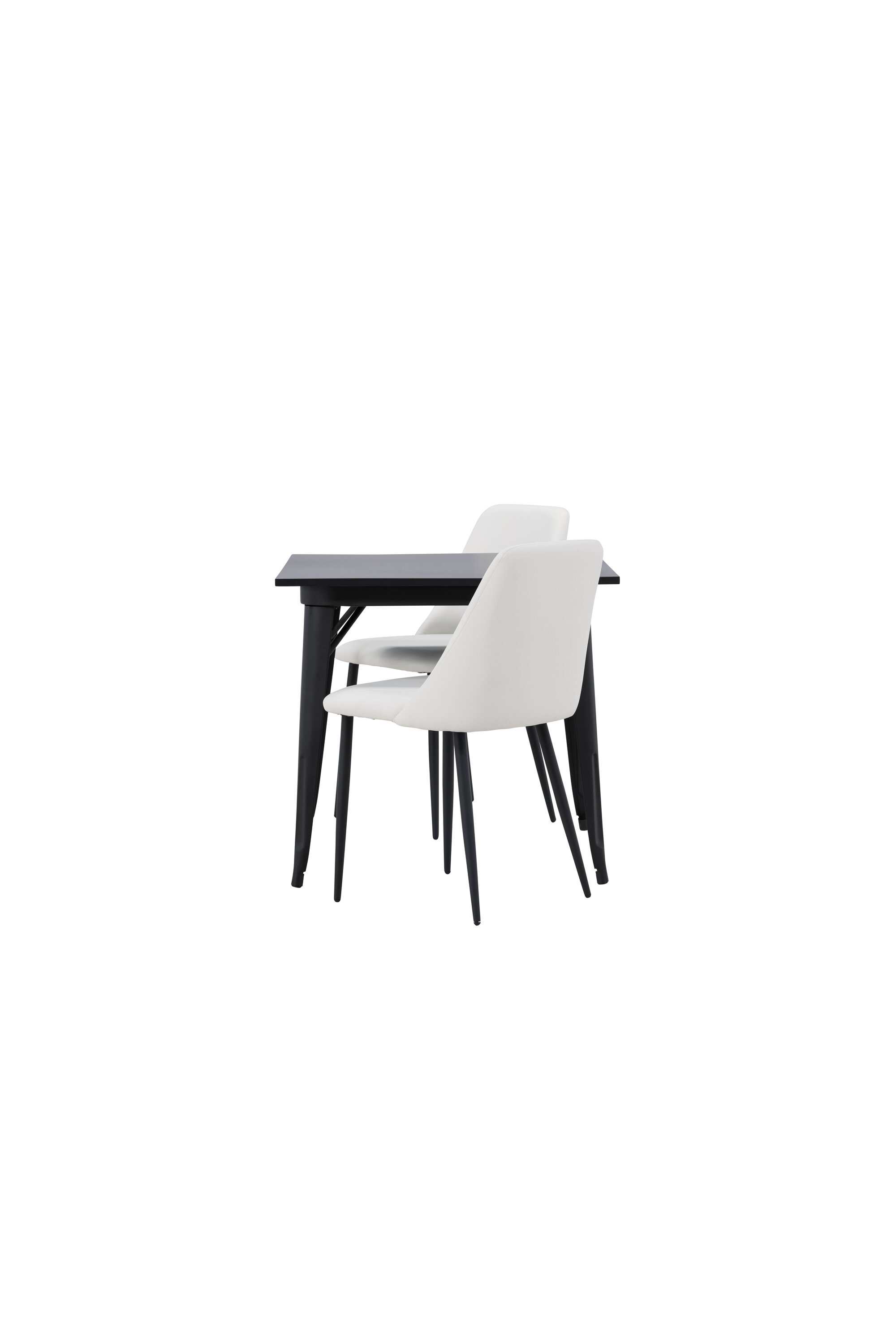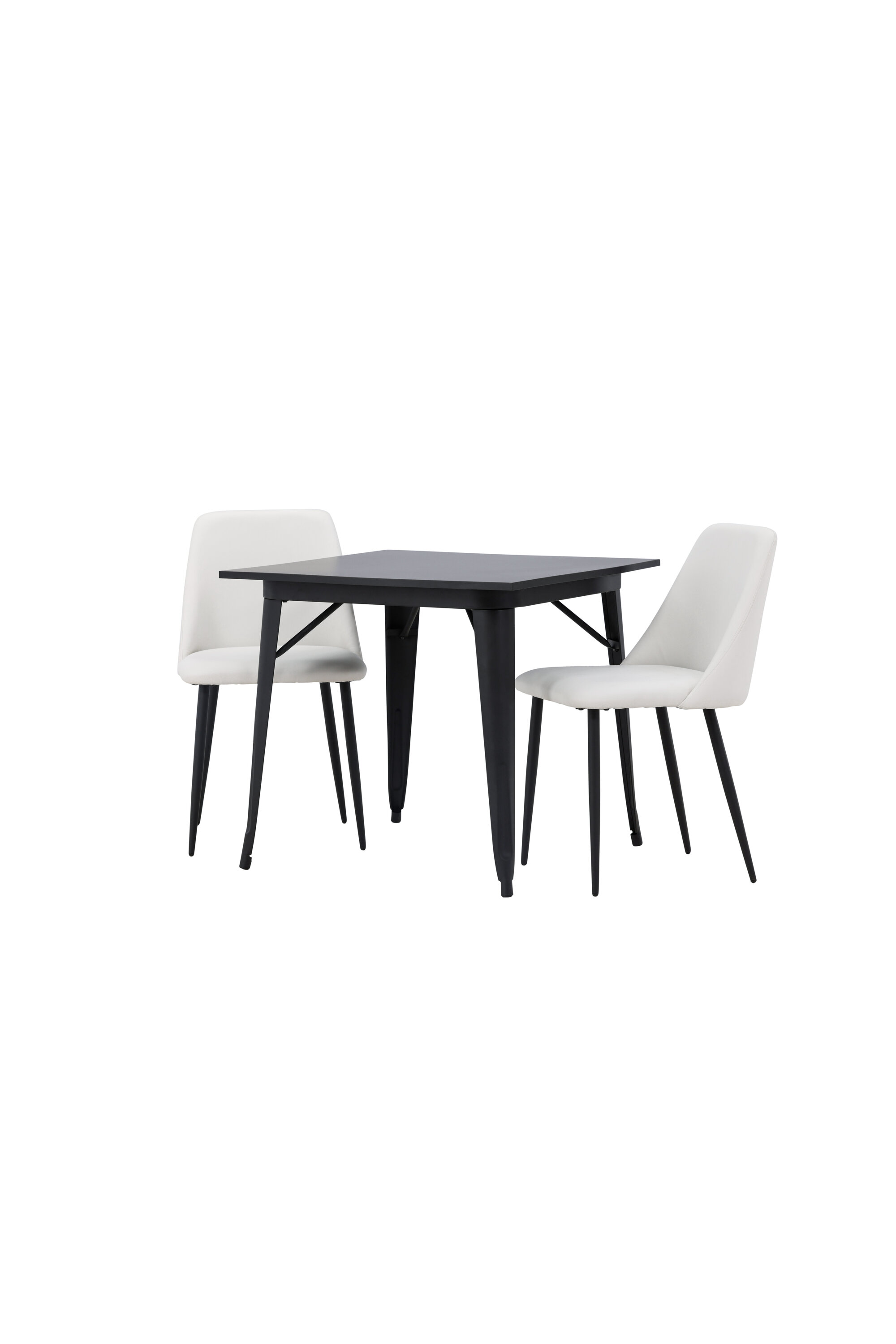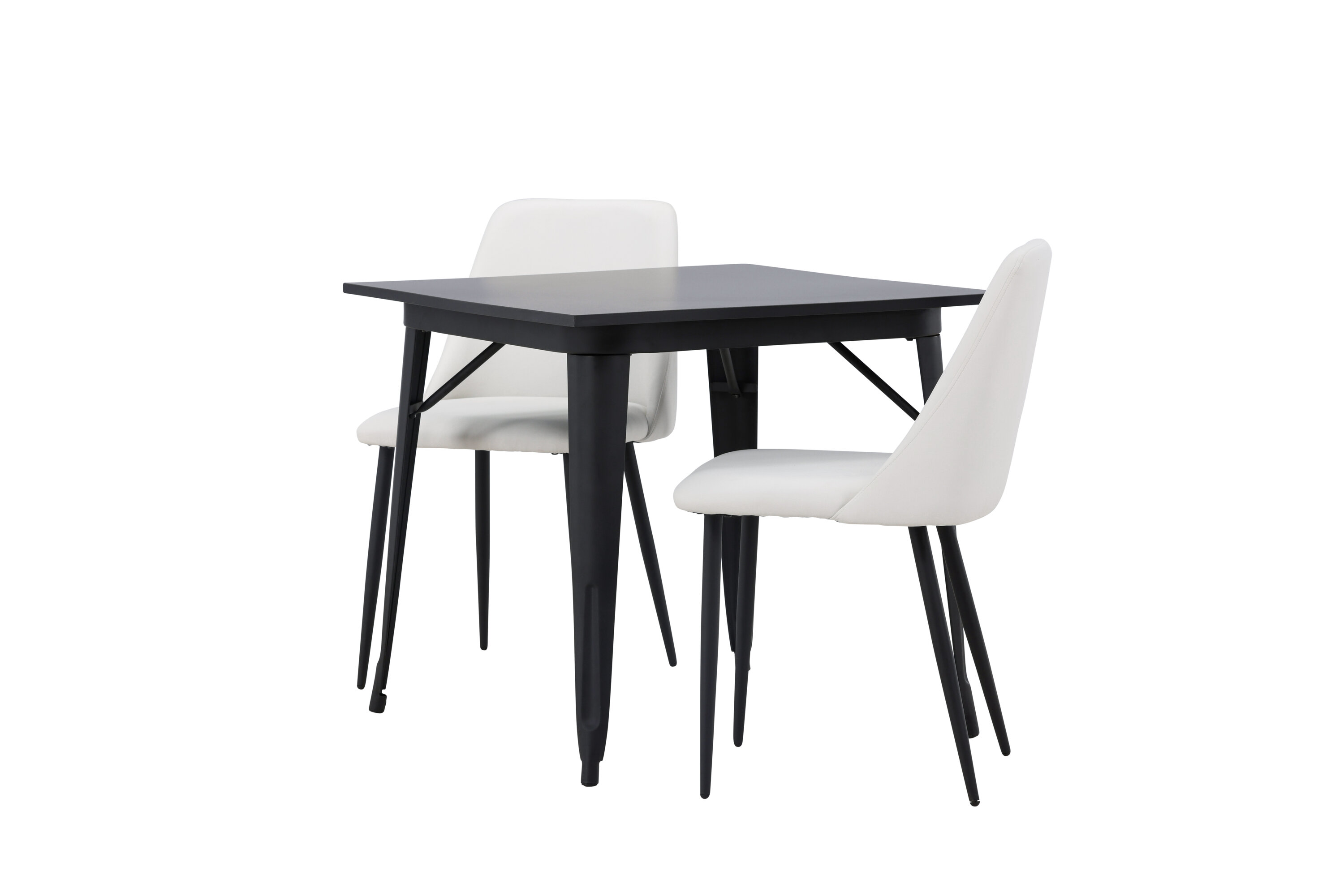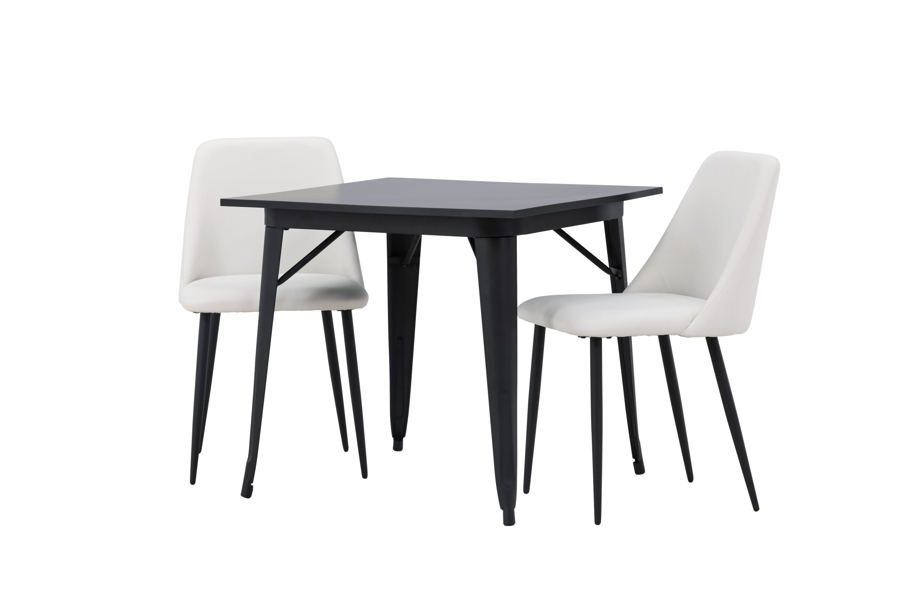Võluv söögigrupp kahele! Meie kandiline söögilaud Tempe on kena suuruse ja trendika skandinaavialiku disainiga. Valmistatud mustast MDF-ist lauaplaadiga ja mustast metallist lauajalad. Siin stiilses kombinatsioonis valgete söögitoolidega sarjast Night. Toolil on täielikult polsterdatud valgest polüuretaanist iste, mis tundub sama luksuslik kui elegantne, ja jalad on mustast terasest. Iste on täiendava mugavuse tagamiseks polsterdatud. Siit saate täiusliku kombinatsiooni! Laua mõõdud: 80x80cm.
