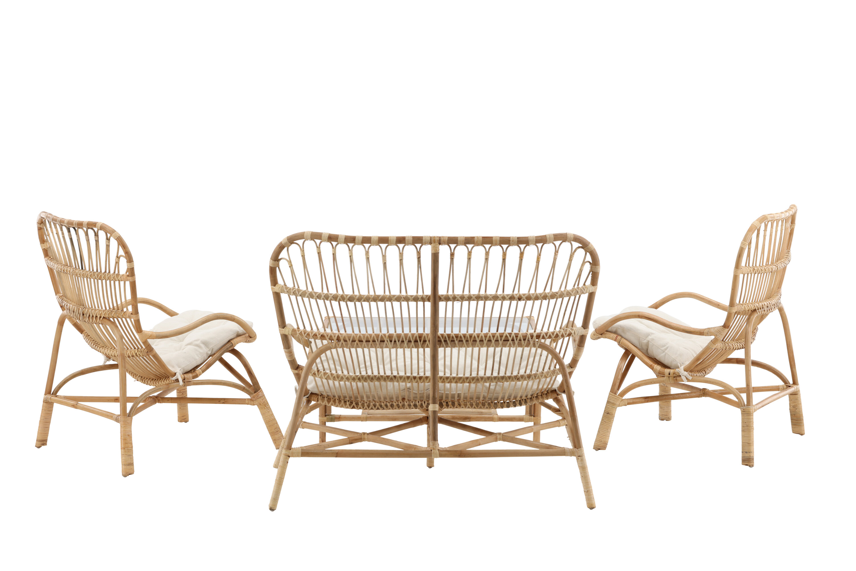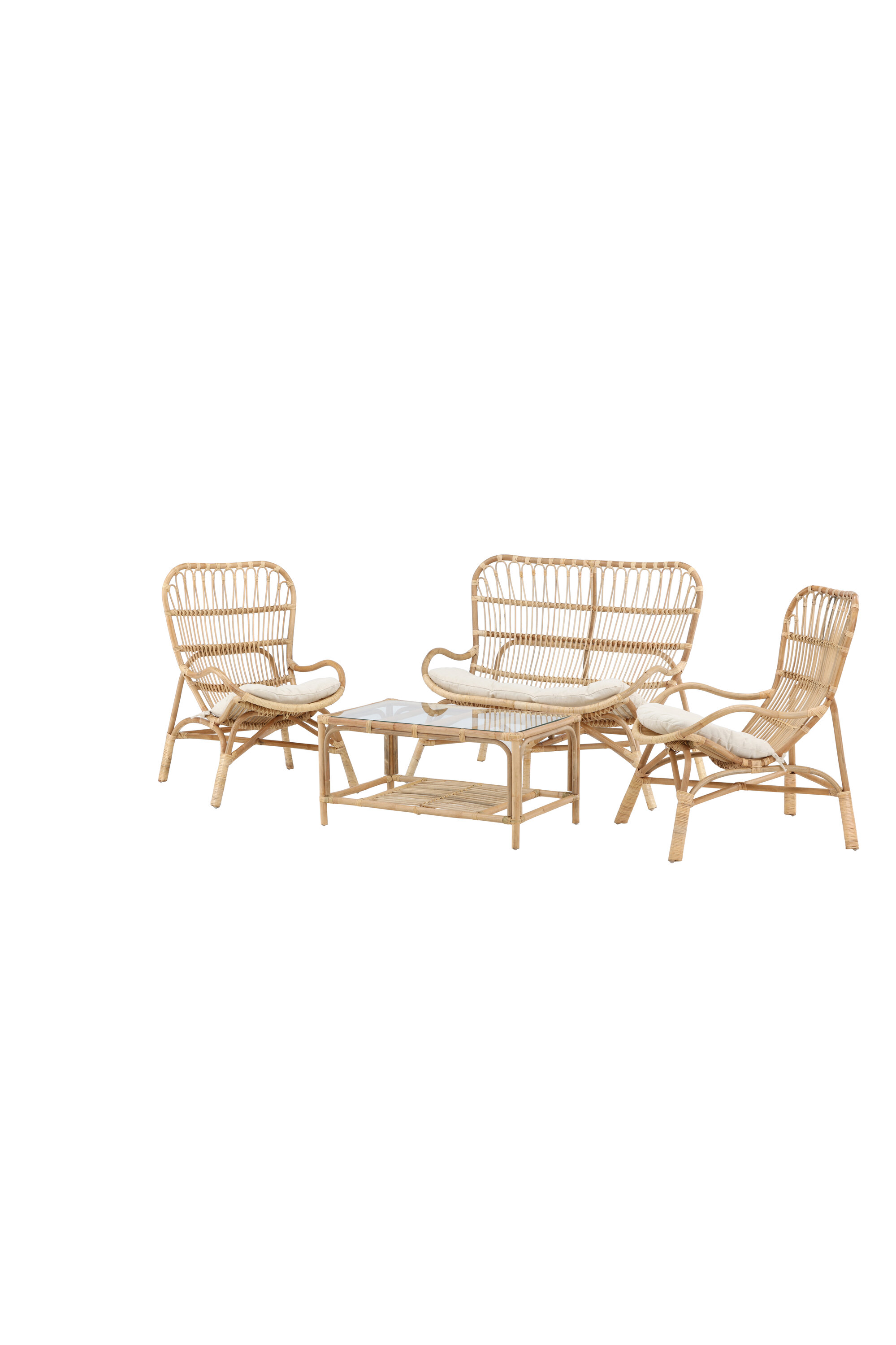 Lounge Group Ella, kutsuv, mugavusele keskenduv mööbligrupp, mis on valmistatud tugevast ja vastupidavast looduskuningannast – sobib suurepäraselt klaasitud siseõuele. Mööbligrupp koosneb kahekohalisest diivanist, kahest raamiga tugitoolist, millel on peened detailid, sh valged istmepadjad. Samuti on olemas ristkülikukujuline kohvilaud, millel on stiilne klaasist lauaplaat ja väiksem riiul, mis sobib suurepäraselt kergenduseks. Looduslik materjal annab igale mööblile kordumatu iseloomu ja loob sooja pilgupüüdja.