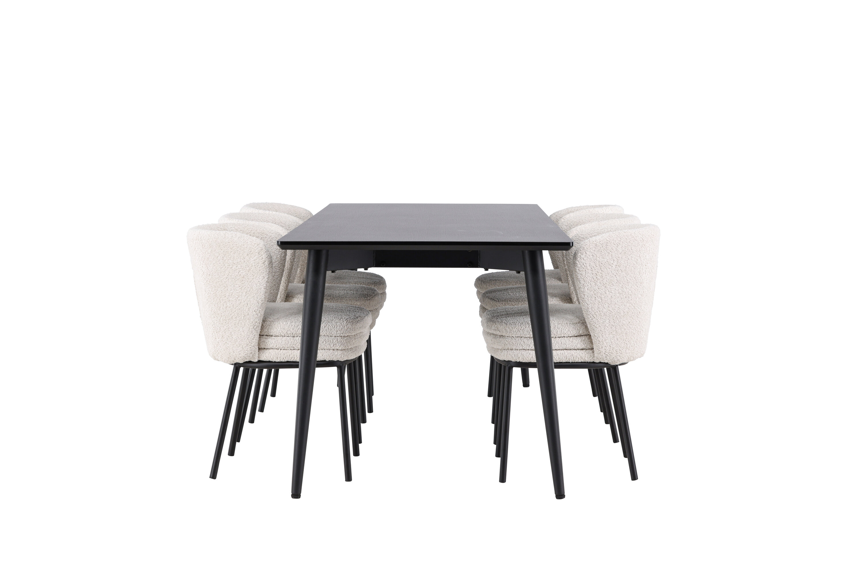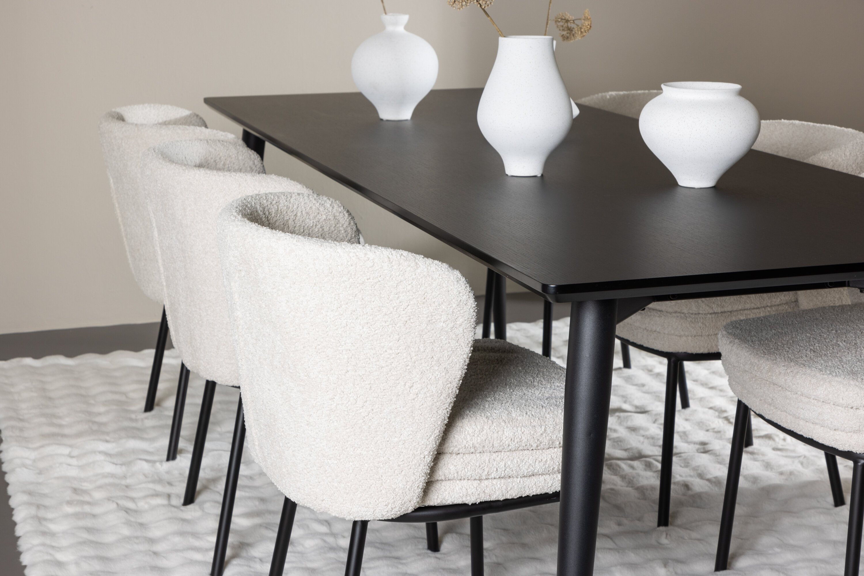 Avastage täiuslik söögikomplekt koos Agnese söögitooli ja Ellise söögilauaga – kombinatsioon, millest õhkub nii elegantsi kui ka robustsust teie koju. Söögitoolil Agnes on lihtne ilu ja stiilne disain, valge bouclé iste ja elegantsed mustad terasest jalad. Pehme ja tekstureeritud bouclé iste annab sooja ja kutsuva tunde, samas kui mustad terasest jalad lisavad toolile moodsa hõngu. Agnes loob harmoonilise atmosfääri ja annab teie söögitoale või köögile muljetavaldava visuaalse efekti. Avastage Ellist, tugevat söögilauda, millest saab teie söögikeskkonna keskus. Oma musta värviga lisab Ellis teie toale elegantse ja kaasaegse hõngu. Laud on valmistatud terasest jalgade ja MDF lauaplaadiga, mis tagab täiusliku tasakaalu tugevuse ja stiili vahel. Suurte mõõtmetega 230×85 cm Ellis laud sobib suurepäraselt seltskondlikuks õhtusöögiks ning koosviibimiseks sõprade ja perega. Agnese söögitooli ja Ellise söögilauaga saate oma söögitoale elegantsi ja stiili värskendada. See söögikomplekt loob trendika ja stiilse atmosfääri ning pakub tasakaalu ajatu disaini ja moodsate detailide vahel, muutes selle ideaalseks valikuks nii igapäevaseks õhtusöögiks kui ka pidulikuks sündmuseks.