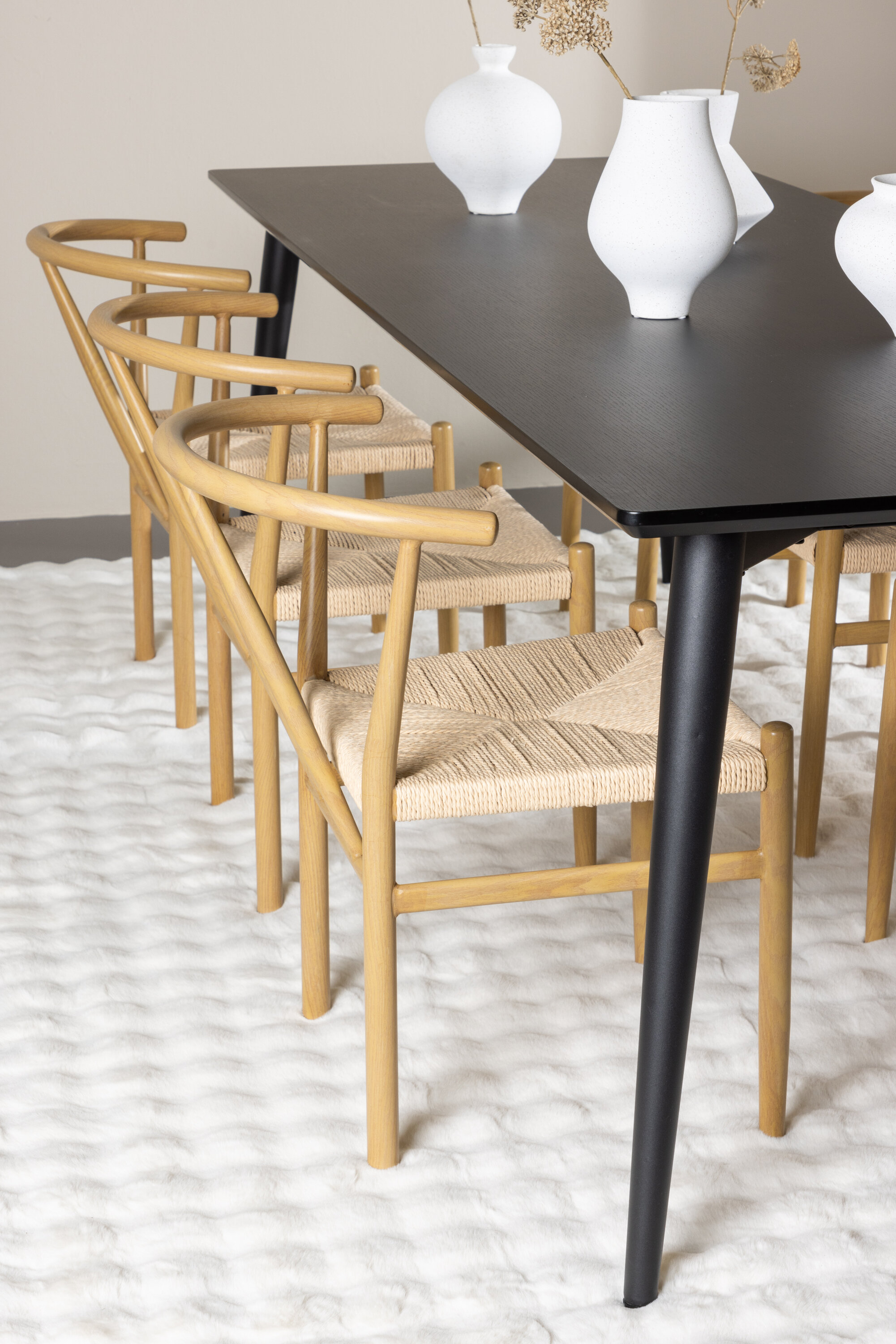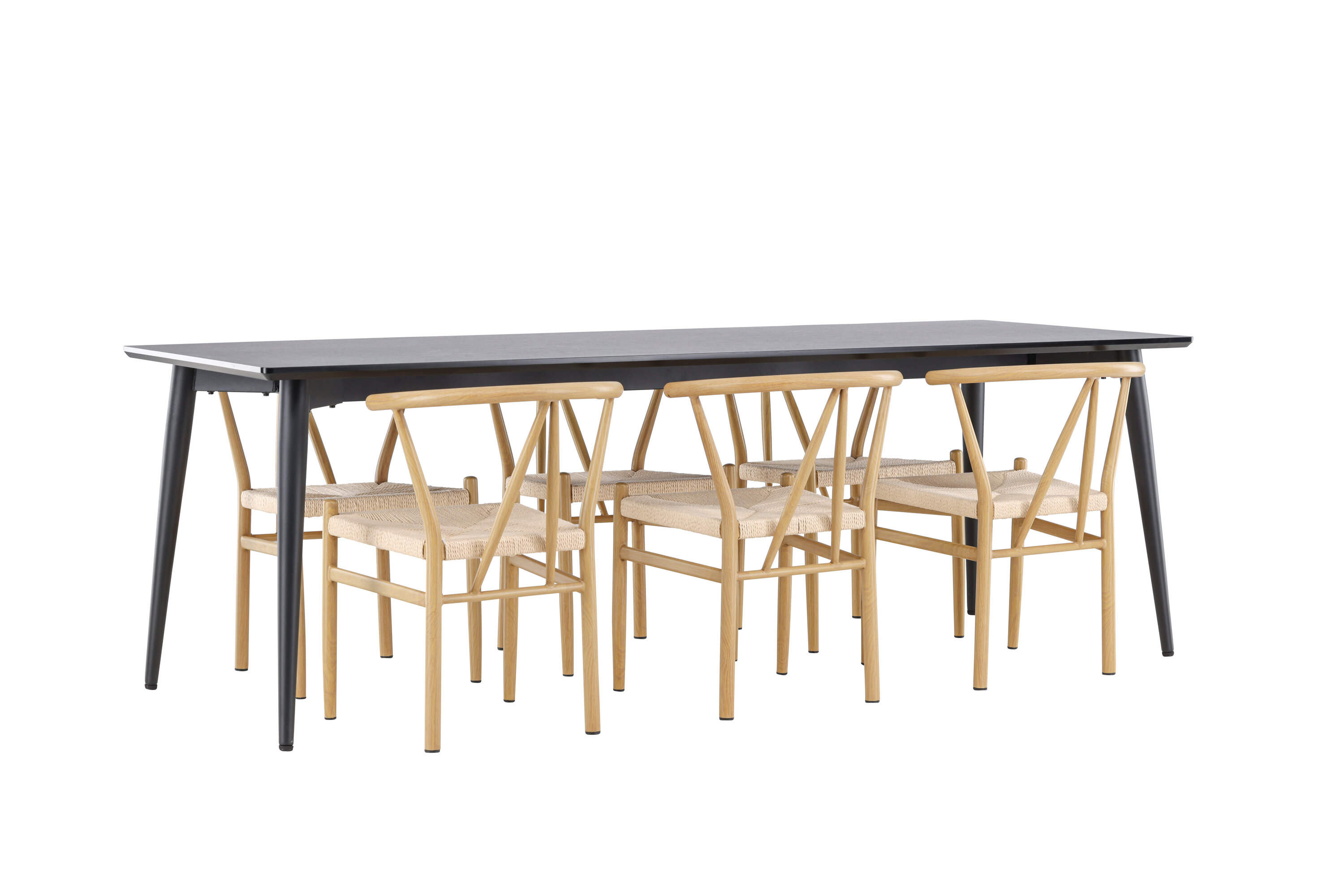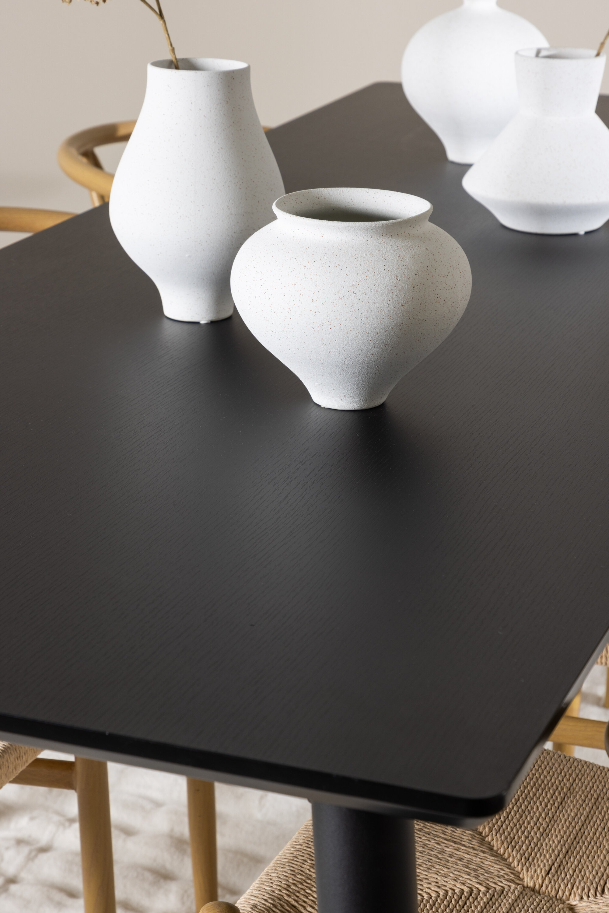 Muutke oma söögituba kutsuvaks ja stiilseks kohaks meie keeruka söögikomplektiga, mis ühendab endas kaasaegse disaini ja ajatu elegantsi. See söögikomplekt koosneb võluvatest Alfonsi toolidest ja tugevast Ellise söögilauast, mistõttu sobib see ideaalselt igaks juhuks. Avasta Alfonsi tool – täiuslik segu modernsusest ja ajatust elegantsist. Naturaalses värvitoonis rotangist valmistatud terasest jalgadega Alfons annab värske ja lõdvestunud tunde igasse ruumi. Oma trendikindla disaini ja neutraalse välimusega sobib Alfons sujuvalt erinevatesse interjööristiilidesse. Selle elegantne siluett ja kootud struktuur loovad teie koju õhulise ja kutsuva atmosfääri. Alfonsi tool pole mitte ainult mugav iste, vaid ka koht kaaslaseks ja suhtlemiseks. Olgu Alfons oma kaaslaseks pikkadel vestlustel või hubastel hetkedel sõprade ja perega. Oma võlu ja mitmekülgsusega on Alfonsi tool iga kaasaegse kodu kohustuslik. Avasta Ellis – vastupidav söögilaud, millest saab teie söögikeskkonna keskus. Oma musta värviga lisab Ellis teie toale elegantse ja kaasaegse hõngu. Laud on valmistatud terasest jalgade ja MDF lauaplaadiga, mis tagab täiusliku tasakaalu tugevuse ja stiili vahel. Suurte mõõtmetega 230×85 cm Ellis laud sobib suurepäraselt seltskondlikuks õhtusöögiks ning koosviibimiseks sõprade ja perega. Selle vastupidav konstruktsioon ja elegantne disain teevad sellest usaldusväärse mööblieseme, mis sobib igaks elujuhtumiks. Ükskõik, kas kasutate seda pereõhtusöögi nautimiseks või külaliste peole kutsumiseks, loob Ellis teie koju trendika ja stiilse atmosfääri. Alfonsi toolide ja söögilauaga Ellis saate söögikomplekti, mis ühendab parimal viisil esteetika ja funktsionaalsuse. Täiustage oma söögituba selle elegantse ja mitmekülgse söögikomplektiga.