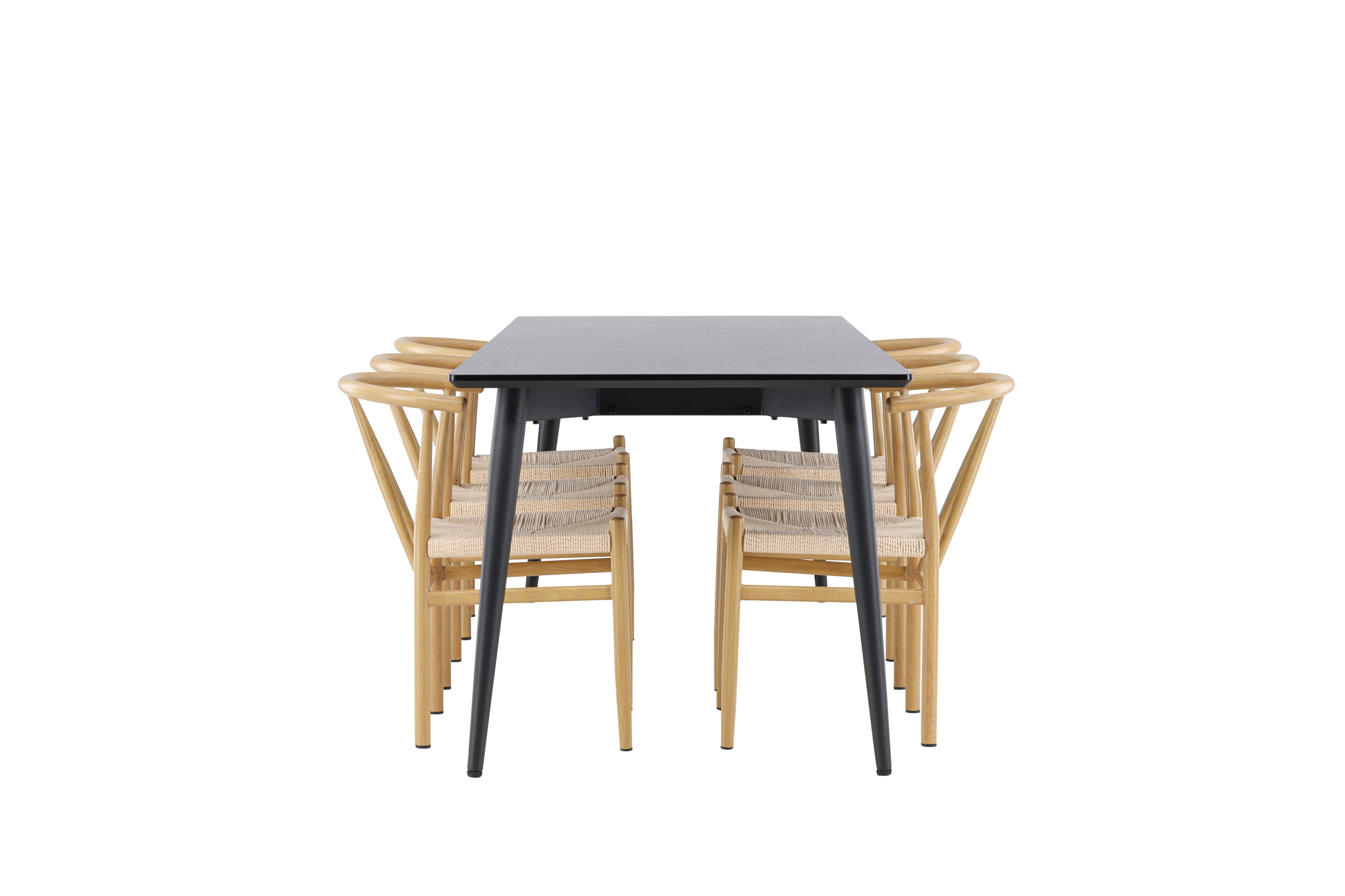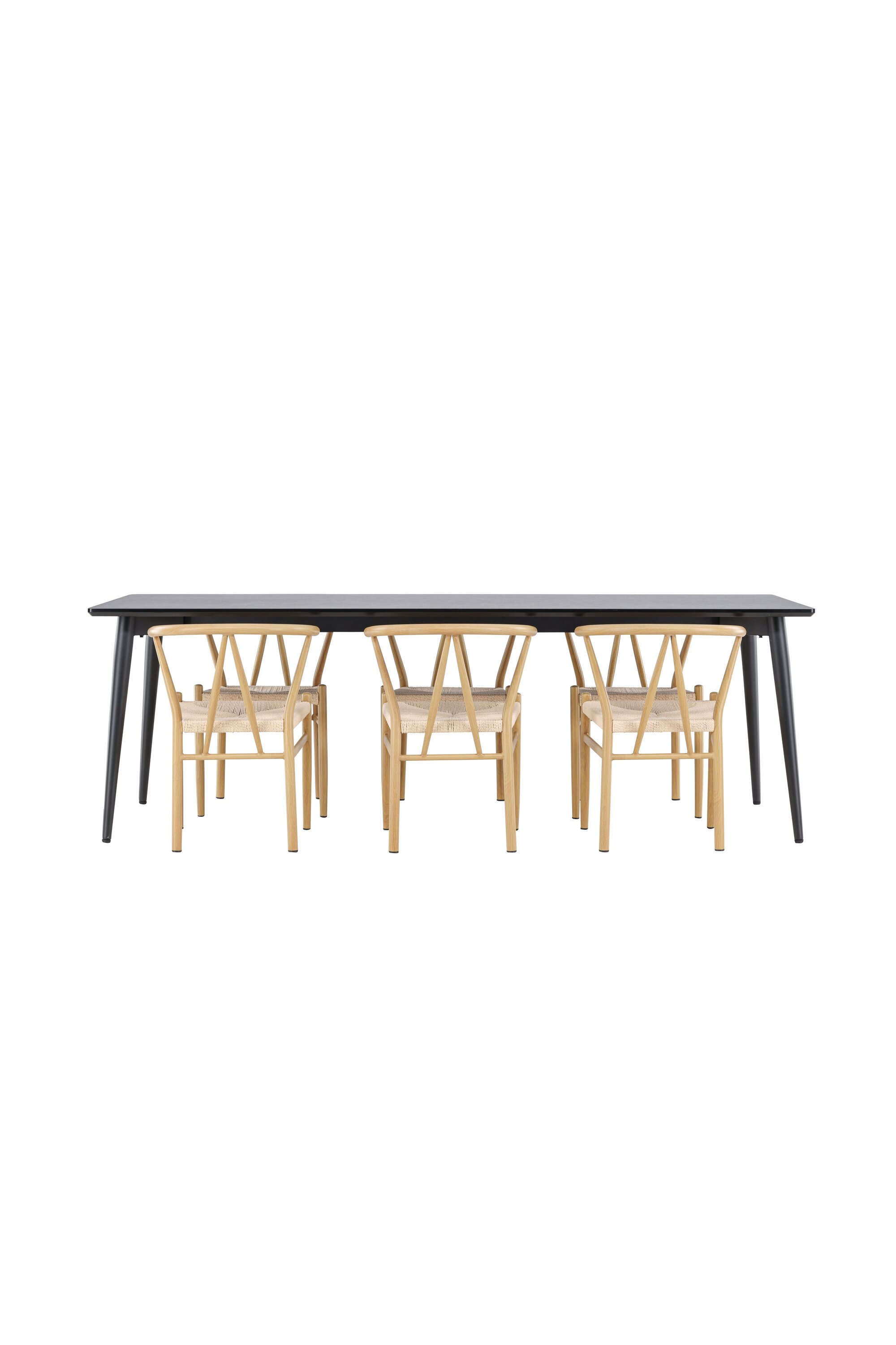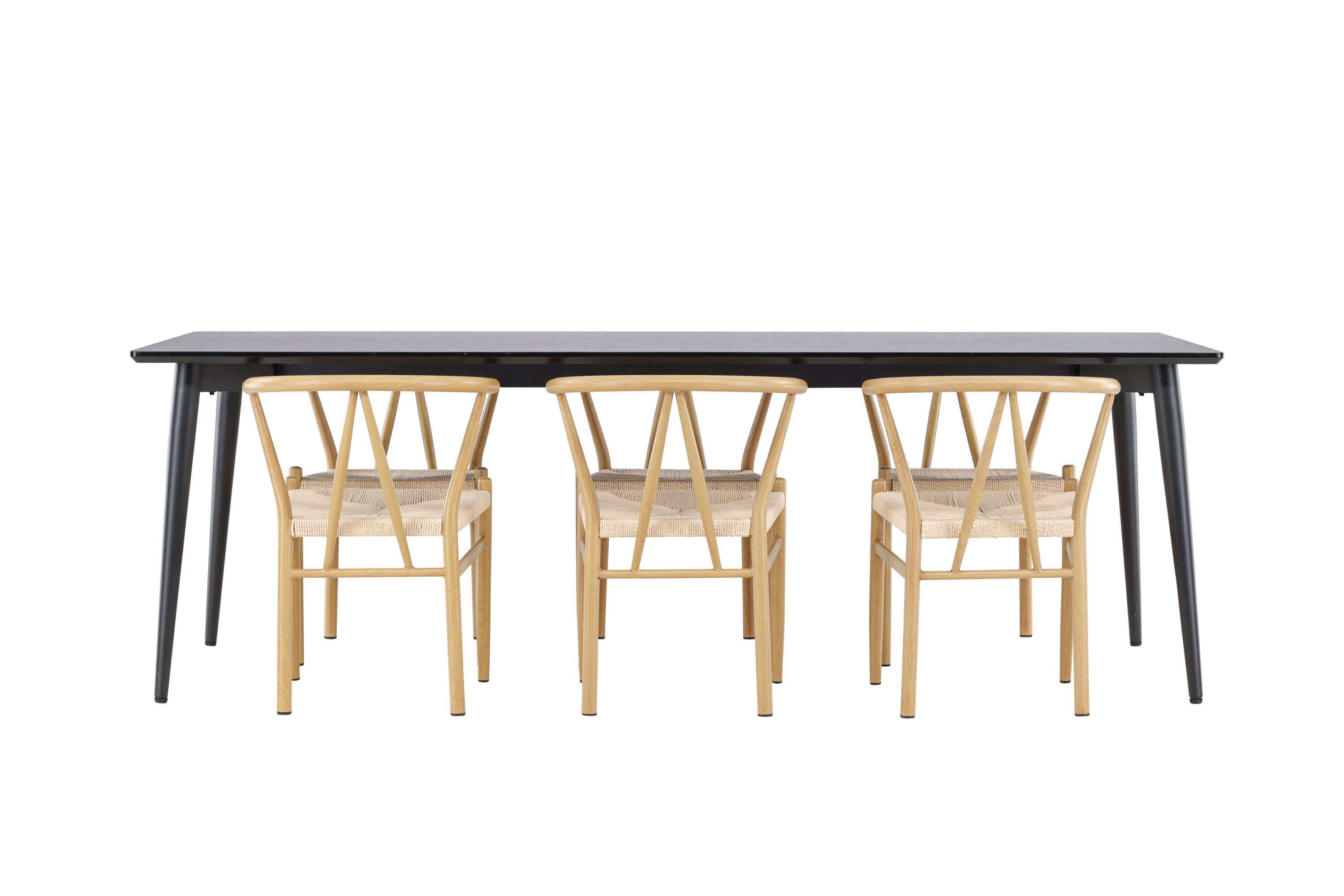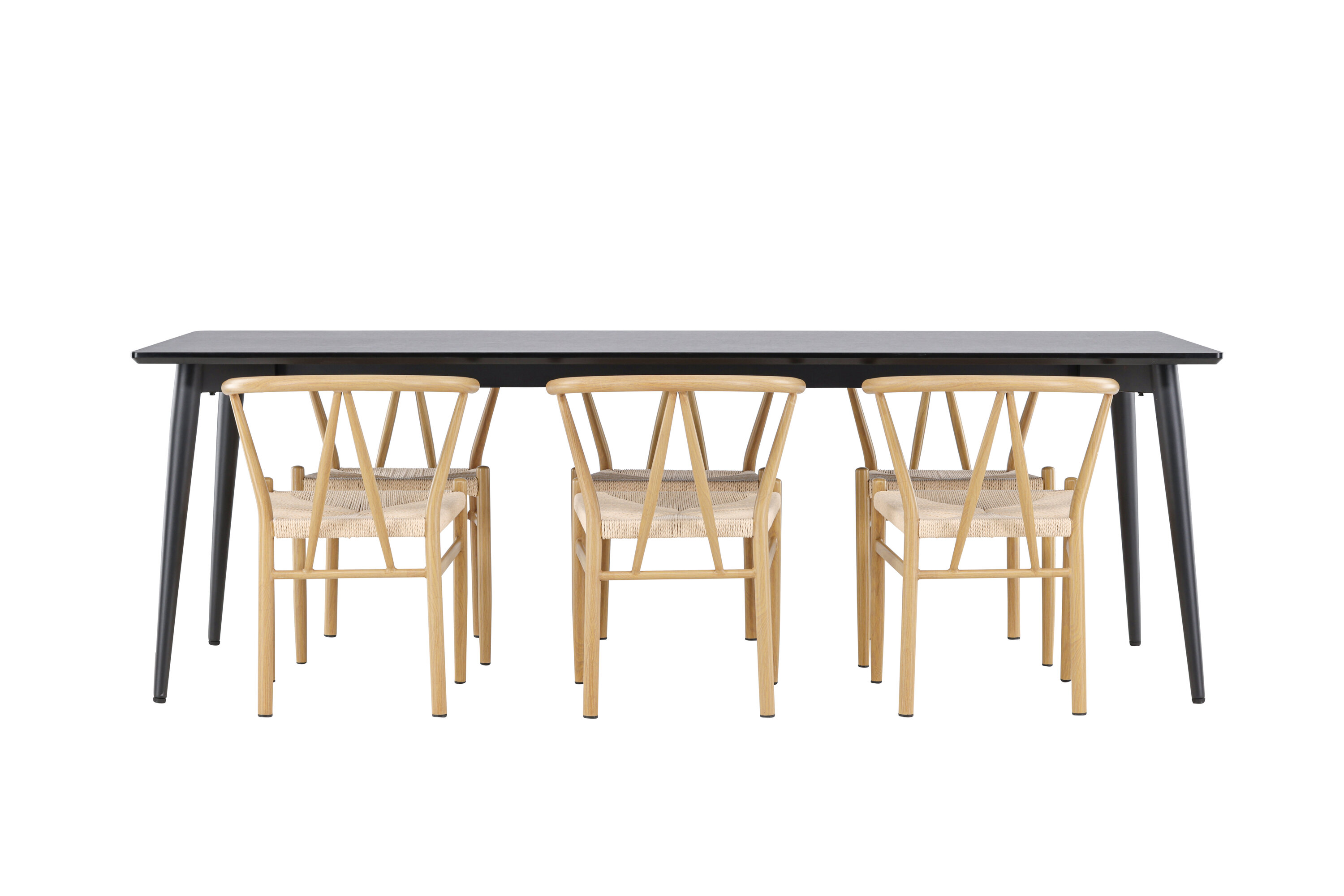 Muutke oma söögituba kutsuvaks ja stiilseks kohaks meie keeruka söögikomplektiga, mis ühendab endas kaasaegse disaini ja ajatu elegantsi. See söögikomplekt koosneb võluvatest Alfonsi toolidest ja tugevast Ellise söögilauast, mistõttu sobib see ideaalselt igaks juhuks. Avasta Alfonsi tool – täiuslik segu modernsusest ja ajatust elegantsist. Naturaalses värvitoonis rotangist valmistatud terasest jalgadega Alfons annab värske ja lõdvestunud tunde igasse ruumi. Oma trendikindla disaini ja neutraalse välimusega sobib Alfons sujuvalt erinevatesse interjööristiilidesse. Selle elegantne siluett ja kootud struktuur loovad teie koju õhulise ja kutsuva atmosfääri. Alfonsi tool pole mitte ainult mugav iste, vaid ka koht kaaslaseks ja suhtlemiseks. Olgu Alfons oma kaaslaseks pikkadel vestlustel või hubastel hetkedel sõprade ja perega. Oma võlu ja mitmekülgsusega on Alfonsi tool iga kaasaegse kodu kohustuslik. Avasta Ellis – vastupidav söögilaud, millest saab teie söögikeskkonna keskus. Oma musta värviga lisab Ellis teie toale elegantse ja kaasaegse hõngu. Laud on valmistatud terasest jalgade ja MDF lauaplaadiga, mis tagab täiusliku tasakaalu tugevuse ja stiili vahel. Suurte mõõtmetega 230×85 cm Ellis laud sobib suurepäraselt seltskondlikuks õhtusöögiks ning koosviibimiseks sõprade ja perega. Selle vastupidav konstruktsioon ja elegantne disain teevad sellest usaldusväärse mööblieseme, mis sobib igaks elujuhtumiks. Ükskõik, kas kasutate seda pereõhtusöögi nautimiseks või külaliste peole kutsumiseks, loob Ellis teie koju trendika ja stiilse atmosfääri. Alfonsi toolide ja söögilauaga Ellis saate söögikomplekti, mis ühendab parimal viisil esteetika ja funktsionaalsuse. Täiustage oma söögituba selle elegantse ja mitmekülgse söögikomplektiga.