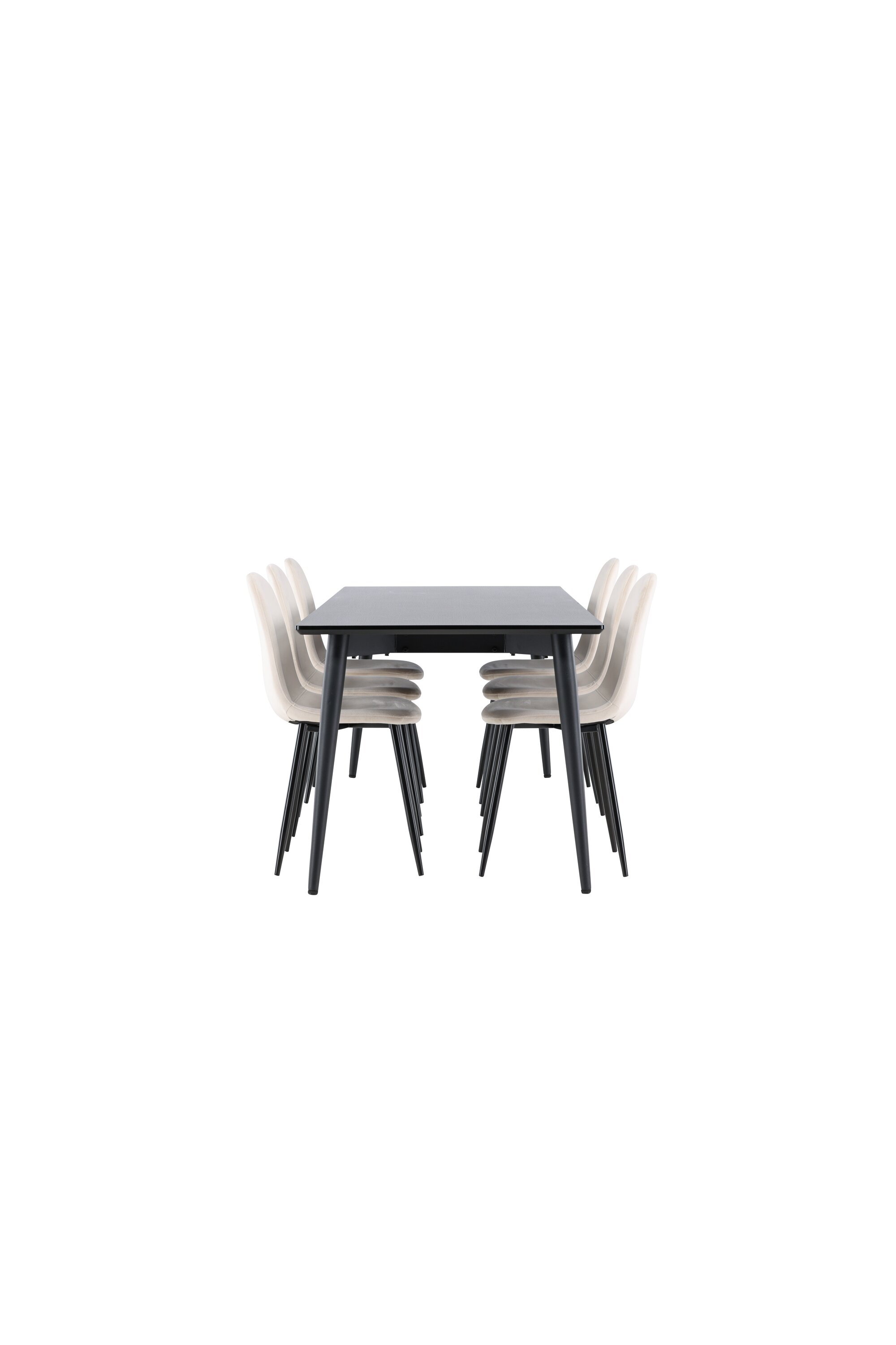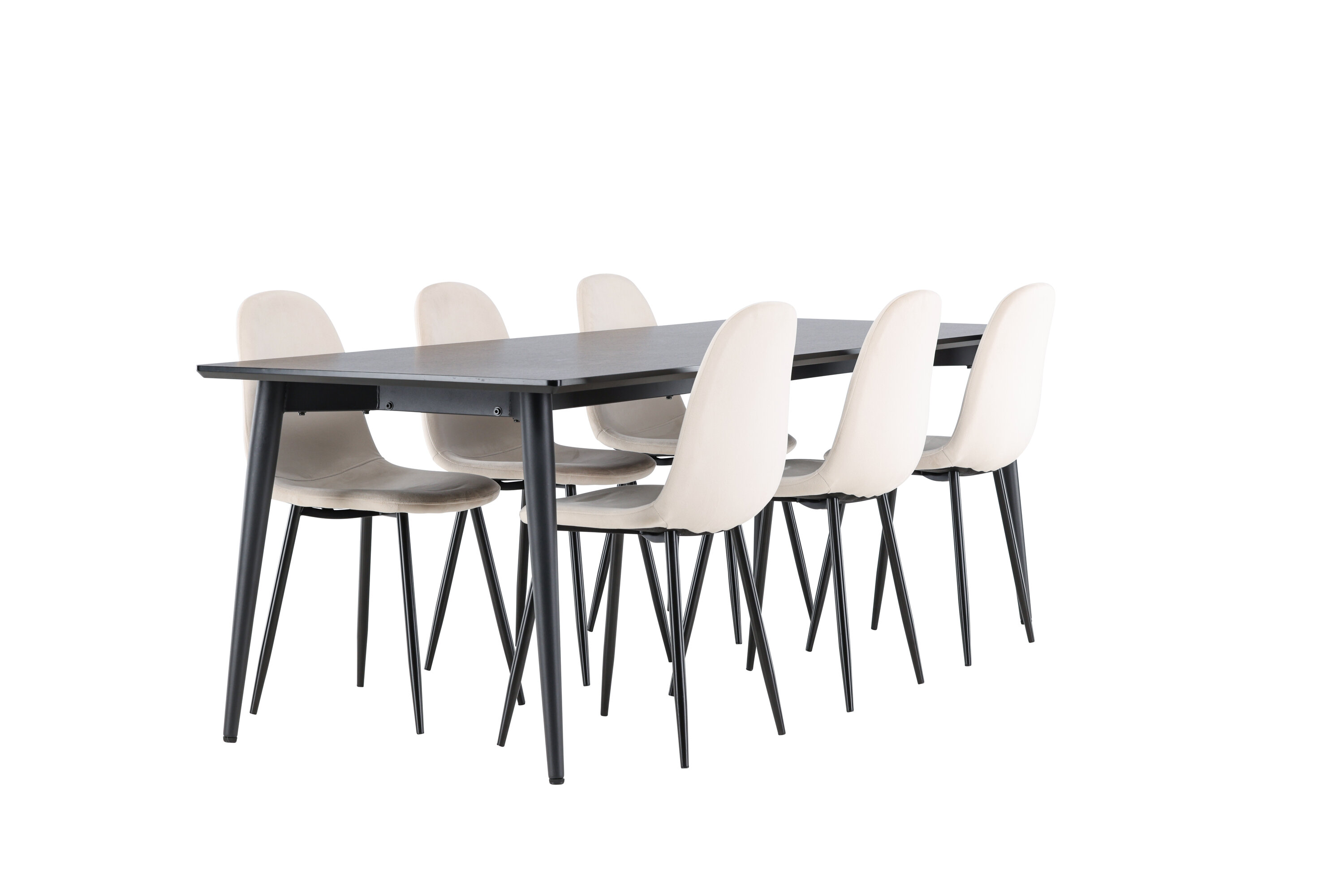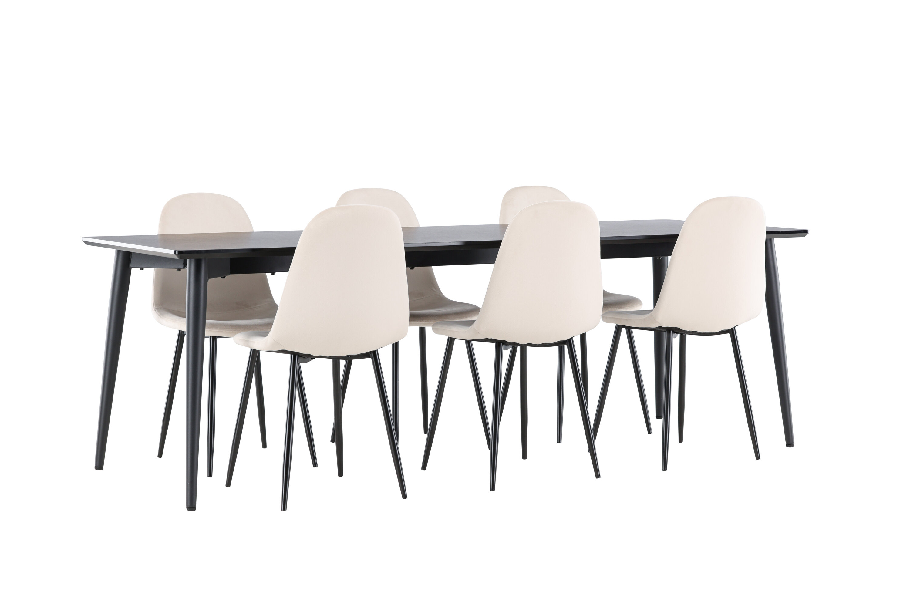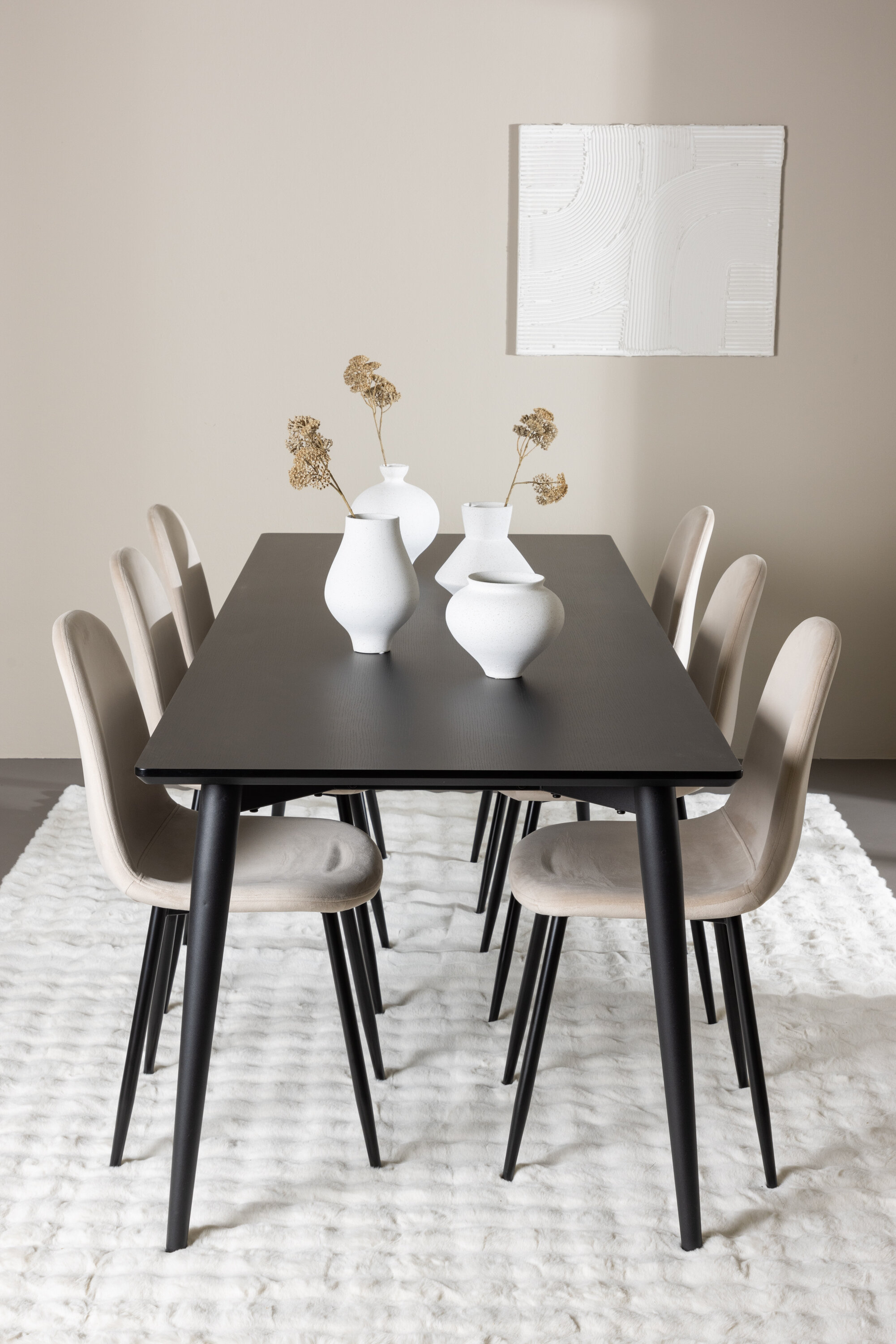 Avastage täiuslik söögikomplekt Polari söögitooli ja söögilauaga Ellis – kombinatsioon, millest õhkub nii elegantsi kui ka robustsust teie koju. Polar on stiilses beežis värvitoonis moodne unistuste tool. Sellel söögitoolil on täielikult polsterdatud disain, millel on sametkangast veidi ümar seljatugi ja iste ning musta pulbervärvitud metallist jalad. See on sama mugav kui ka pilkupüüdev, mistõttu sobib see suurepäraselt kodu südame kutsuval ja hubasel viisil sisustamiseks. Nautige maitsvaid eineid pere ja sõpradega! Avastage Ellist, vastupidavat söögilauda, millest saab teie söögikeskkonna keskpunkt. Oma musta värviga lisab Ellis teie toale elegantse ja kaasaegse hõngu. Laud on valmistatud terasest jalgade ja MDF lauaplaadiga, mis tagab täiusliku tasakaalu tugevuse ja stiili vahel. Suurte mõõtmetega 230×85 cm Ellis laud sobib suurepäraselt seltskondlikuks õhtusöögiks ning koosviibimiseks sõprade ja perega. Andke oma söögitoale Polari söögitooli ja Ellis söögilauaga elegantsus ja stiil. See söögikomplekt loob trendika ja stiilse atmosfääri ning pakub tasakaalu ajatu disaini ja moodsate detailide vahel, muutes selle ideaalseks valikuks nii igapäevaseks õhtusöögiks kui ka pidulikuks sündmuseks.