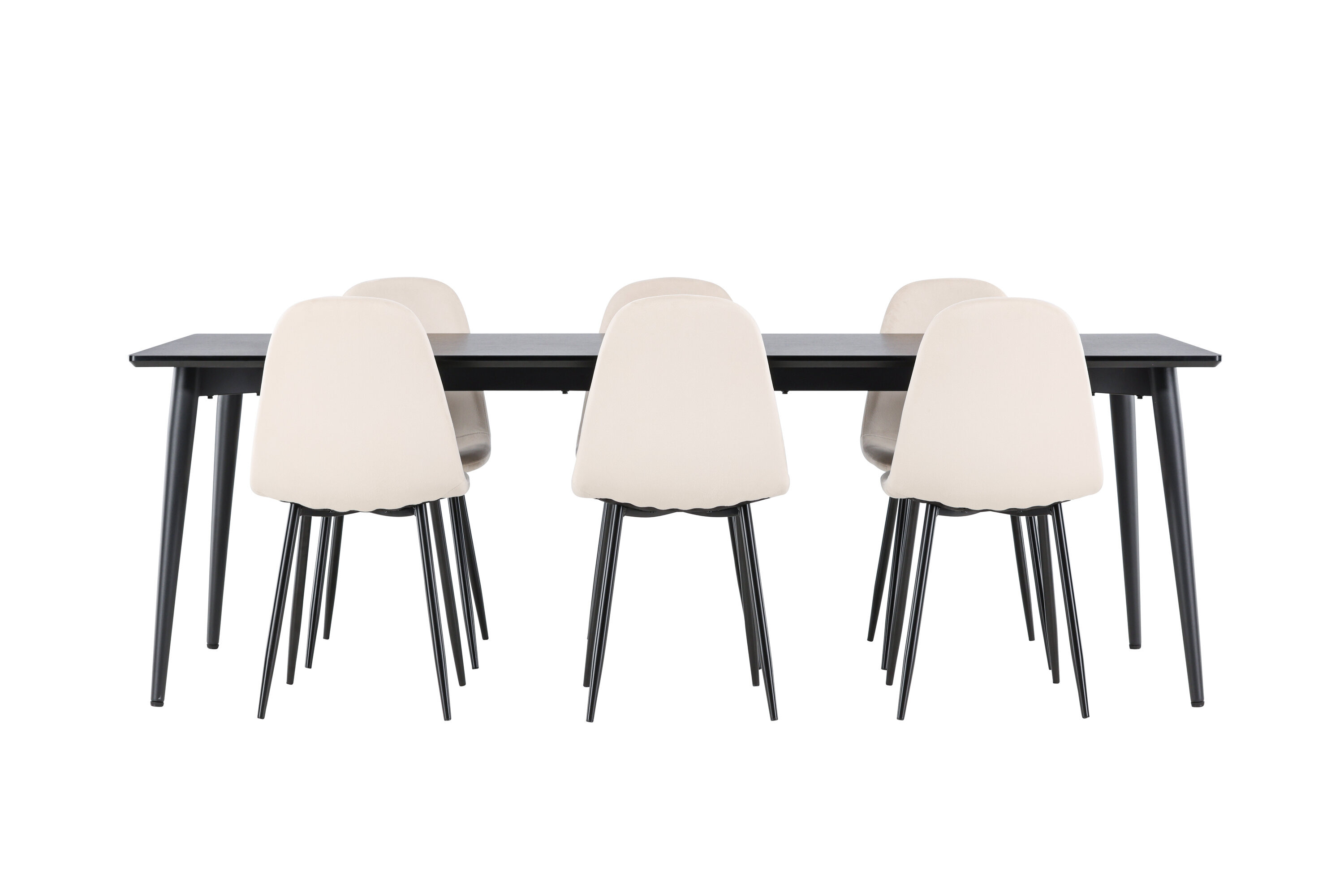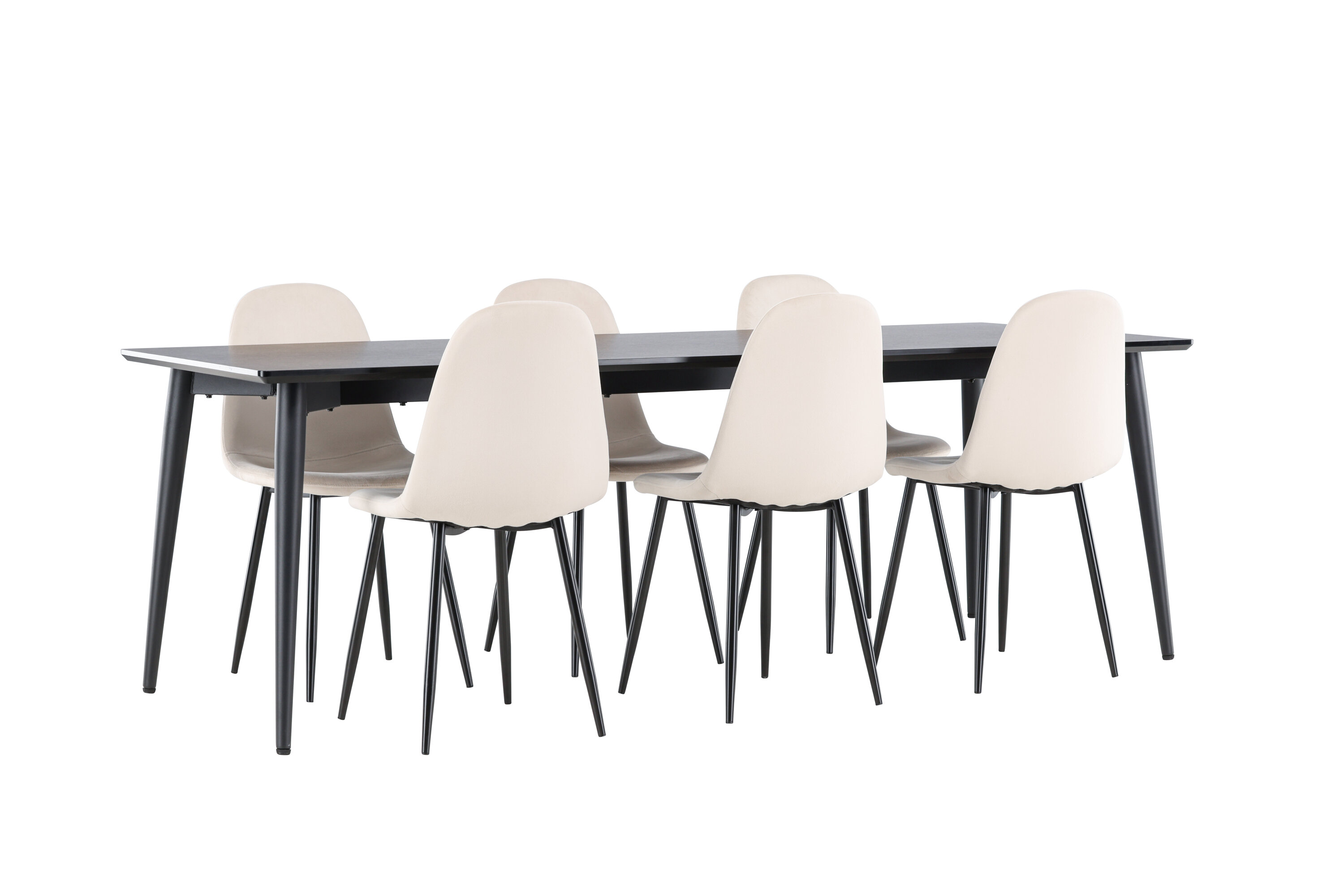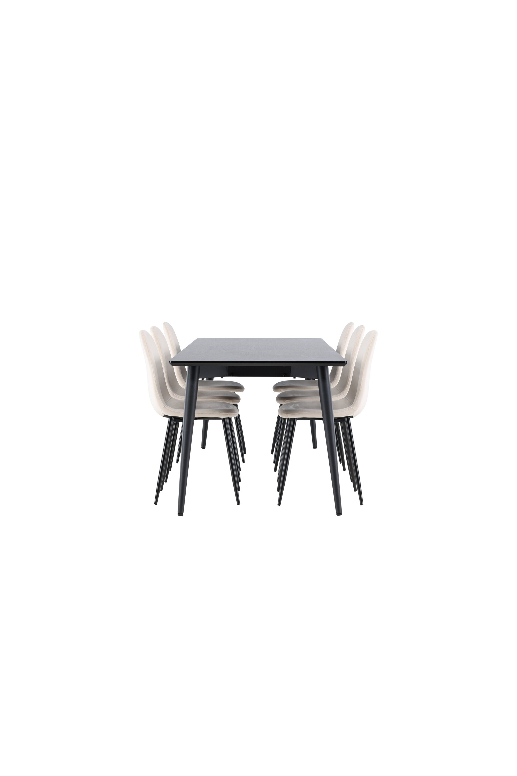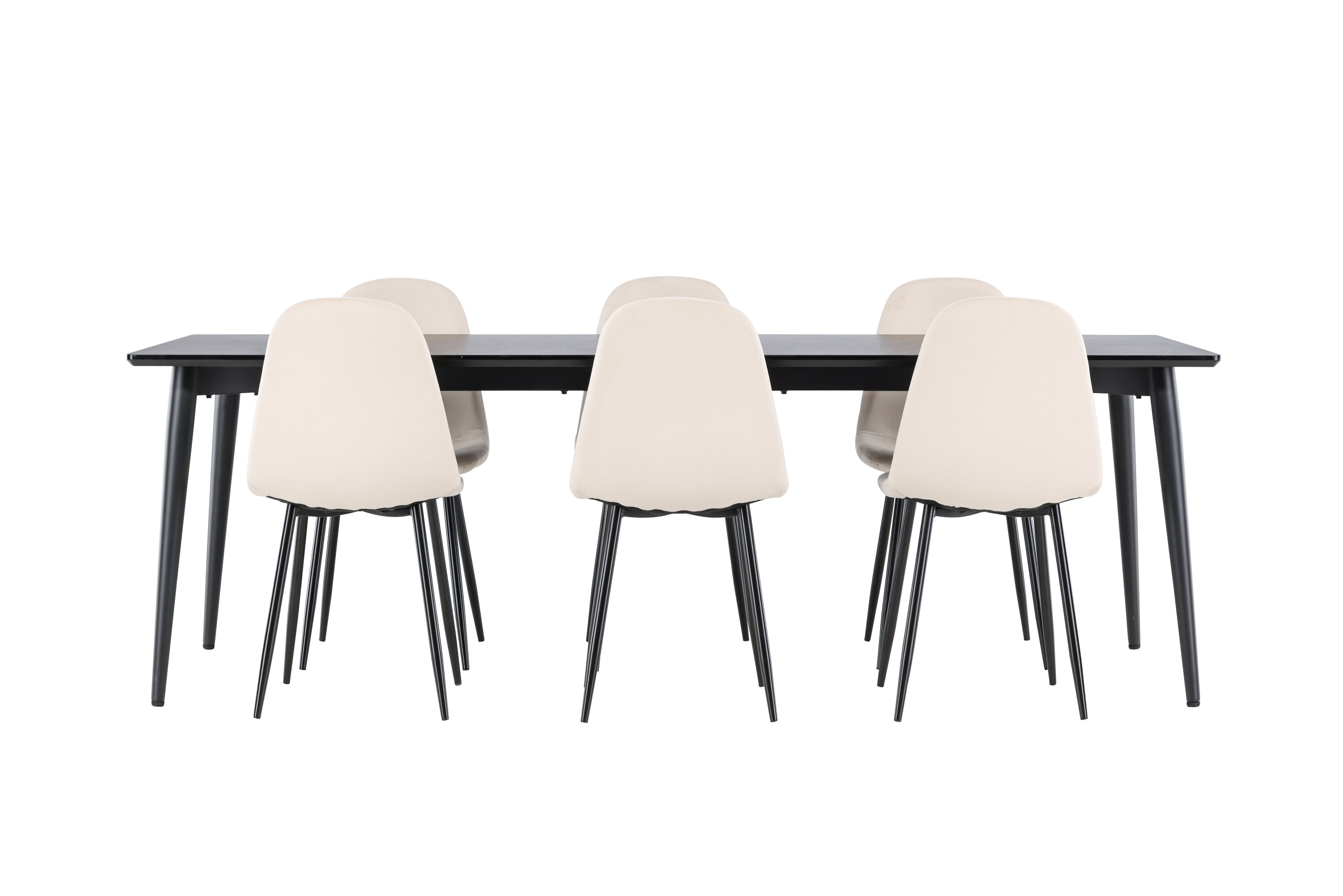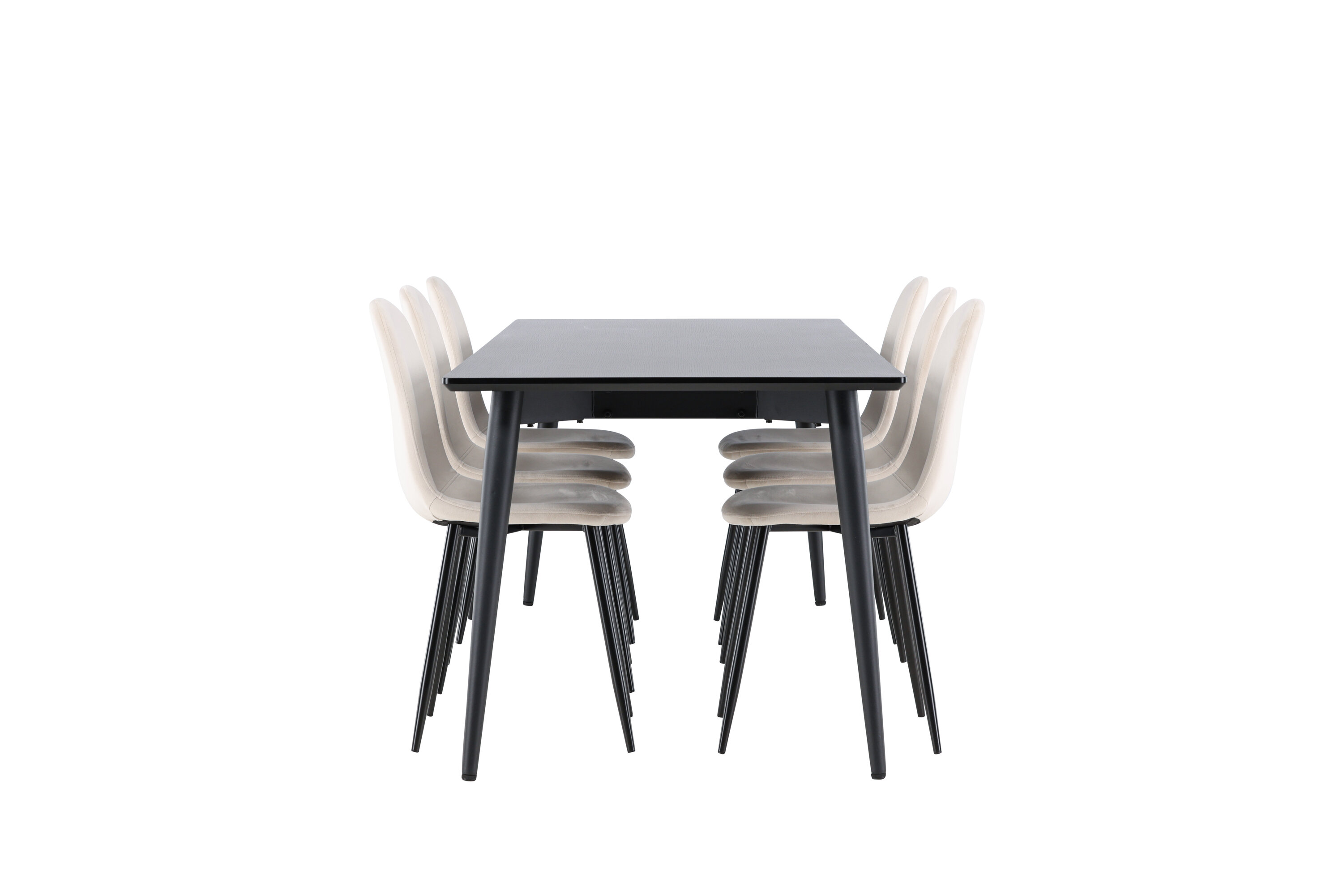 Avastage täiuslik söögikomplekt Polari söögitooli ja söögilauaga Ellis – kombinatsioon, millest õhkub nii elegantsi kui ka robustsust teie koju. Polar on stiilses beežis värvitoonis moodne unistuste tool. Sellel söögitoolil on täielikult polsterdatud disain, millel on sametkangast veidi ümar seljatugi ja iste ning musta pulbervärvitud metallist jalad. See on sama mugav kui ka pilkupüüdev, mistõttu sobib see suurepäraselt kodu südame kutsuval ja hubasel viisil sisustamiseks. Nautige maitsvaid eineid pere ja sõpradega! Avastage Ellist, vastupidavat söögilauda, millest saab teie söögikeskkonna keskpunkt. Oma musta värviga lisab Ellis teie toale elegantse ja kaasaegse hõngu. Laud on valmistatud terasest jalgade ja MDF lauaplaadiga, mis tagab täiusliku tasakaalu tugevuse ja stiili vahel. Suurte mõõtmetega 230×85 cm Ellis laud sobib suurepäraselt seltskondlikuks õhtusöögiks ning koosviibimiseks sõprade ja perega. Andke oma söögitoale Polari söögitooli ja Ellis söögilauaga elegantsus ja stiil. See söögikomplekt loob trendika ja stiilse atmosfääri ning pakub tasakaalu ajatu disaini ja moodsate detailide vahel, muutes selle ideaalseks valikuks nii igapäevaseks õhtusöögiks kui ka pidulikuks sündmuseks.
