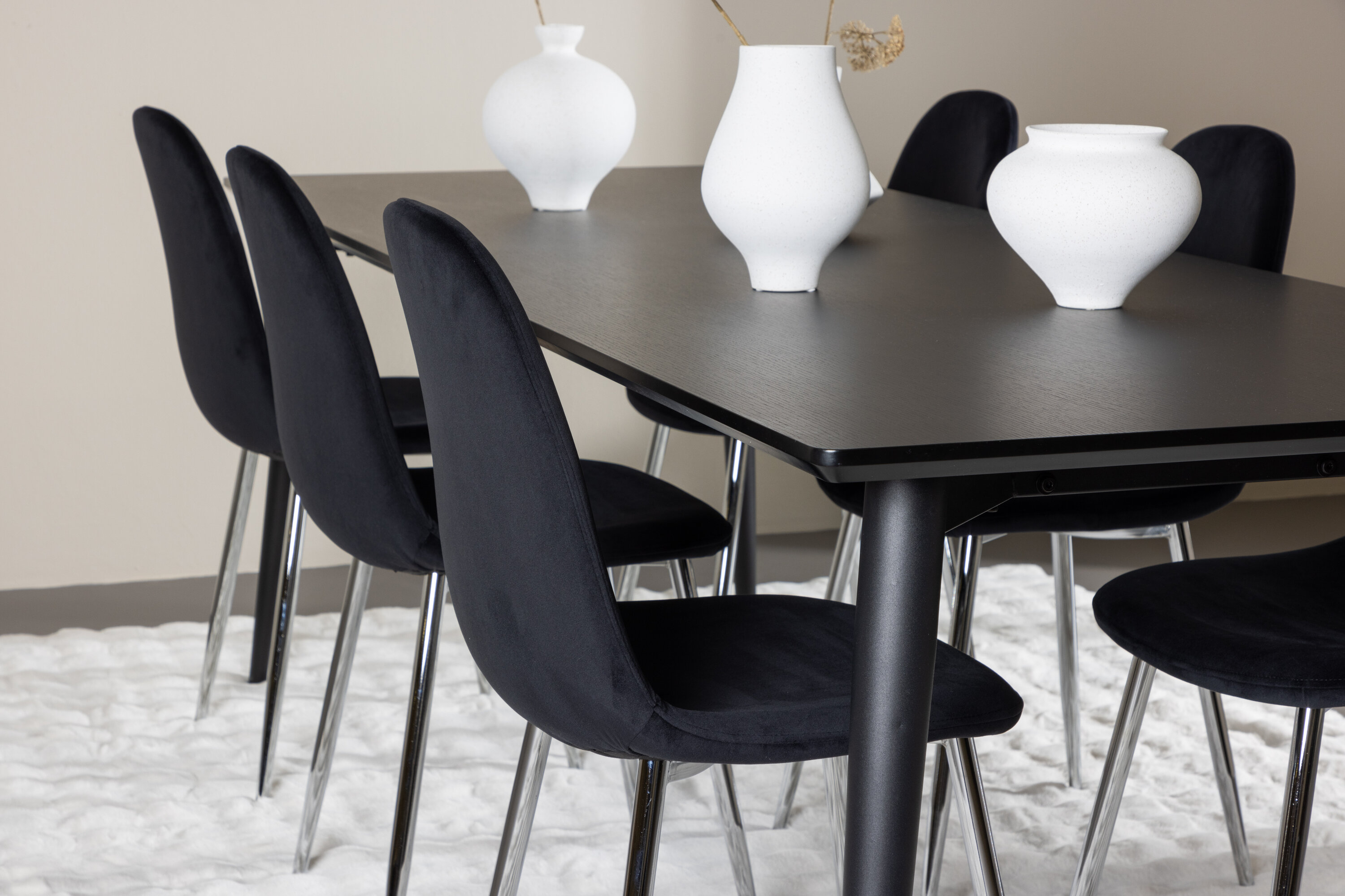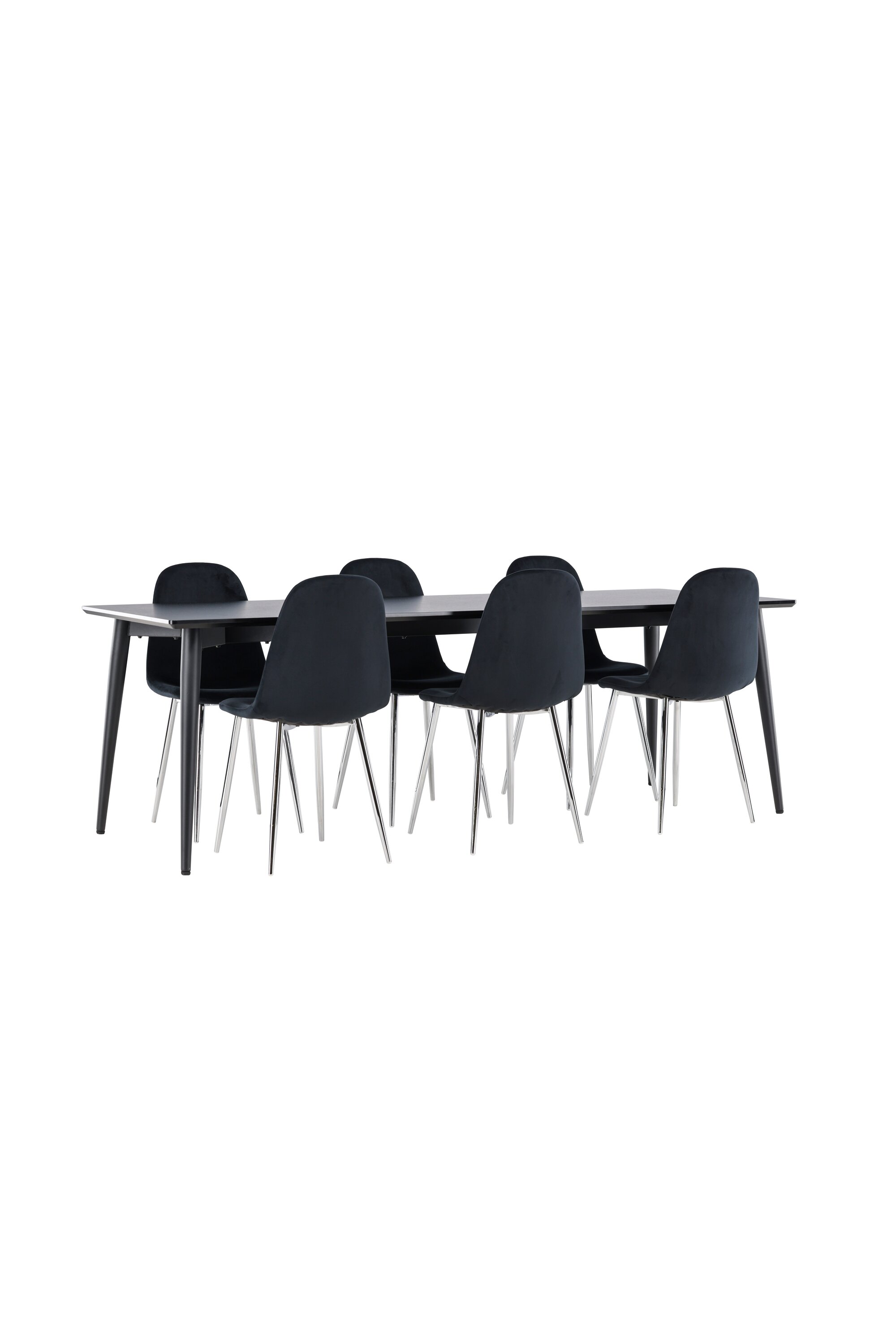 Andke oma kodule peen ja kaasaegne tunne meie stiilse söögikomplektiga, mis koosneb Polari söögitoolidest ja Ellise söögilauast. Elegantne luksusliku vaimuga söögitool Polar on täielikult polsterdatud disainiga kroomitud metallist jalgadega. Kergelt ümardatud seljatugi ja iste pehme polstriga siledast mustast sametkangast pakuvad lisamugavust. Siin ei pea te mugavuse ja disaini vahel järeleandmisi tegema. Tool pole mitte ainult mugav, vaid ka stiilne detail, mis täiustab ruumi esteetikat. Ühendage Polari toolid vastupidava Ellise söögilauaga, millest saab teie söögikeskkonna keskus. Oma musta värviga annab Ellis teie toale elegantse ja kaasaegse ilme. Laud on valmistatud terasest jalgade ja MDF lauaplaadiga, mis tagab täiusliku tasakaalu tugevuse ja stiili vahel. Suurte mõõtmetega 230×85 cm Ellis laud sobib suurepäraselt seltskondlikuks õhtusöögiks ning koosviibimiseks sõprade ja perega. Looge oma kodus trendikas ja stiilne atmosfäär meie söögikomplektiga, mis ühendab endas elegantsi, mugavust ja funktsionaalsust.