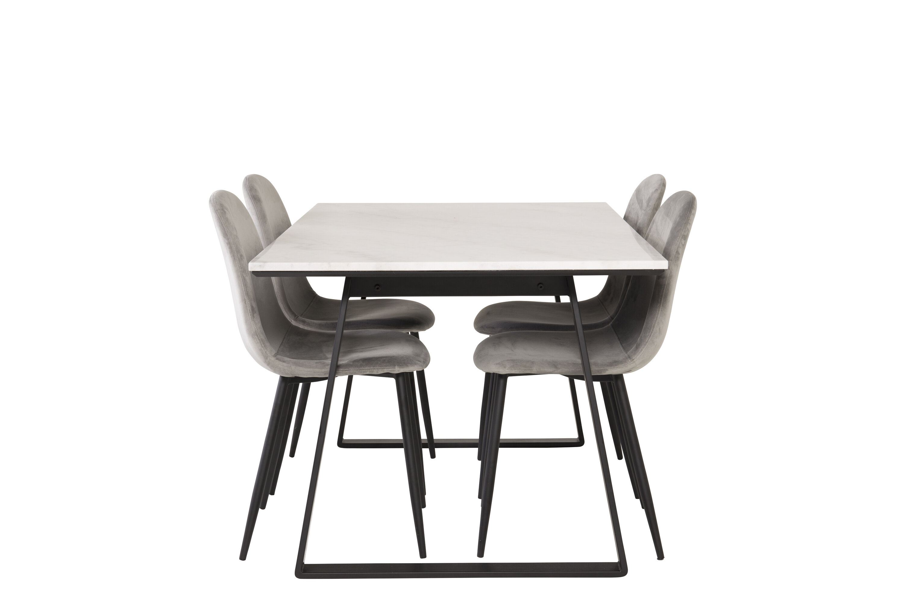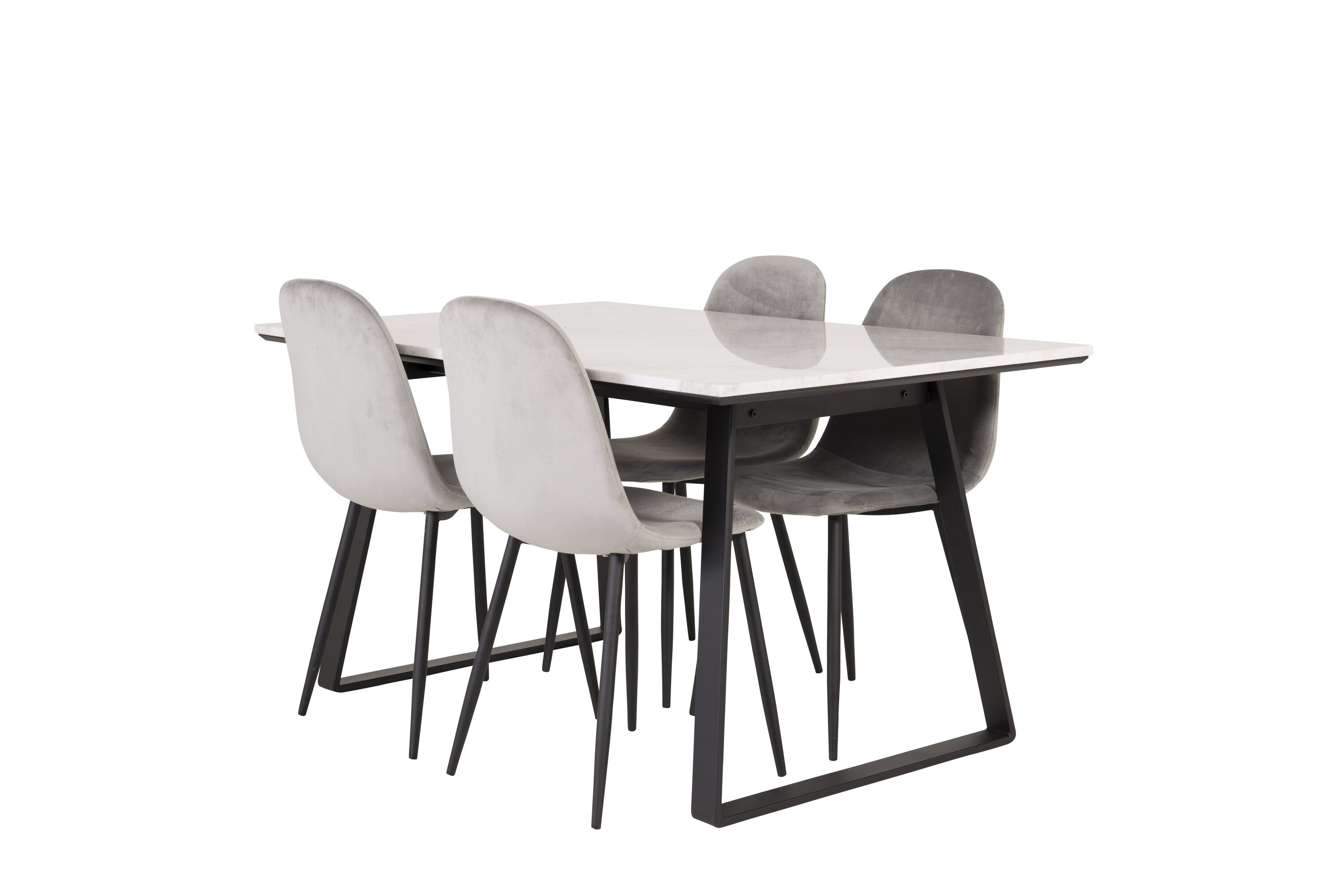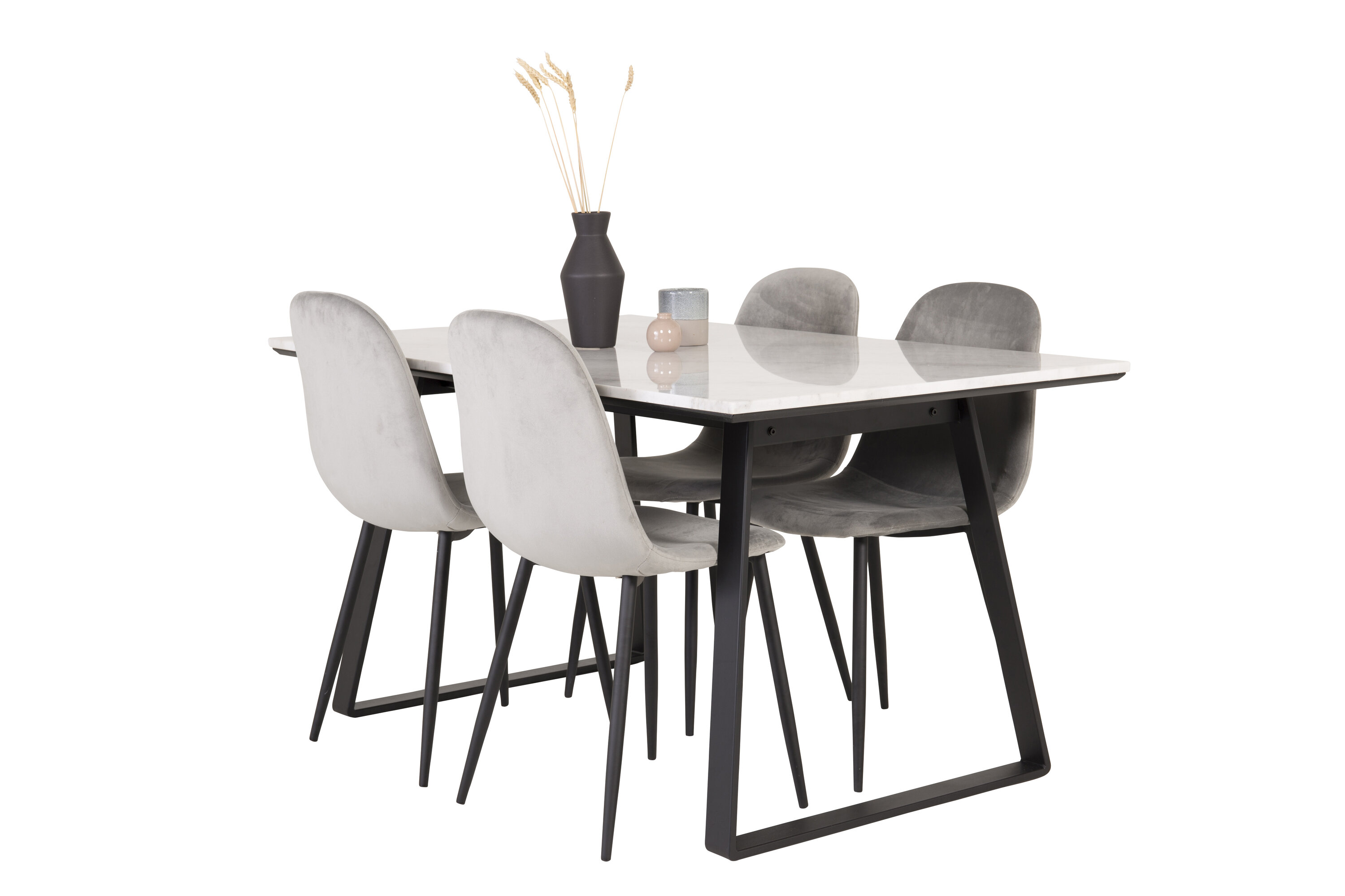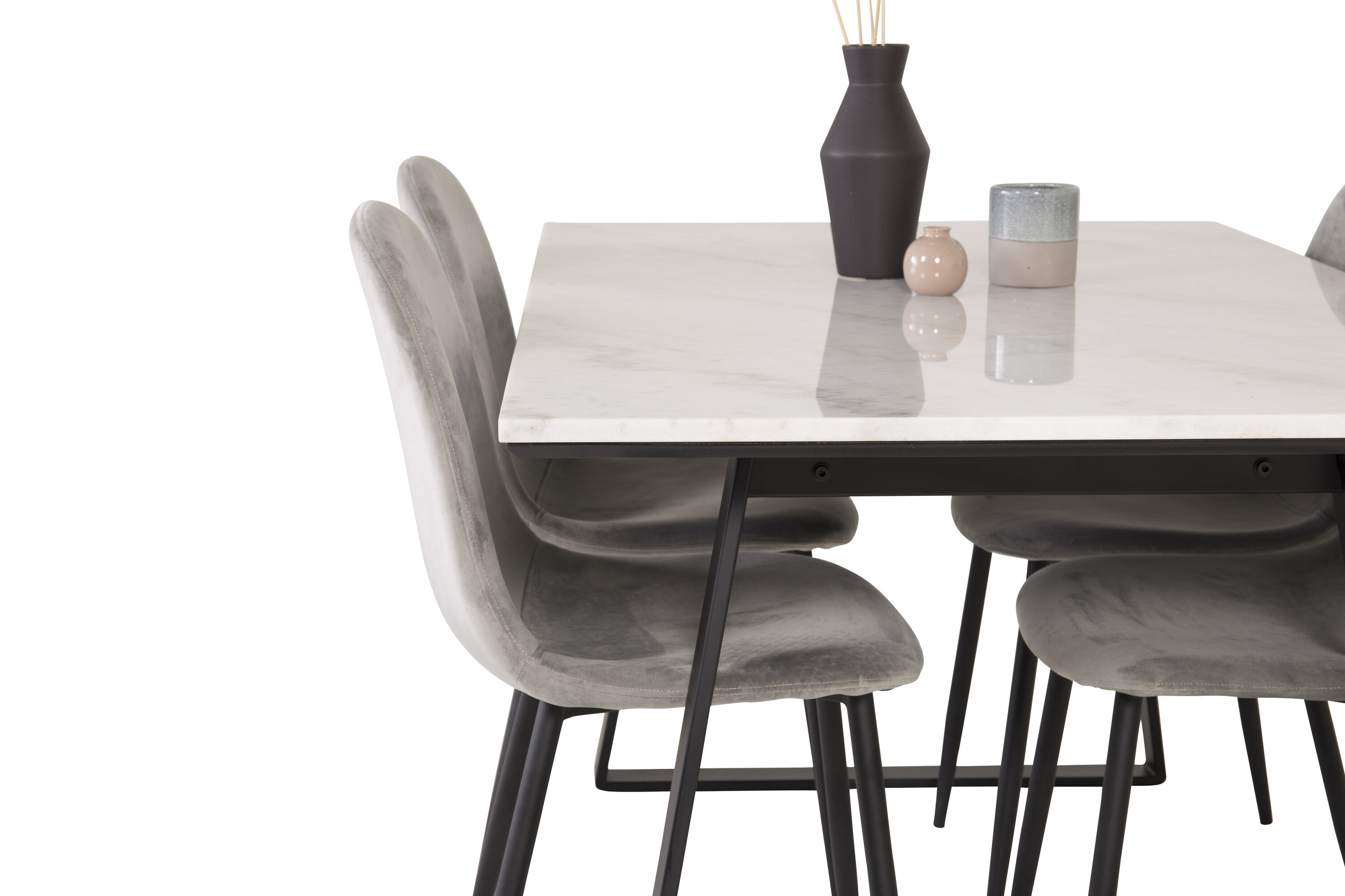 Meie maitsev söögilaud Estelle stiilse marmorilaadse välimusega koos meie hallide söögitoolidega Polar. Riietage oma toidugrupp koos muu dekoratsiooniga, mis sobib nii igapäevaeluks kui ka peole!