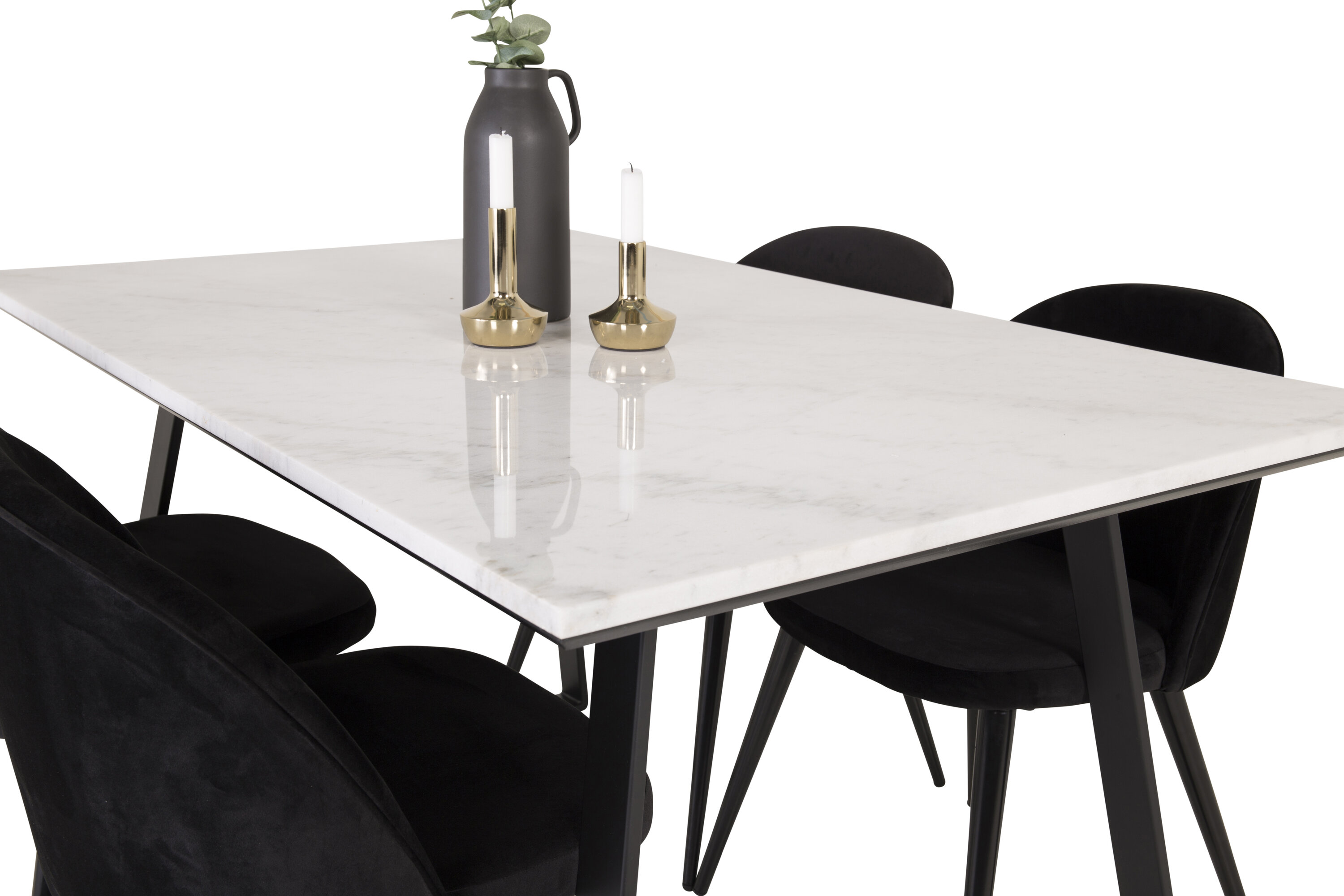 Peenikese disainiga söögilaud Estelle koos söögitoolidega Velvet – ideaalne kombinatsioon neile, kes soovivad trendikat toidugruppi. Toolide kõrge istumismugavus kutsub teid pikkadele ja imelistele hetkedele suhtlemiseks!
