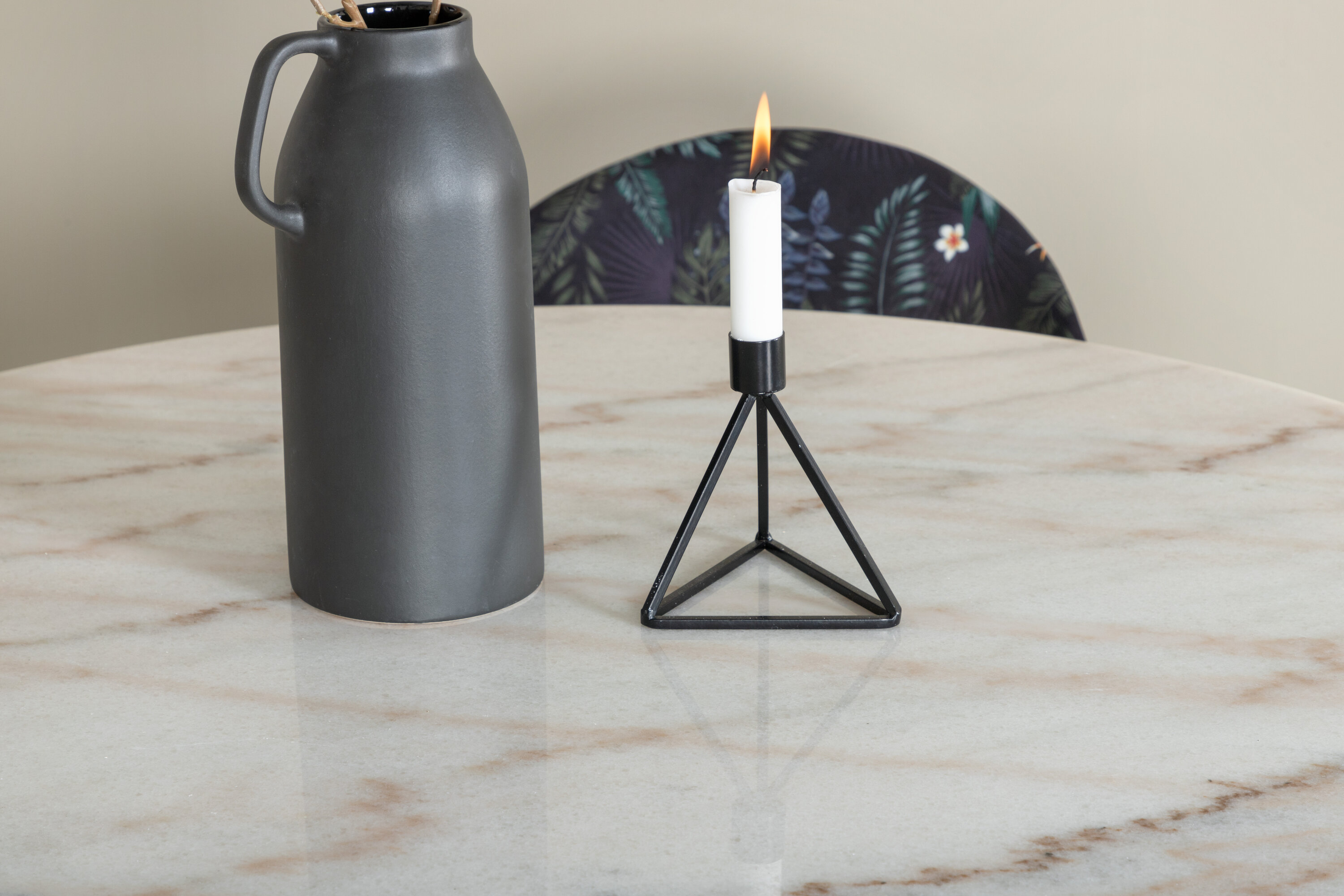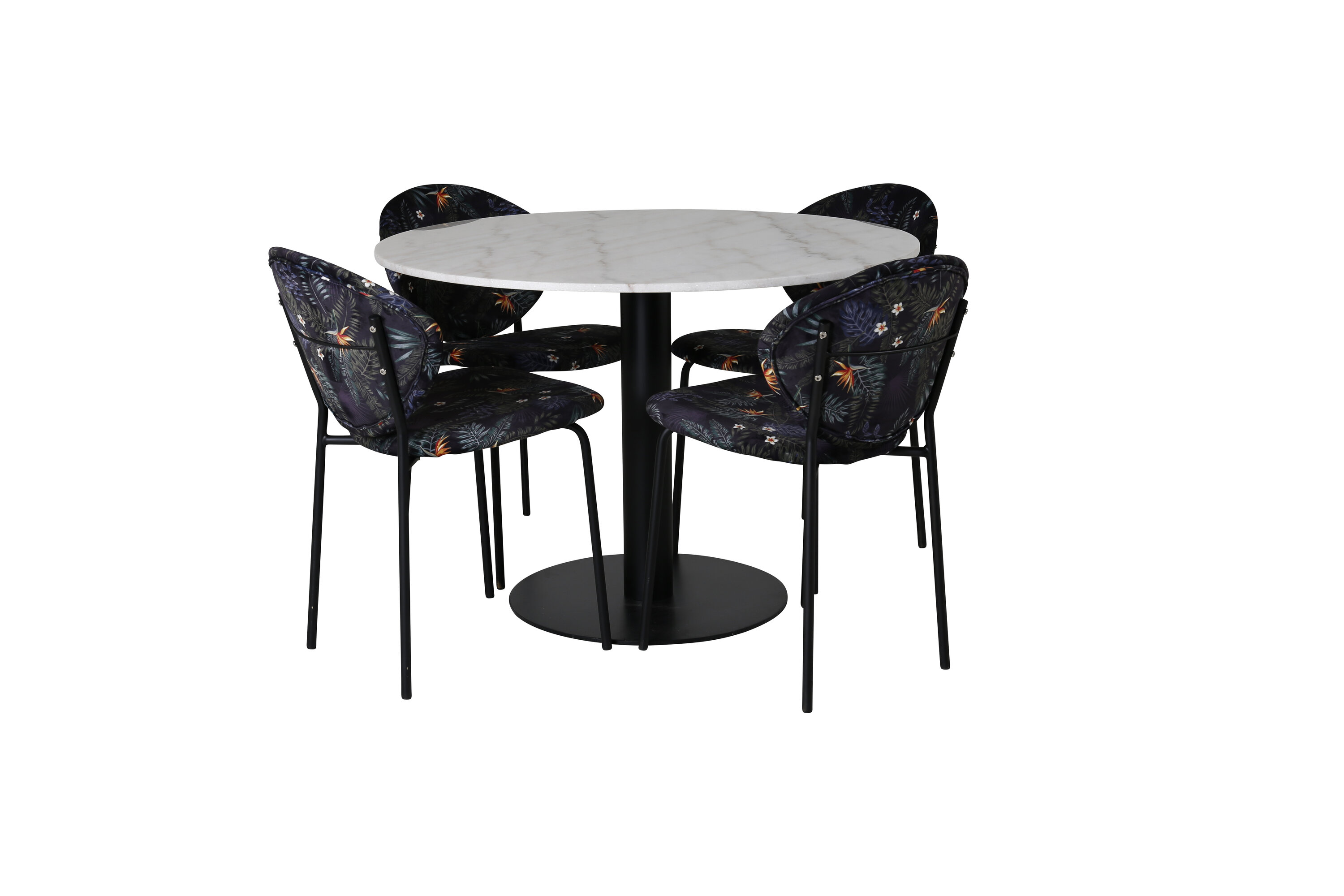 Meie stiilne marmorist välimusega söögilaud Estelle koos mustade lillemustriliste söögitoolidega. Lase kodu südant iseloomustada teie uus pilkupüüdev toidugrupp.