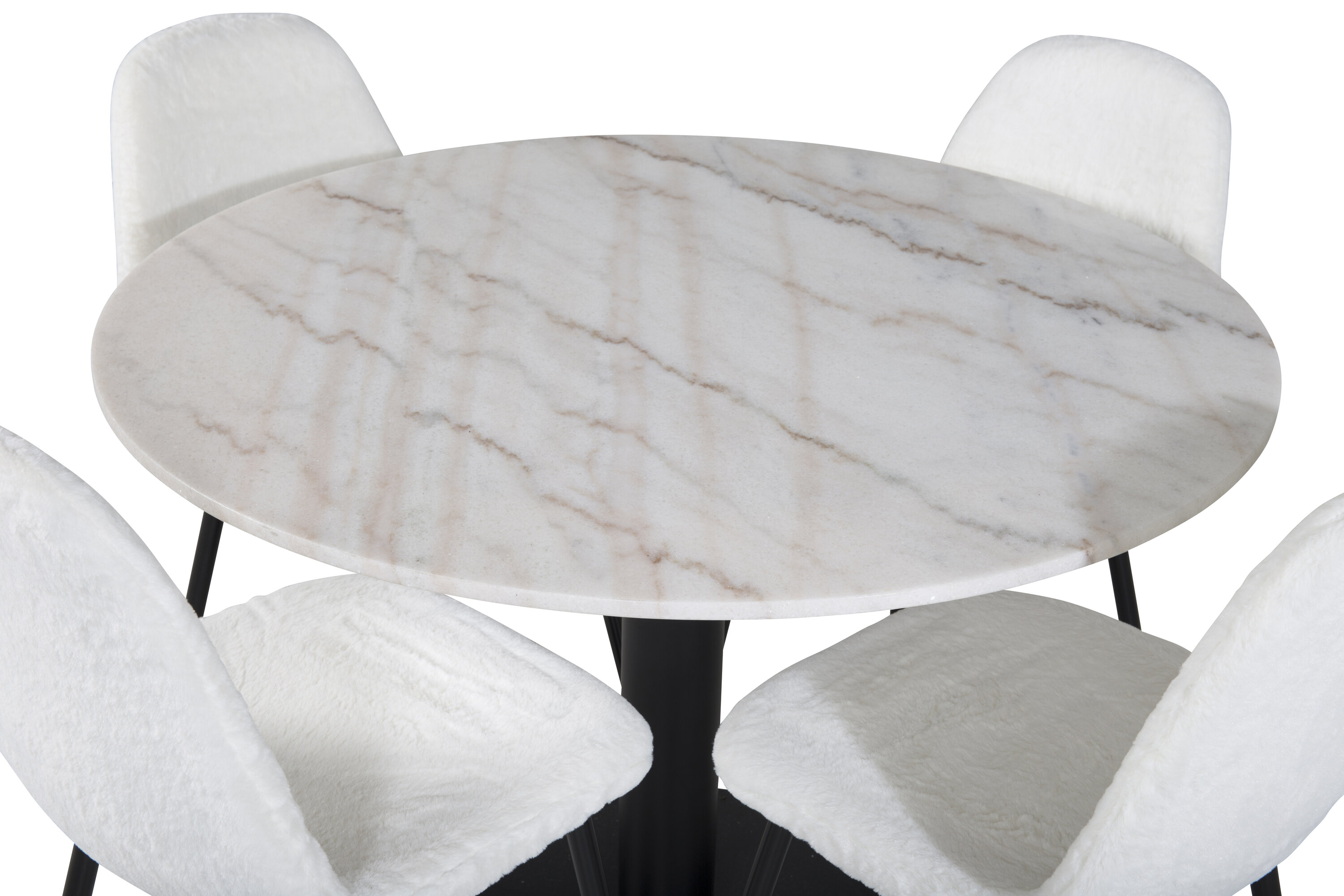 Peenikese disainiga söögilaud Estelle koos valgest kohevast polüestrist polaarsete söögitoolidega – ideaalne kombinatsioon neile, kes soovivad trendikat toidugruppi. Toolide kõrge istumismugavus kutsub teid pikkadele ja imelistele hetkedele suhtlemiseks!