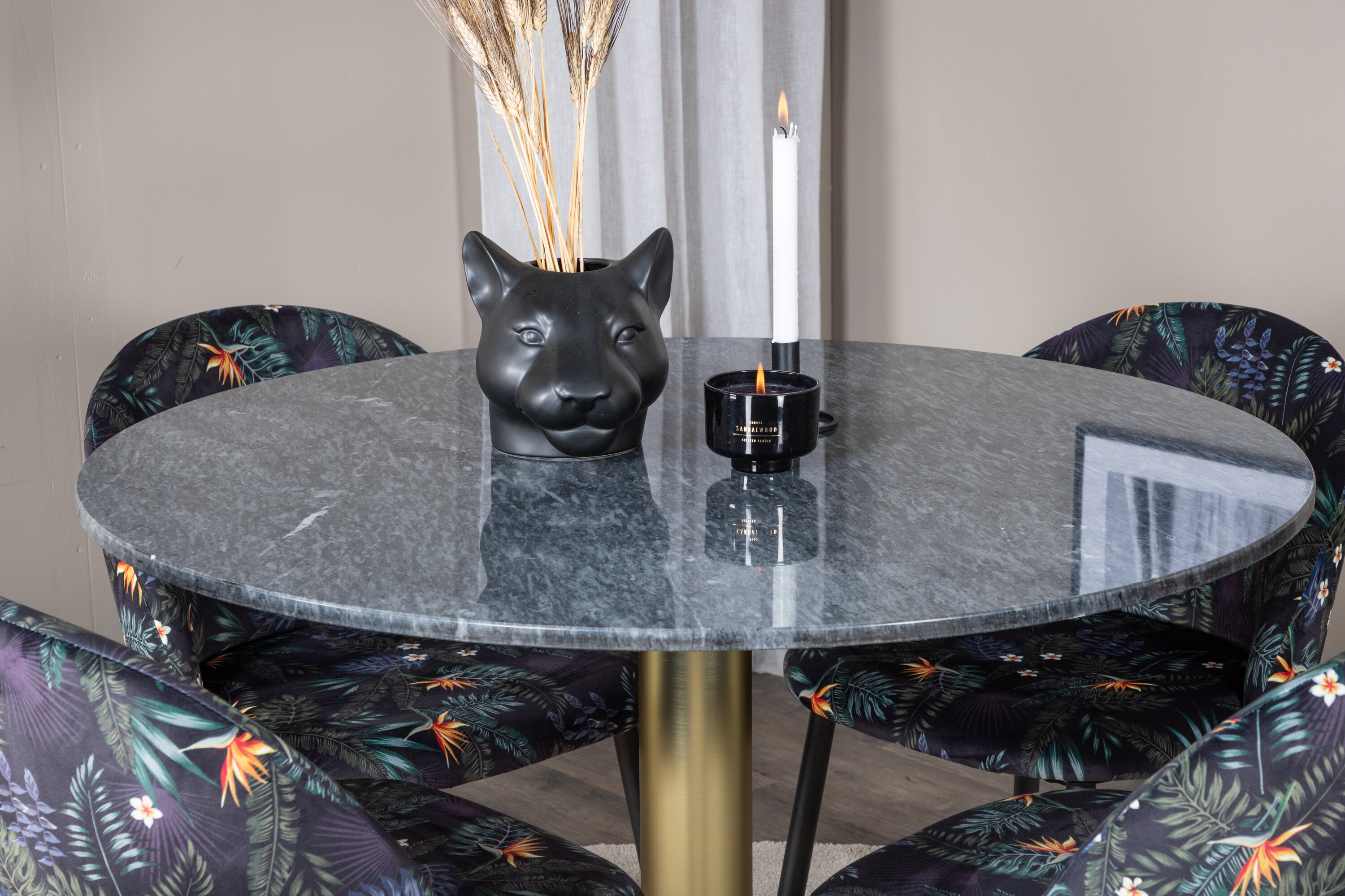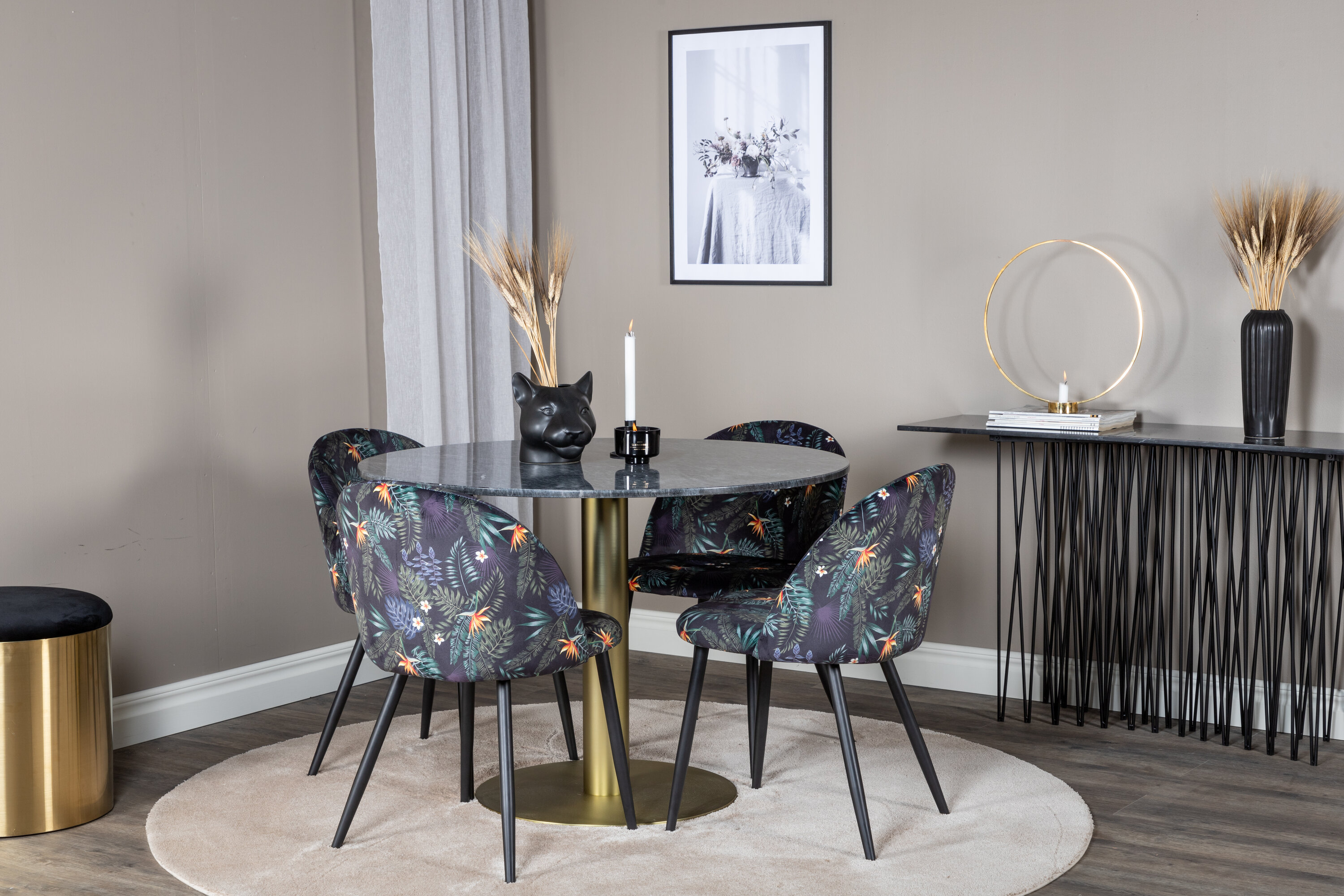 Elegantne kaunist marmorist söögilaud Estelle sarjas koos mugavate mustade lillemustriliste söögitoolidega sarjas Velvet loob toidugrupi, mida igatseda!