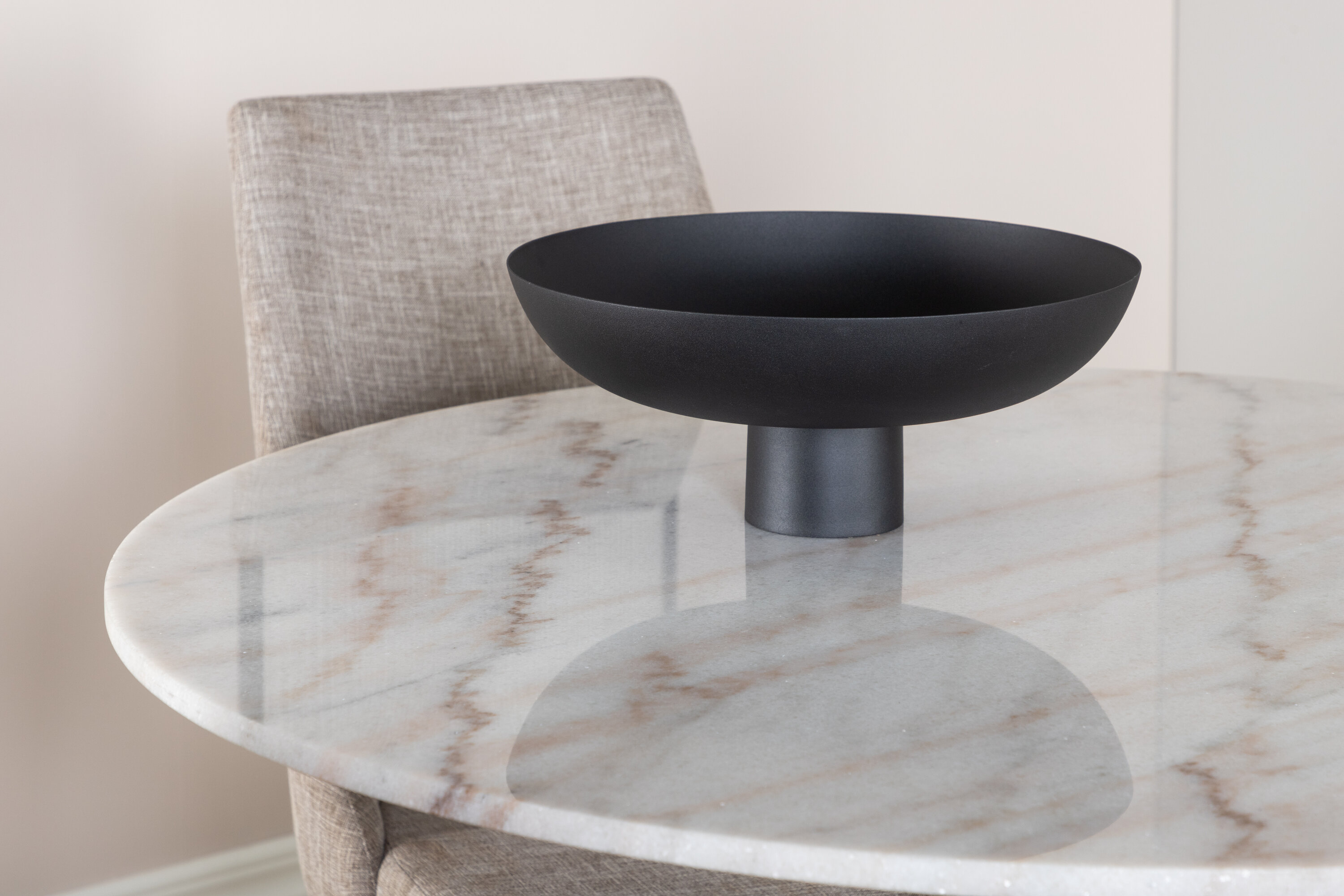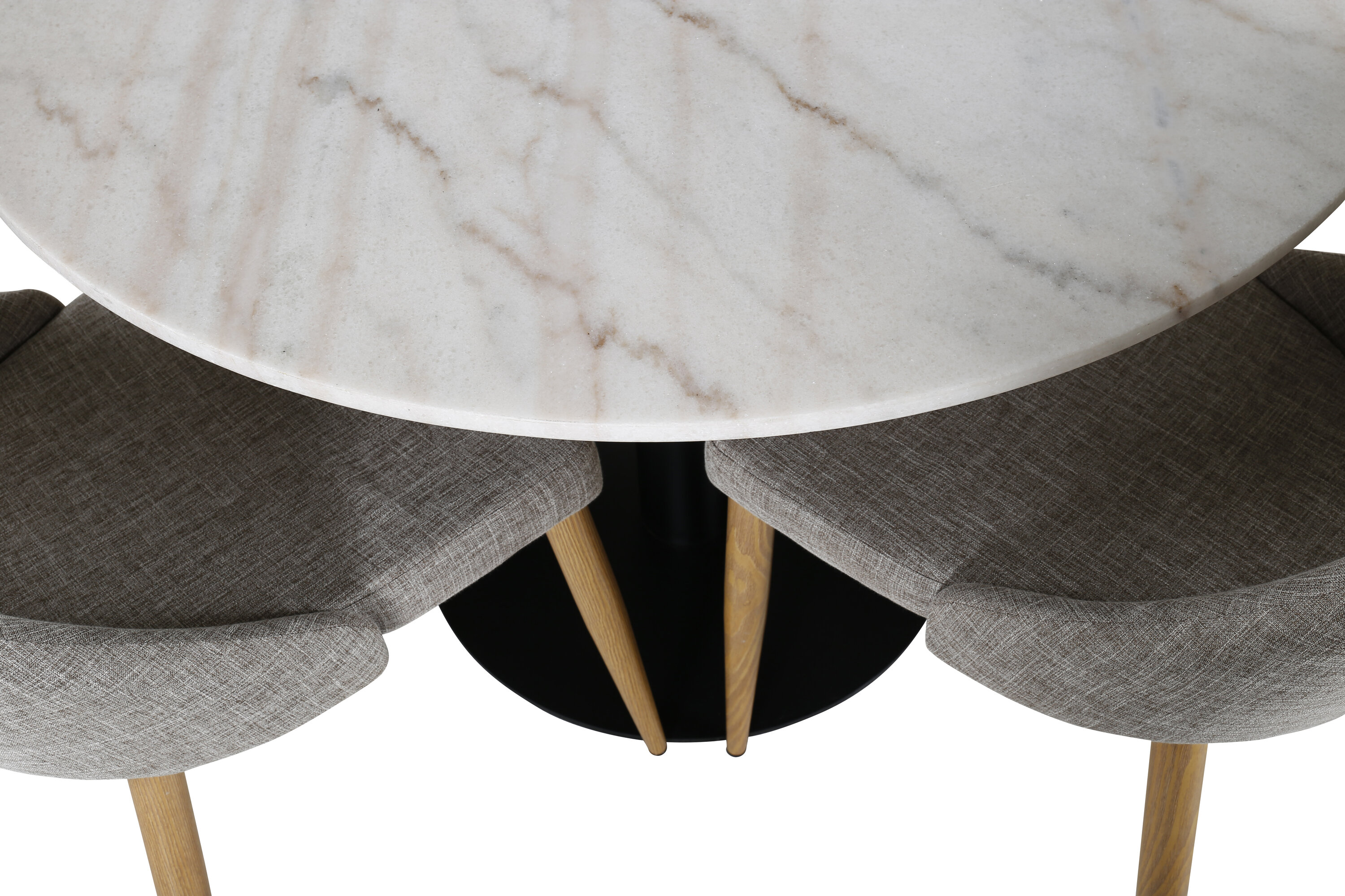 Moodsa ja stiilse disainiga toidugrupp. Meie ümmargune söögilaud Estelle on ühtaegu elegantne ja praktiline. Laual on valgest täpilisest marmorist läikiv lauaplaat ja mustast metallist silindriline alusvanker. See sobib ideaalselt Leone sarja toolidega. Toolidel on hästi läbimõeldud täielikult riietatud disain, mis on lihtne, tamme fooliumiga metallist luud ja pehme polsterdusega hallist polüesterkangast seljatugi/iste. Ära pea tegema kompromisse mugavuse ja pilkupüüdva vahel!