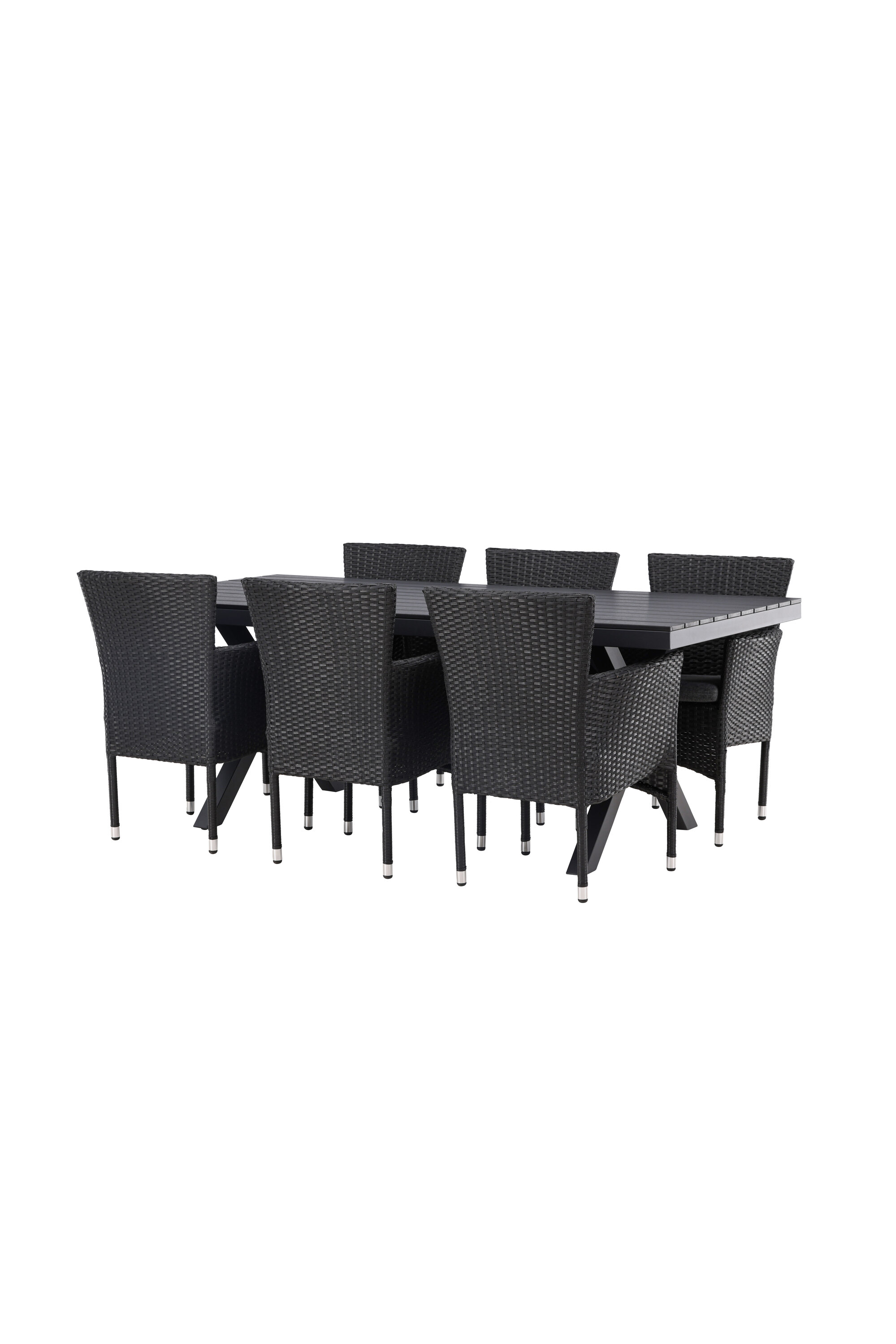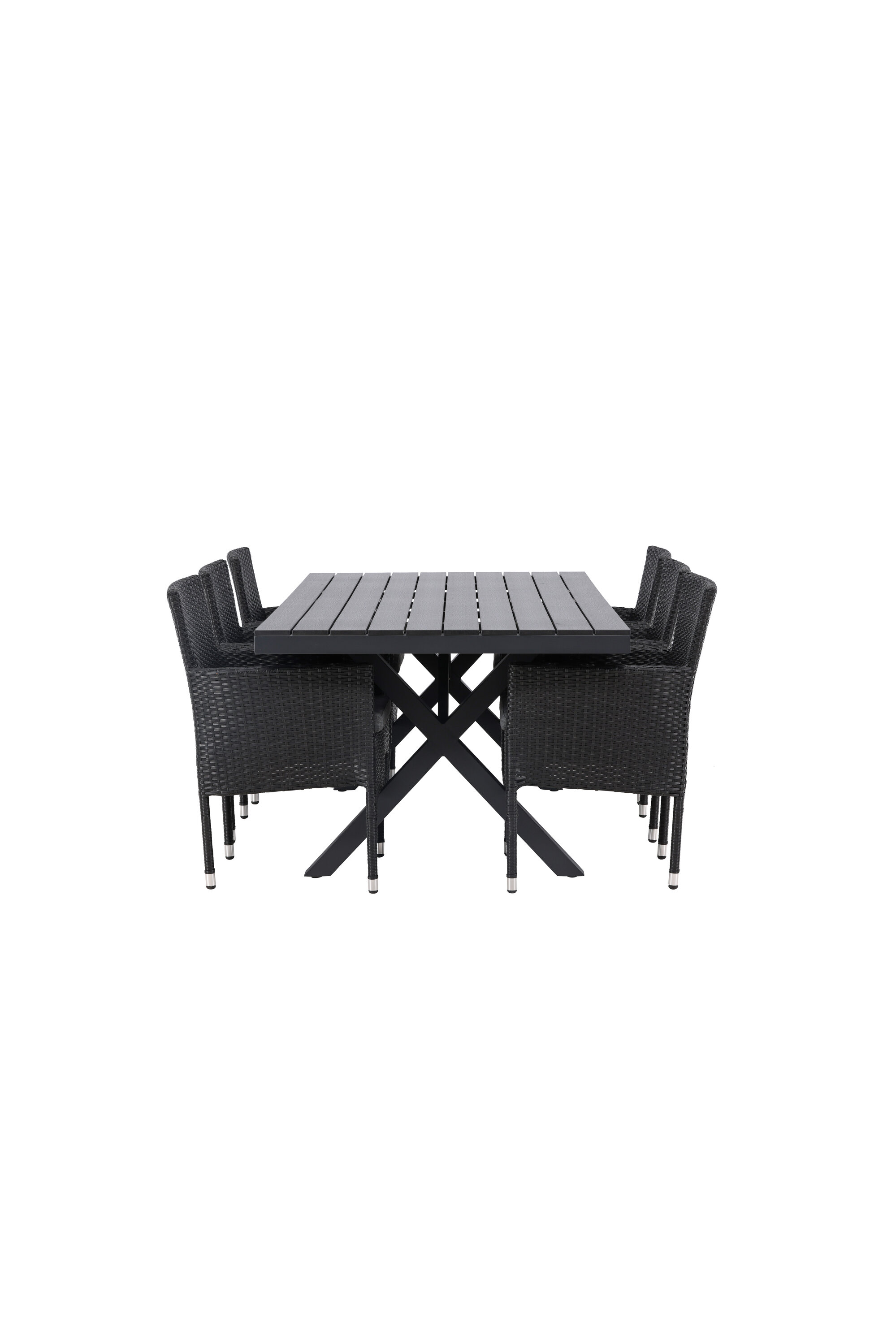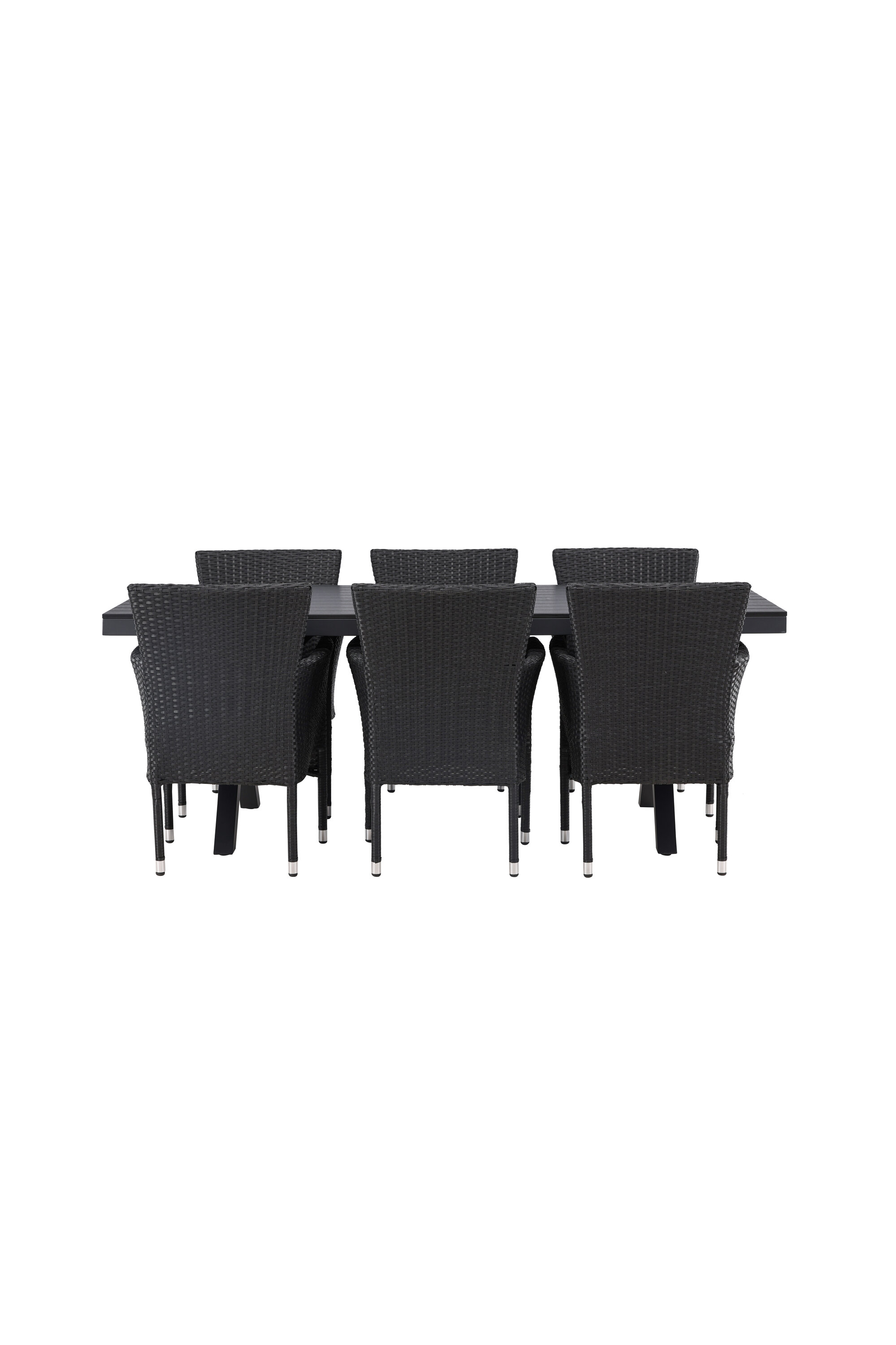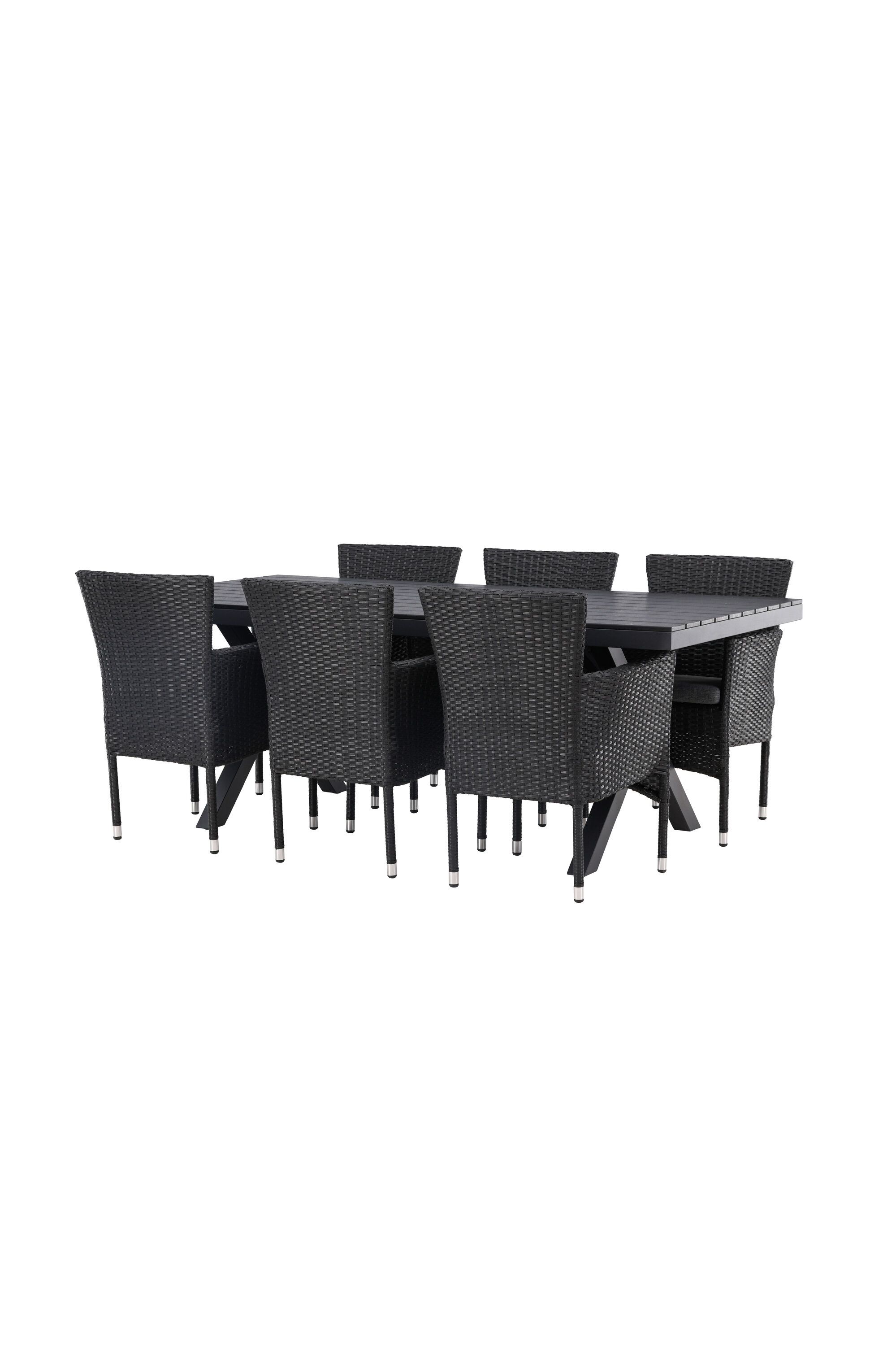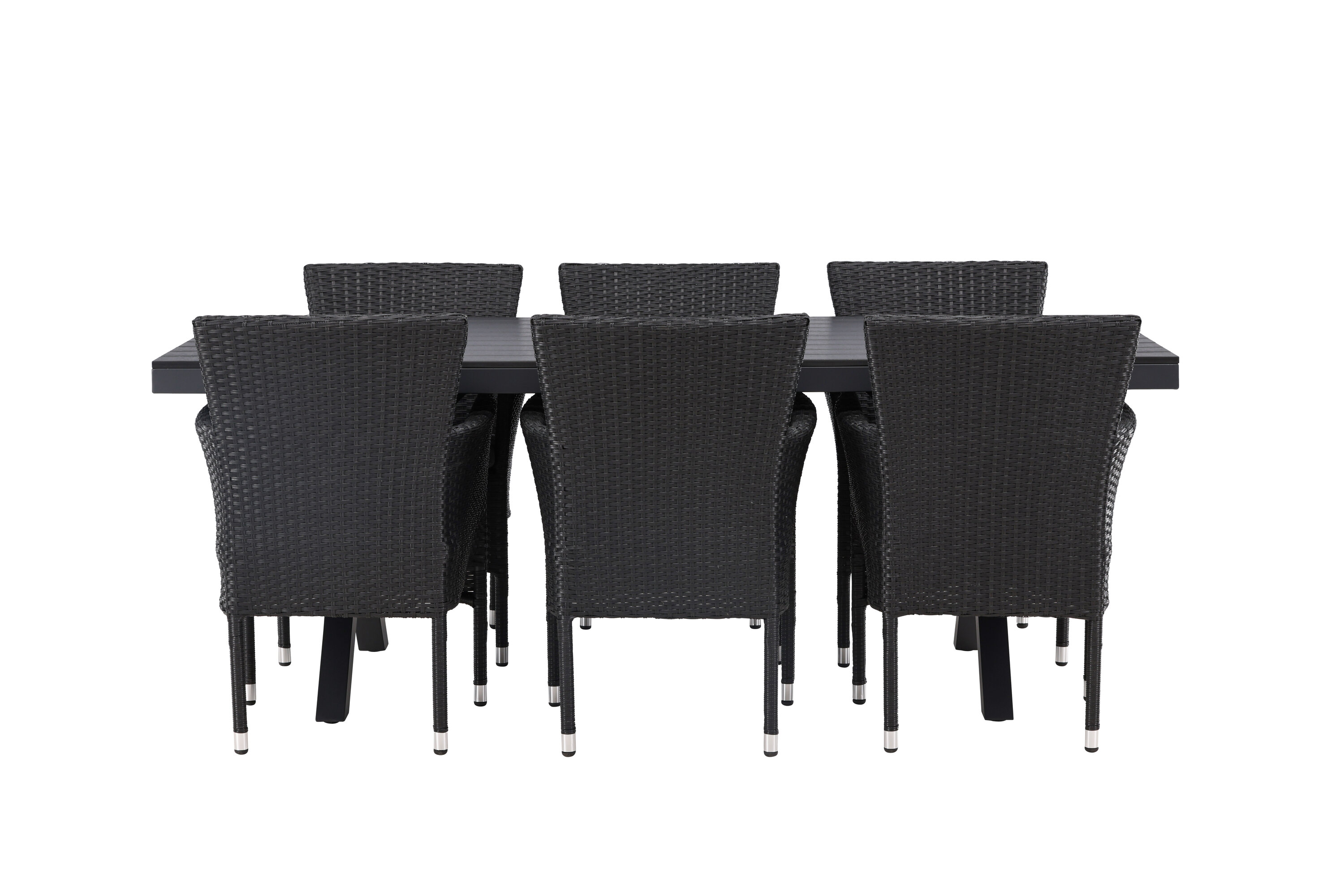 Selle söögigrupiga saate talveaeda või siseõue lihtsalt kaasaegselt ja mugavalt sisustada! Meie ristkülikukujuline Garcia söögilaud on klassikalise disainiga, mille lauaplaat on mustast aintpuidust ja ristatud lauajalad mustast alumiiniumist. Söögitoolid kuuluvad Malina sarja ja peavad kindlasti ajaproovile vastu. Toolil on alumiiniumraam ja see on kaetud põimitud musta kunstrotangiga. Kutsu oma sõpru tulevikus paljudele suurepärastele õuesöökidele! Laua mõõdud: 200x100cm.