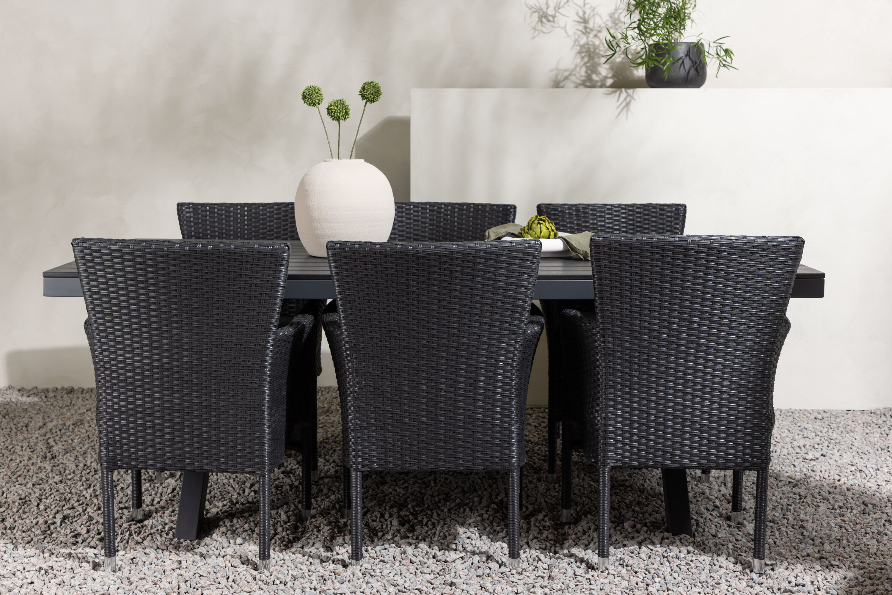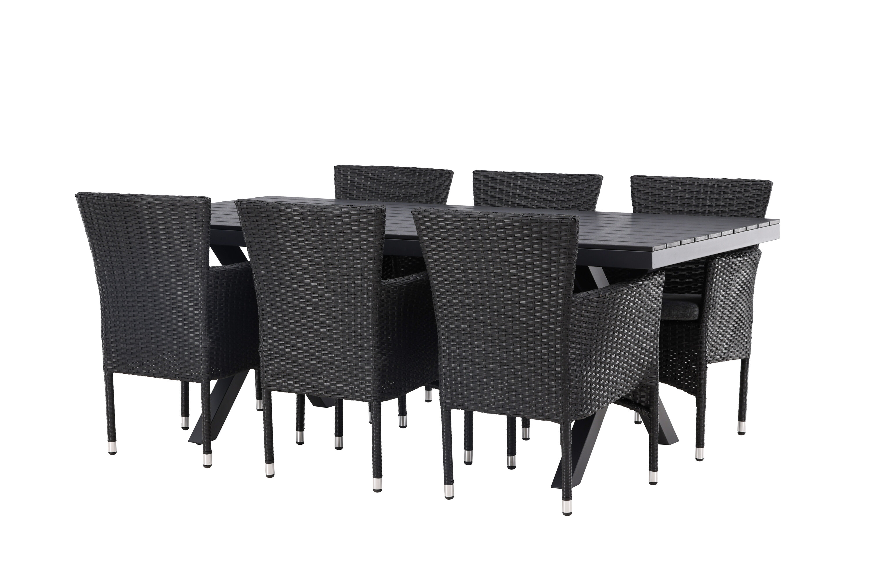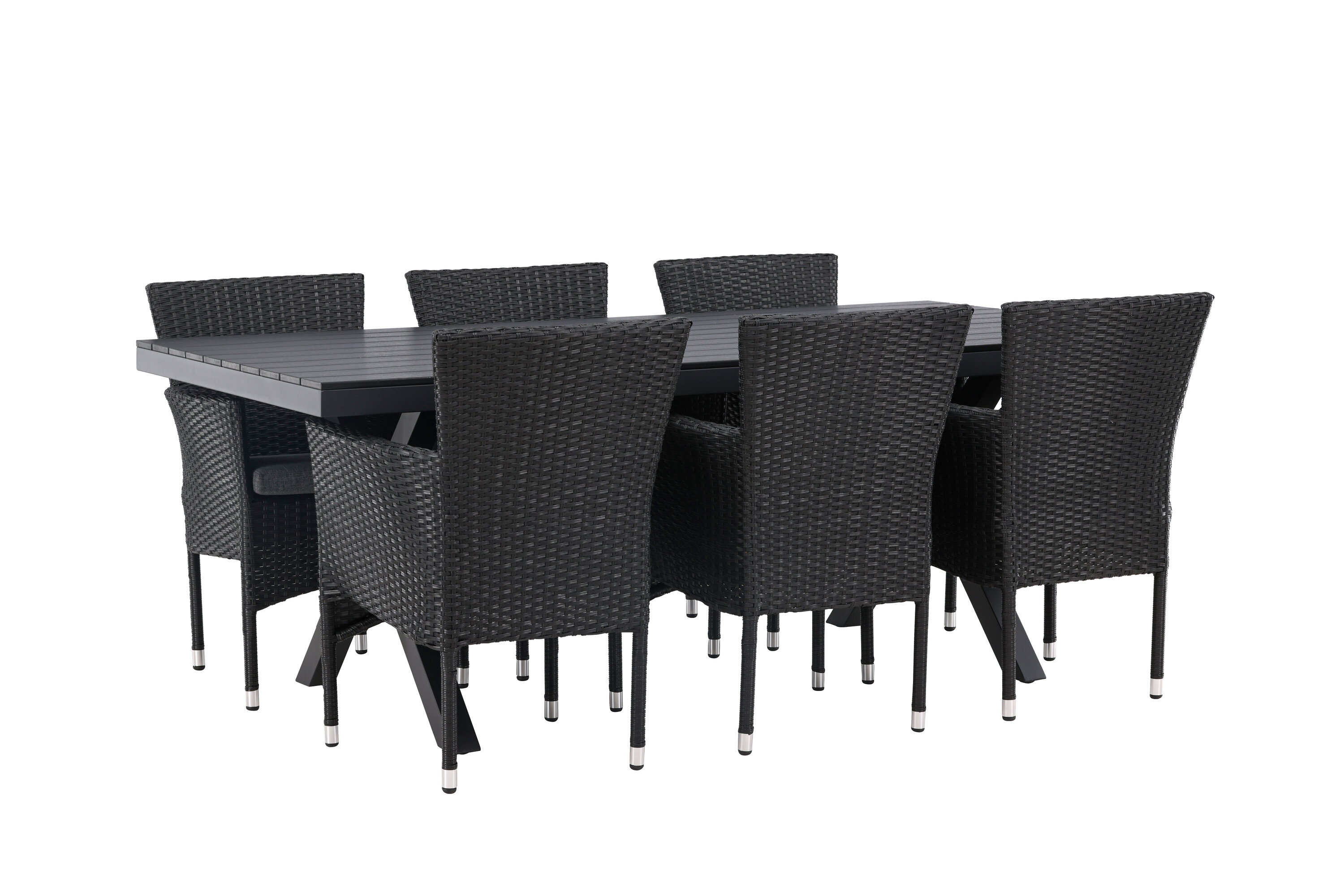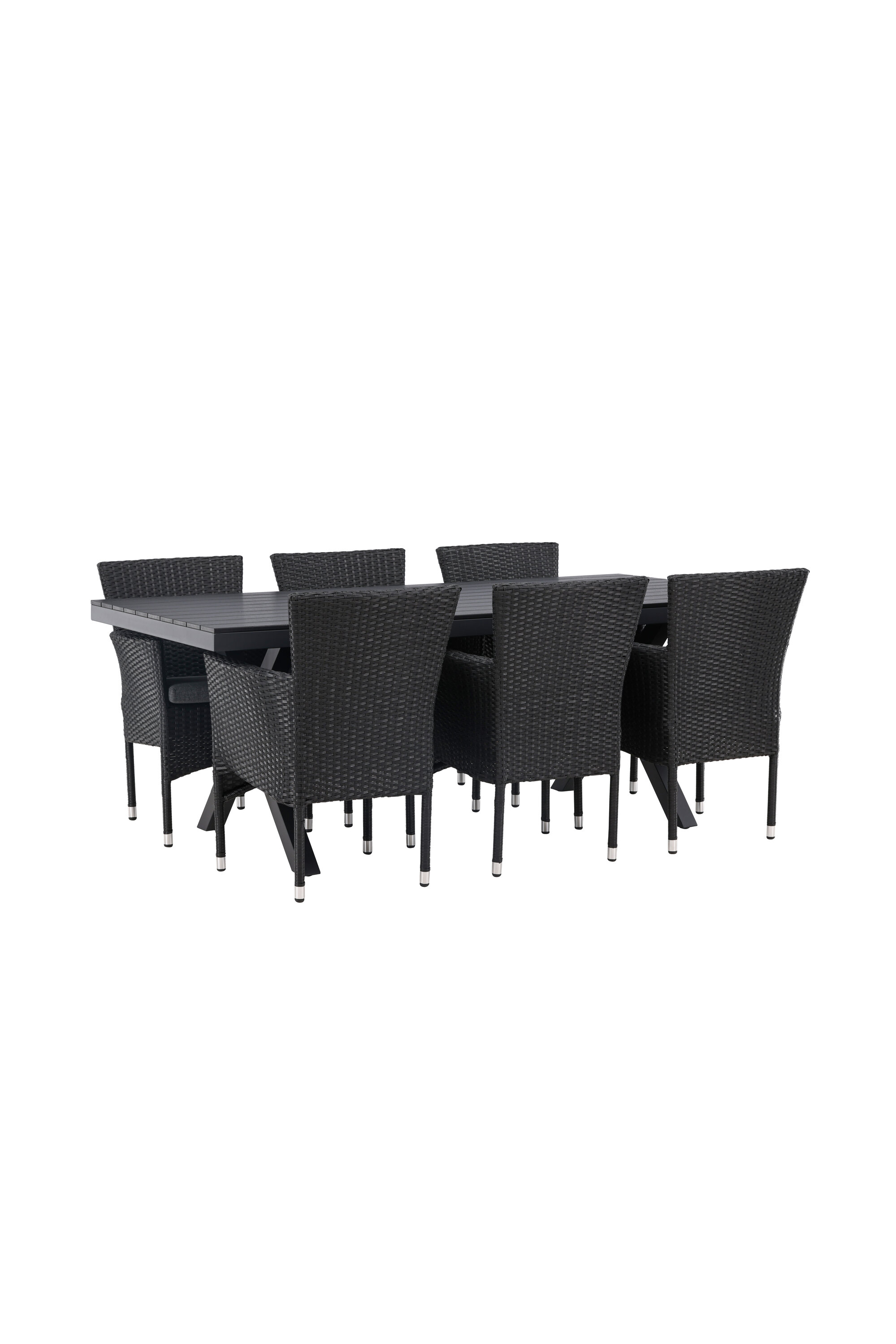 Selle söögigrupiga saate talveaeda või siseõue lihtsalt kaasaegselt ja mugavalt sisustada! Meie ristkülikukujuline Garcia söögilaud on klassikalise disainiga, mille lauaplaat on mustast aintpuidust ja ristatud lauajalad mustast alumiiniumist. Söögitoolid kuuluvad Malina sarja ja peavad kindlasti ajaproovile vastu. Toolil on alumiiniumraam ja see on kaetud põimitud musta kunstrotangiga. Kutsu oma sõpru tulevikus paljudele suurepärastele õuesöökidele! Laua mõõdud: 200x100cm.