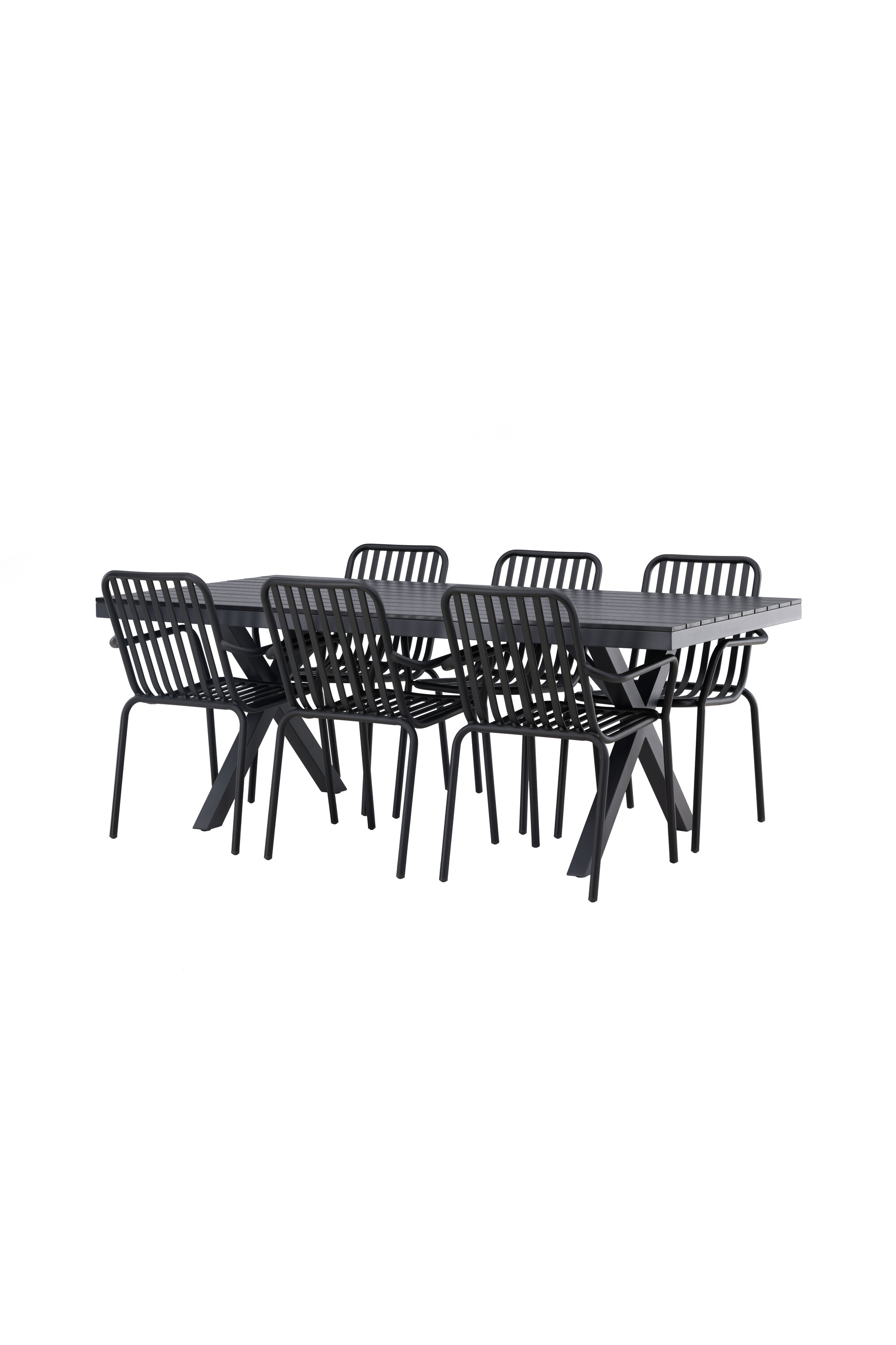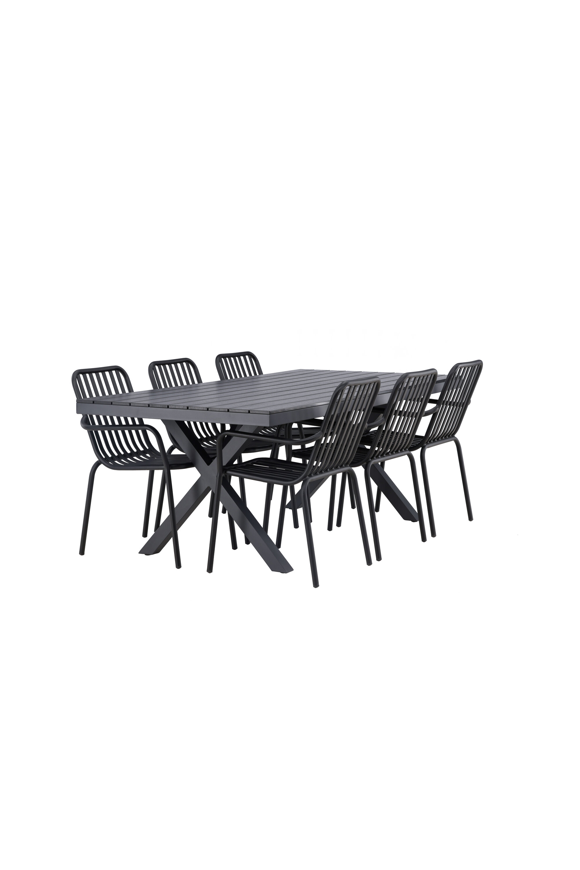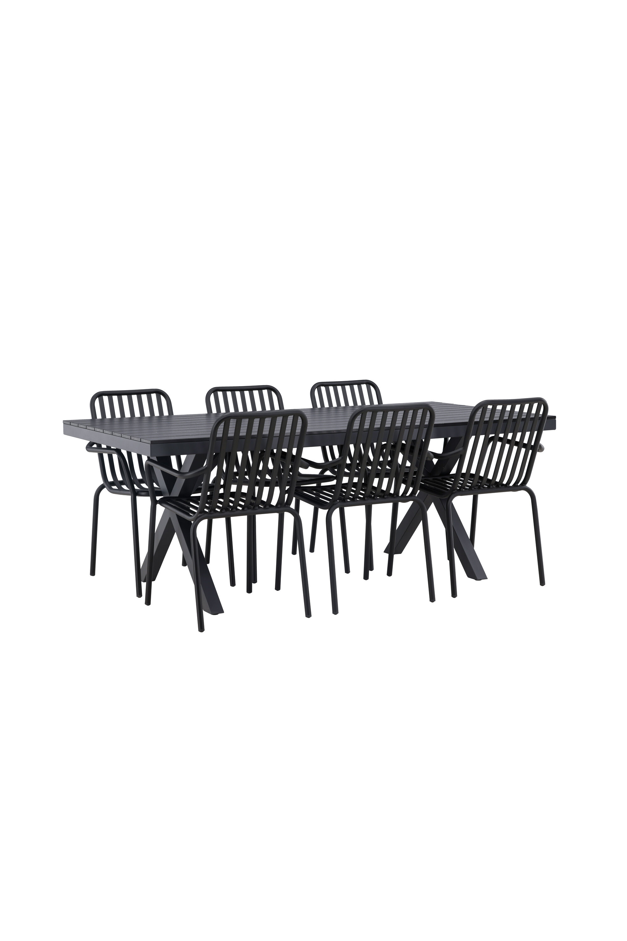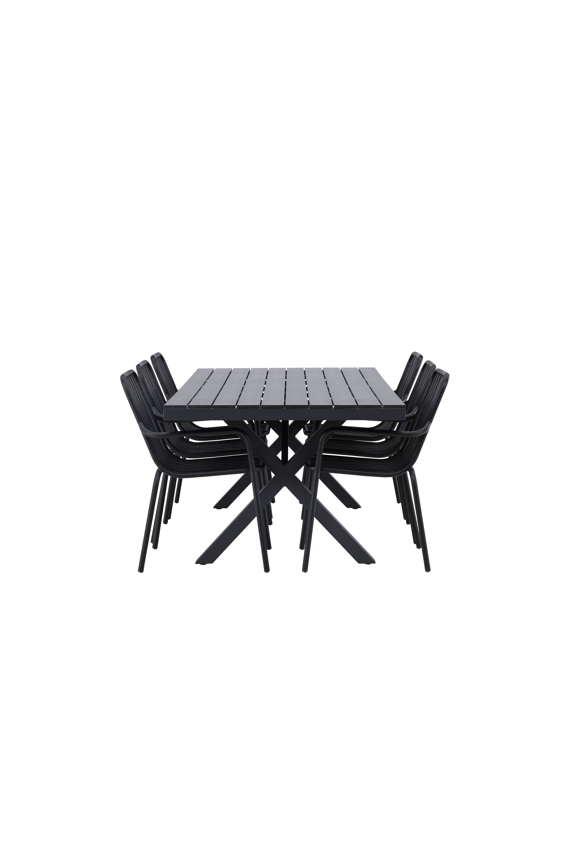 Üleni musta söögigrupiga ei saa kunagi valesti minna! Meie ristkülikukujuline Garcia söögilaud on klassikalise disainiga, mille lauaplaat on mustast aintpuidust ja ristatud lauajalad mustast alumiiniumist. Siin on stiilne kombinatsioon meie moodsate Pekingi seeria söögitoolidega. Tooli soonik disain ja tahmane must värv muudavad selle nii modernseks kui ka ajatuks. Valmistatud alumiiniumist, kerge kaal, mis muudab selle hõlpsaks liigutamiseks ja integreeritud käetoed lisamugavuse tagamiseks. Sisusta oma terrass kutsuvalt ja trendikindlalt! Laua mõõdud: 200x100cm.
