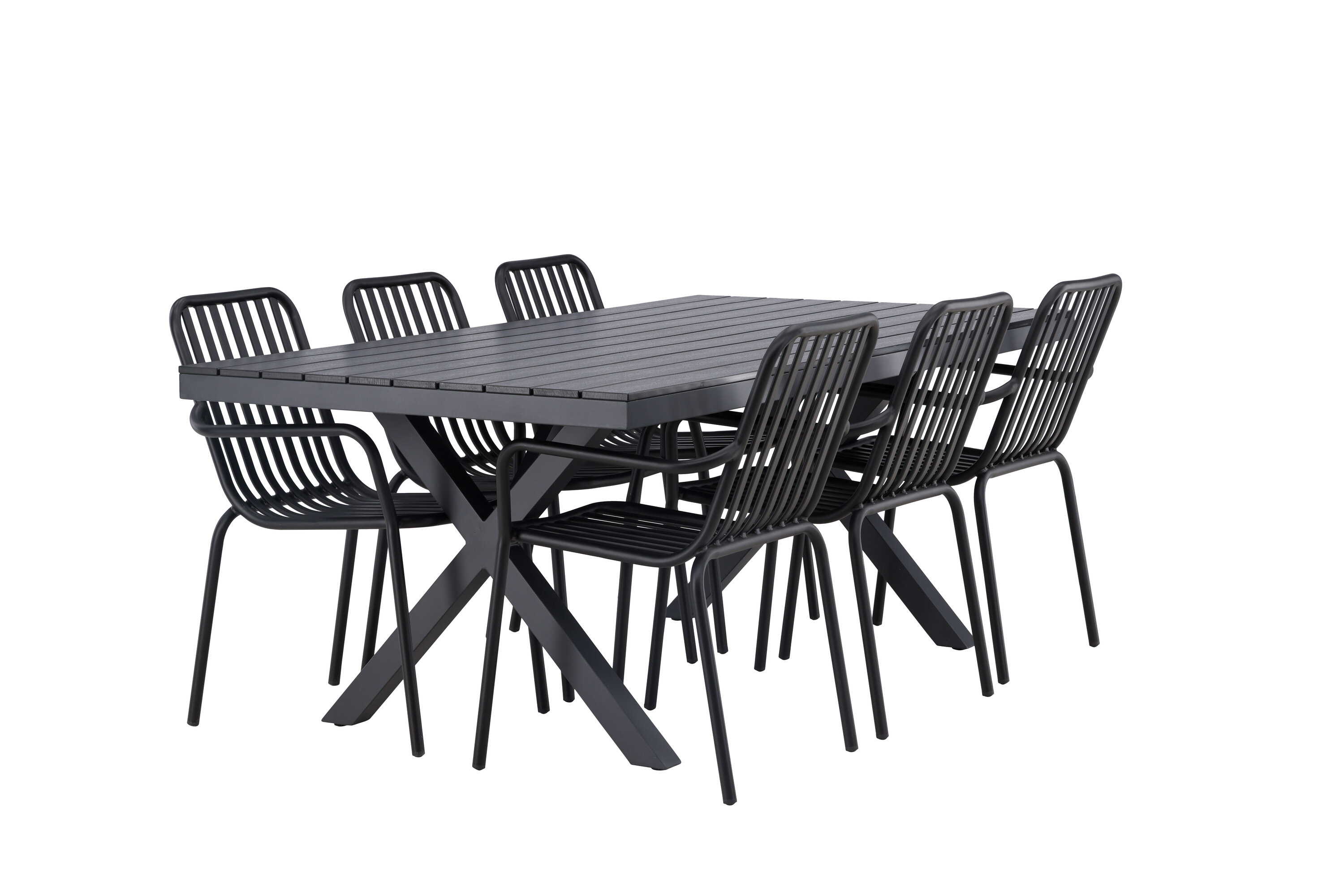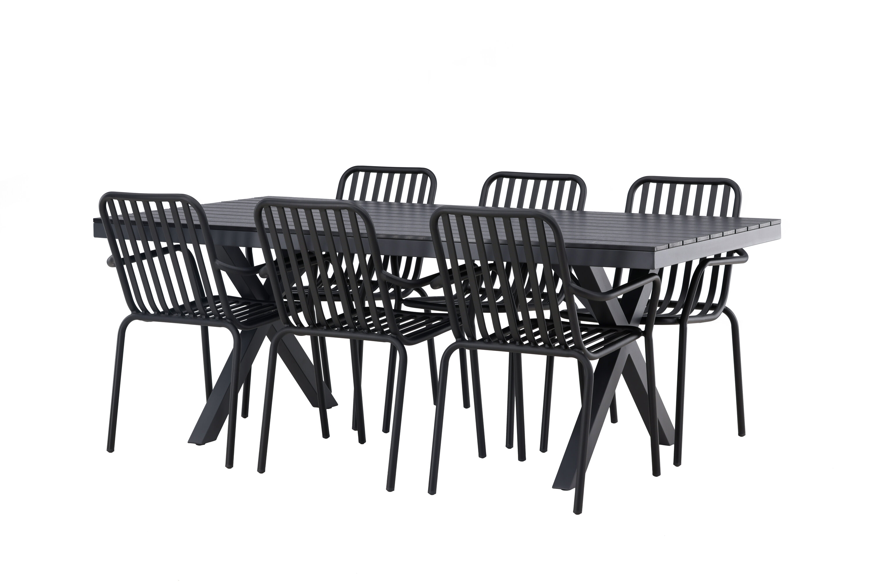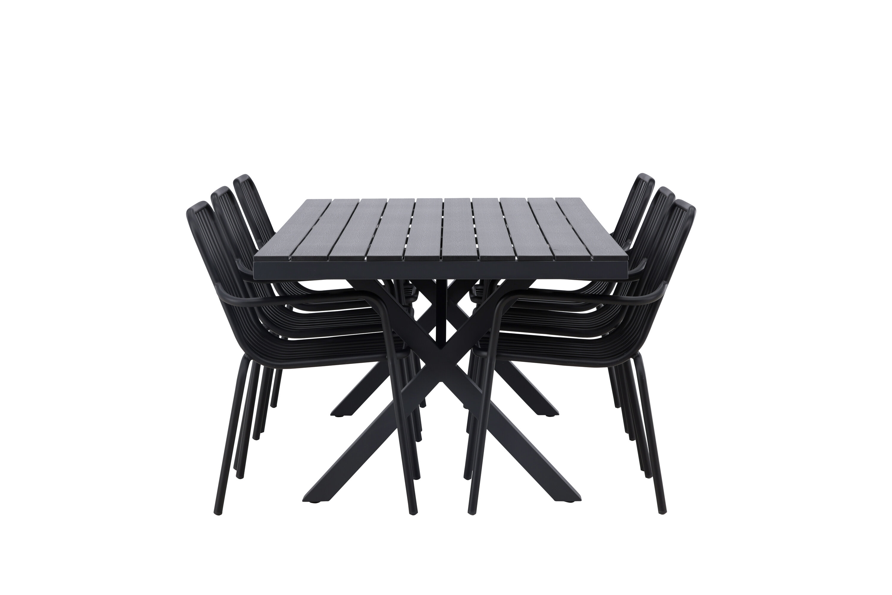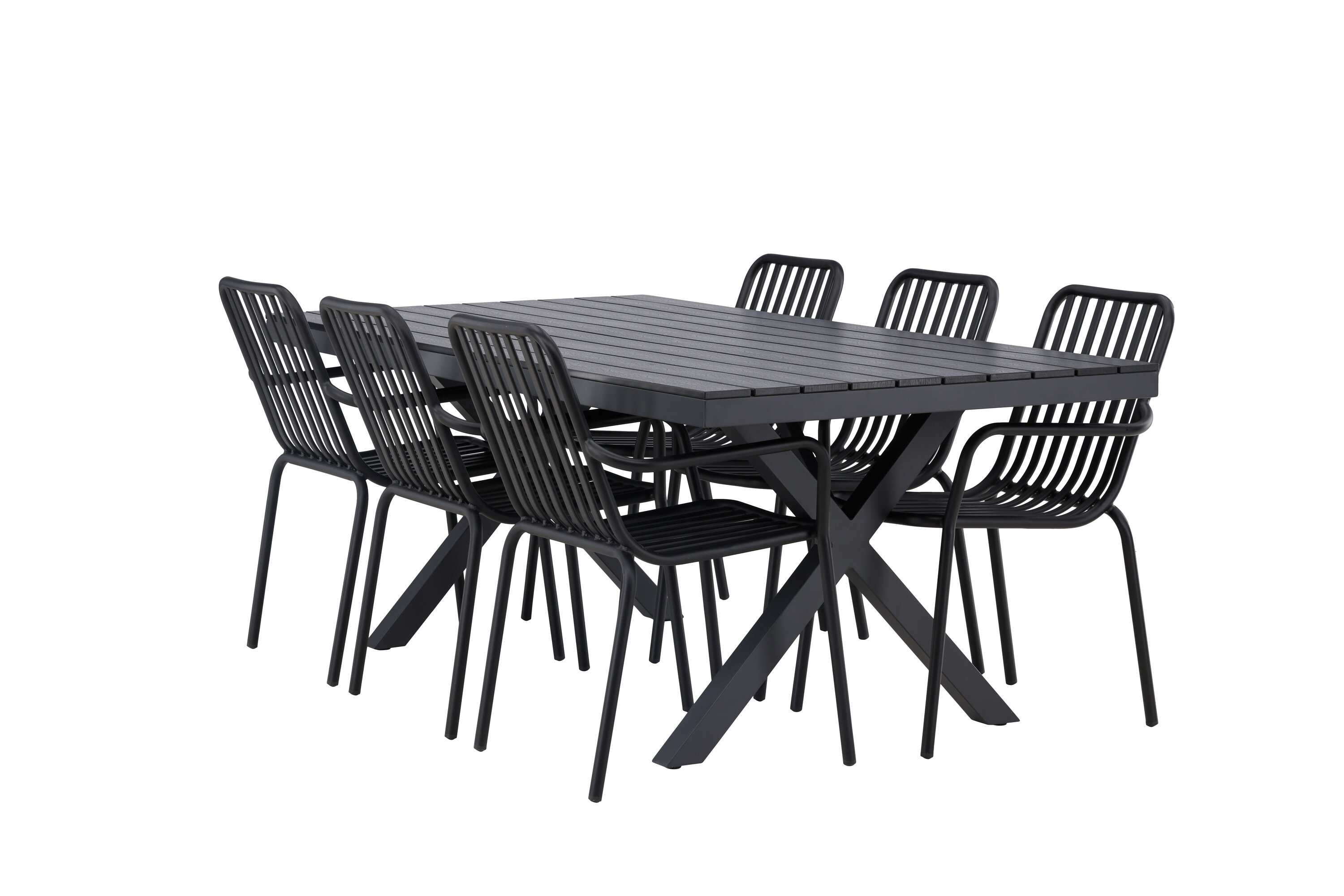 Üleni musta söögigrupiga ei saa kunagi valesti minna! Meie ristkülikukujuline Garcia söögilaud on klassikalise disainiga, mille lauaplaat on mustast aintpuidust ja ristatud lauajalad mustast alumiiniumist. Siin on stiilne kombinatsioon meie moodsate Pekingi seeria söögitoolidega. Tooli soonik disain ja tahmane must värv muudavad selle nii modernseks kui ka ajatuks. Valmistatud alumiiniumist, kerge kaal, mis muudab selle hõlpsaks liigutamiseks ja integreeritud käetoed lisamugavuse tagamiseks. Sisusta oma terrass kutsuvalt ja trendikindlalt! Laua mõõdud: 200x100cm.