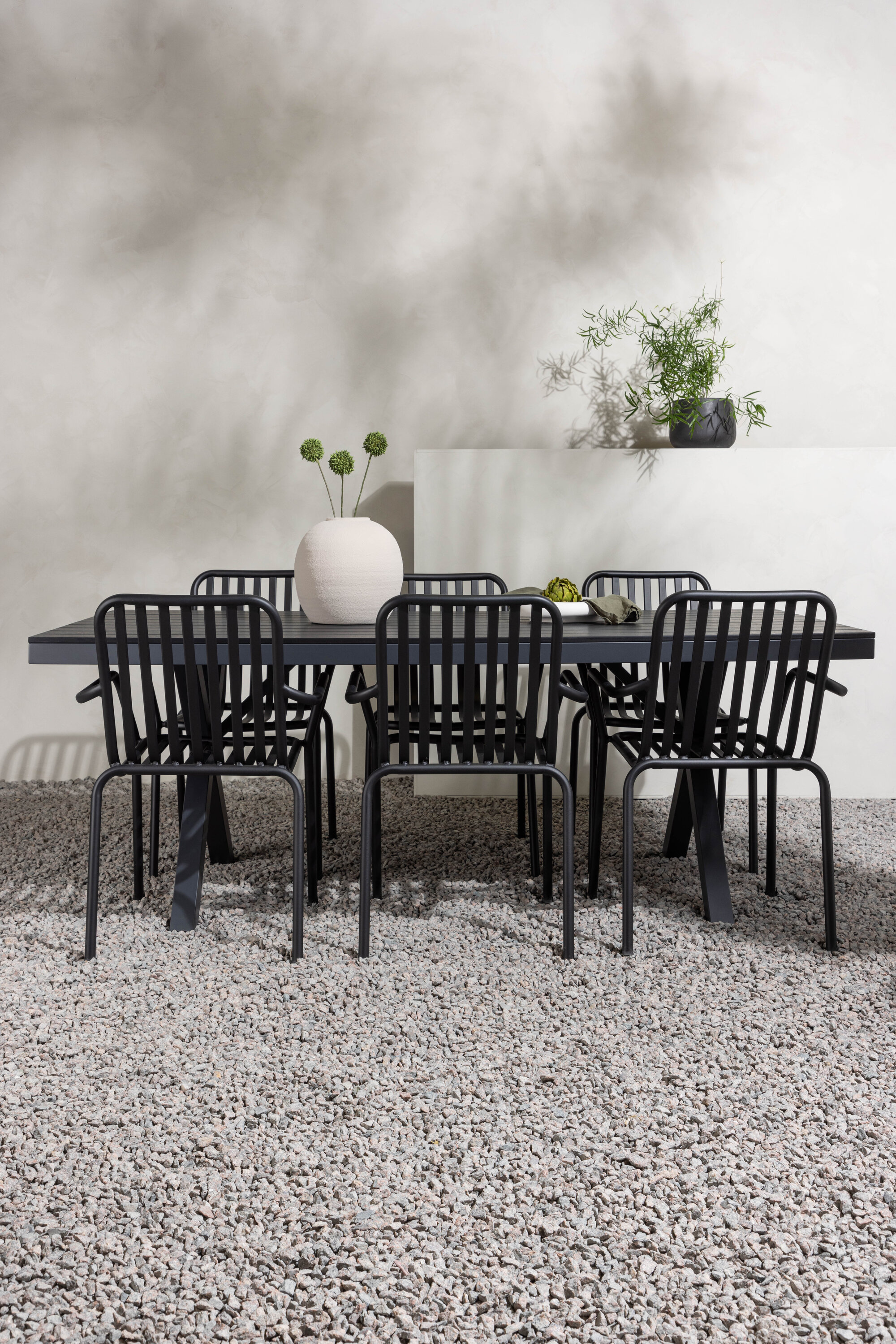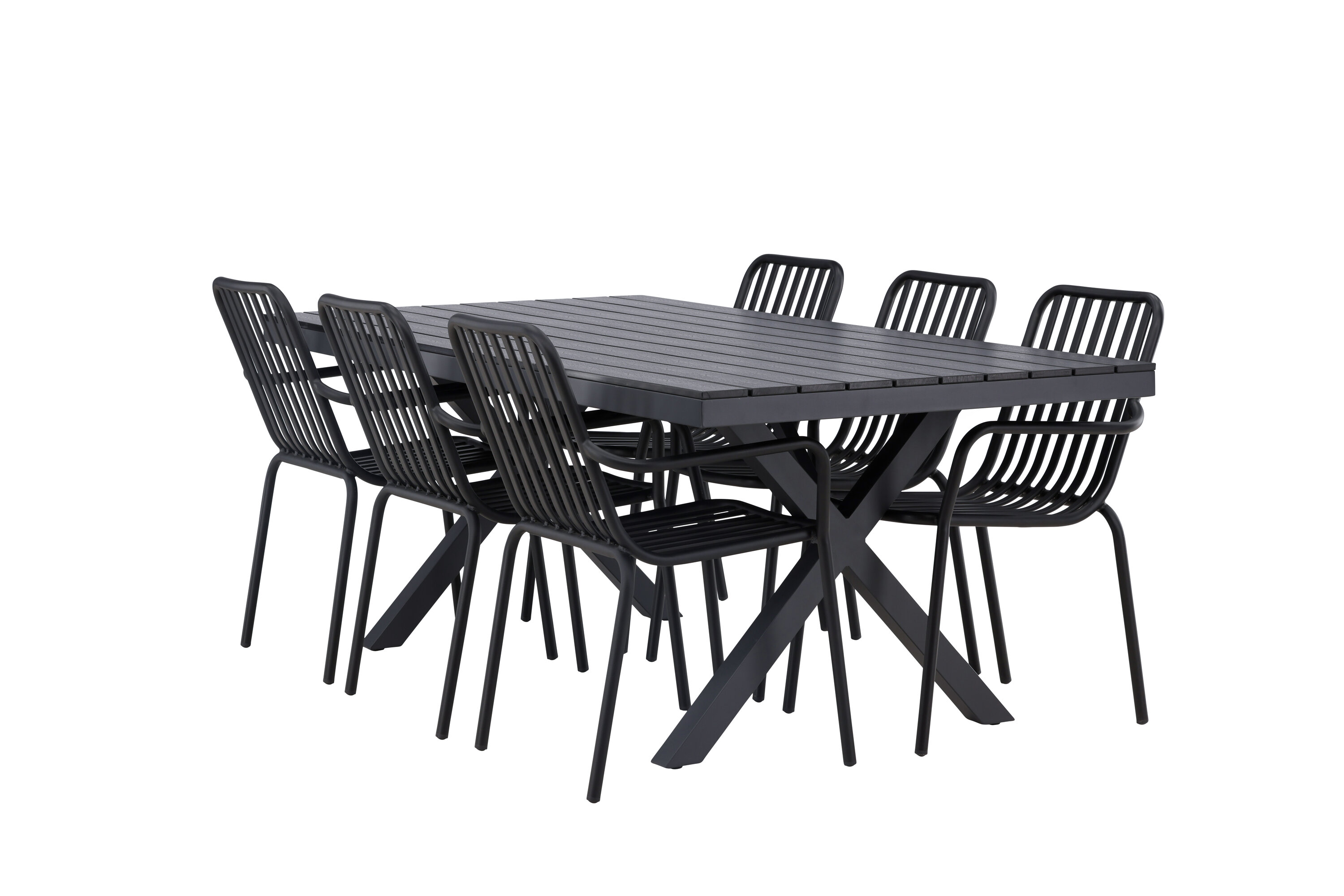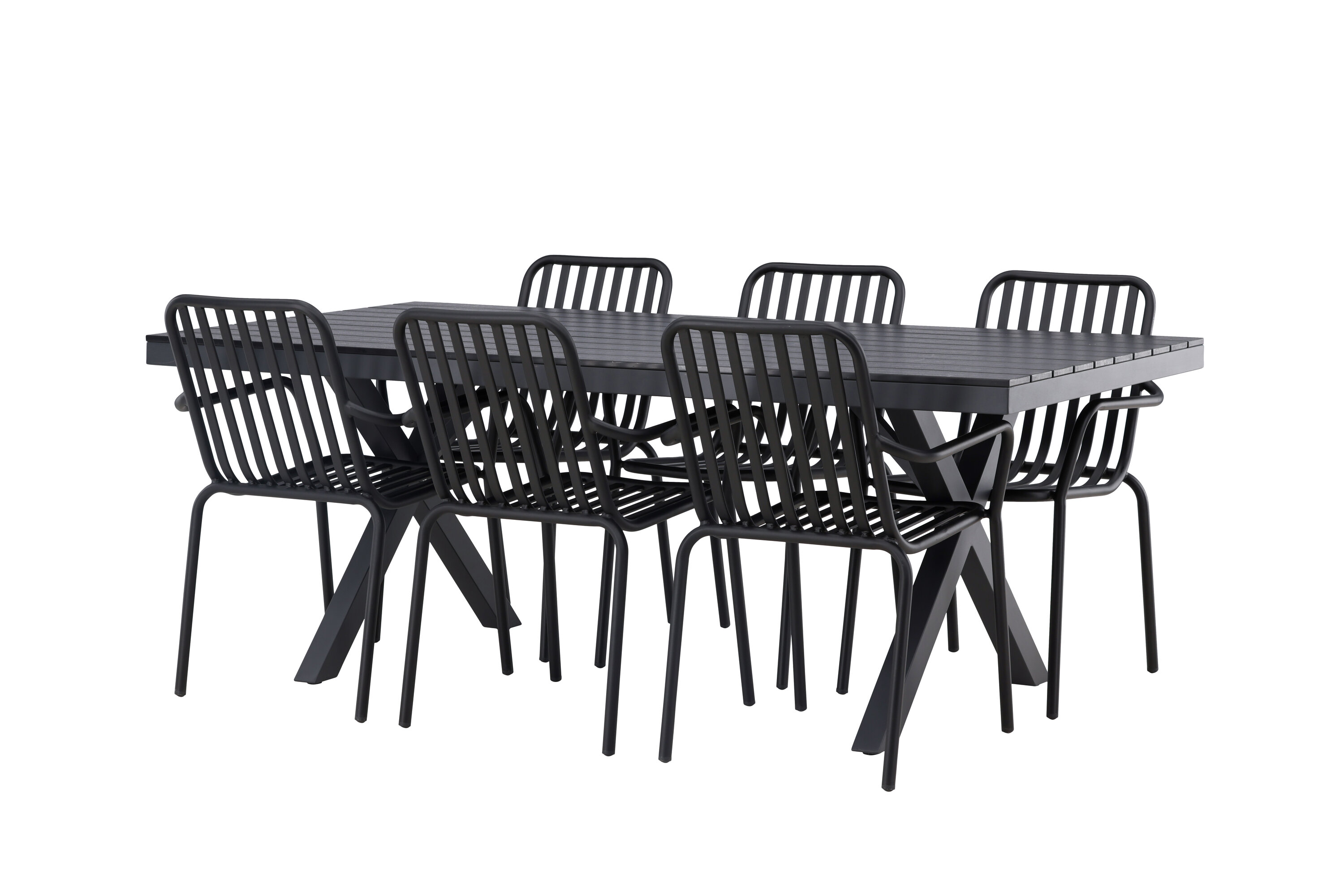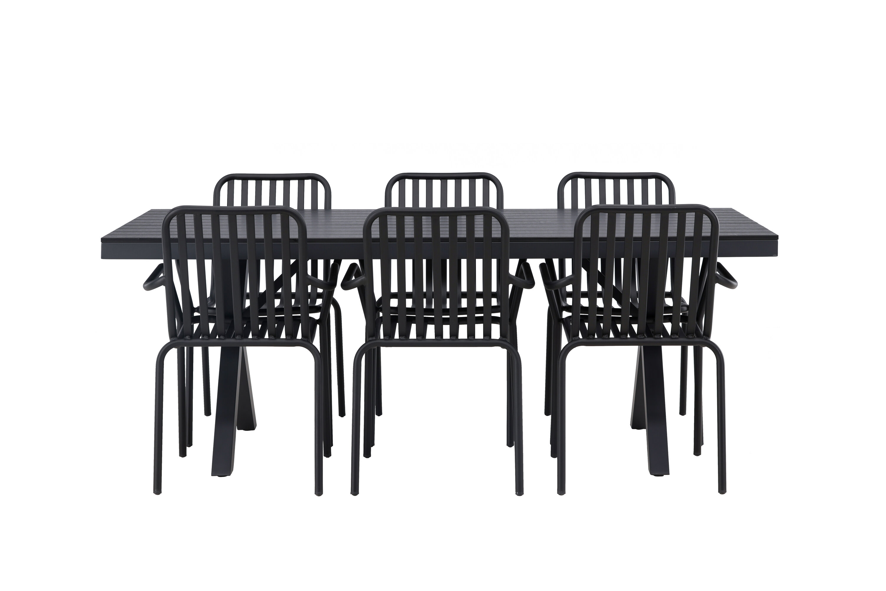 Üleni musta söögigrupiga ei saa kunagi valesti minna! Meie ristkülikukujuline Garcia söögilaud on klassikalise disainiga, mille lauaplaat on mustast aintpuidust ja ristatud lauajalad mustast alumiiniumist. Siin on stiilne kombinatsioon meie moodsate Pekingi seeria söögitoolidega. Tooli soonik disain ja tahmane must värv muudavad selle nii modernseks kui ka ajatuks. Valmistatud alumiiniumist, kerge kaal, mis muudab selle hõlpsaks liigutamiseks ja integreeritud käetoed lisamugavuse tagamiseks. Sisusta oma terrass kutsuvalt ja trendikindlalt! Laua mõõdud: 200x100cm.