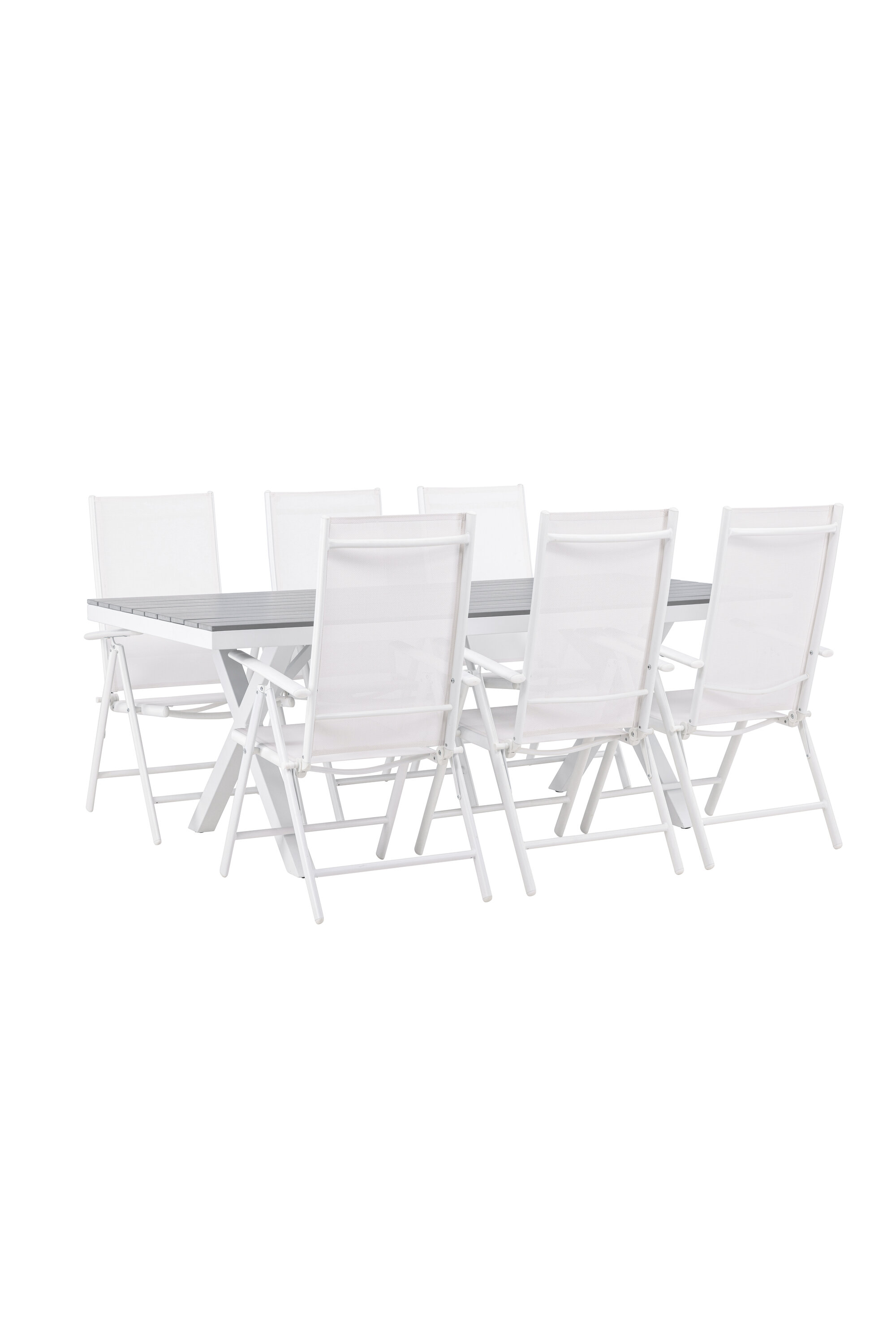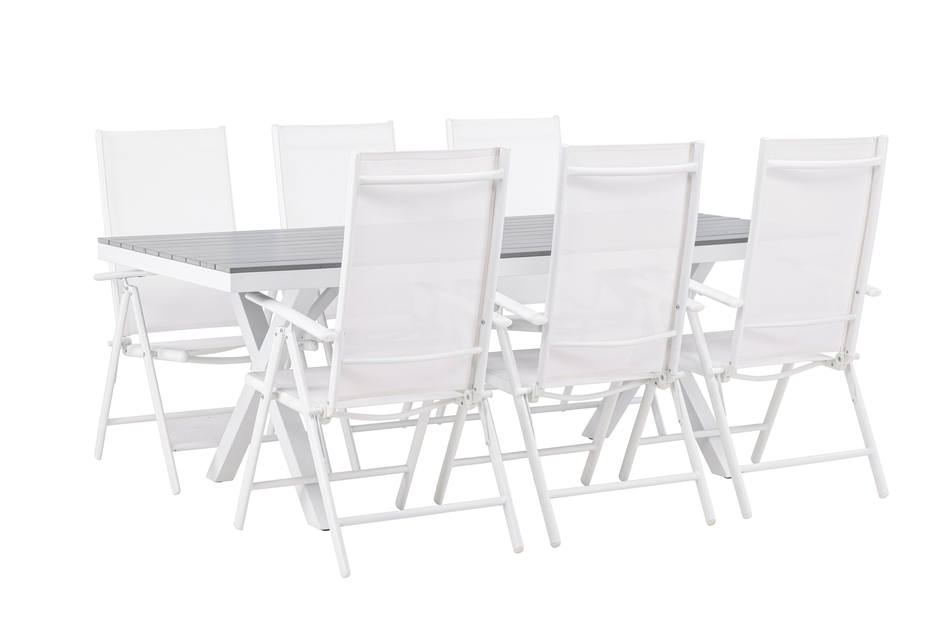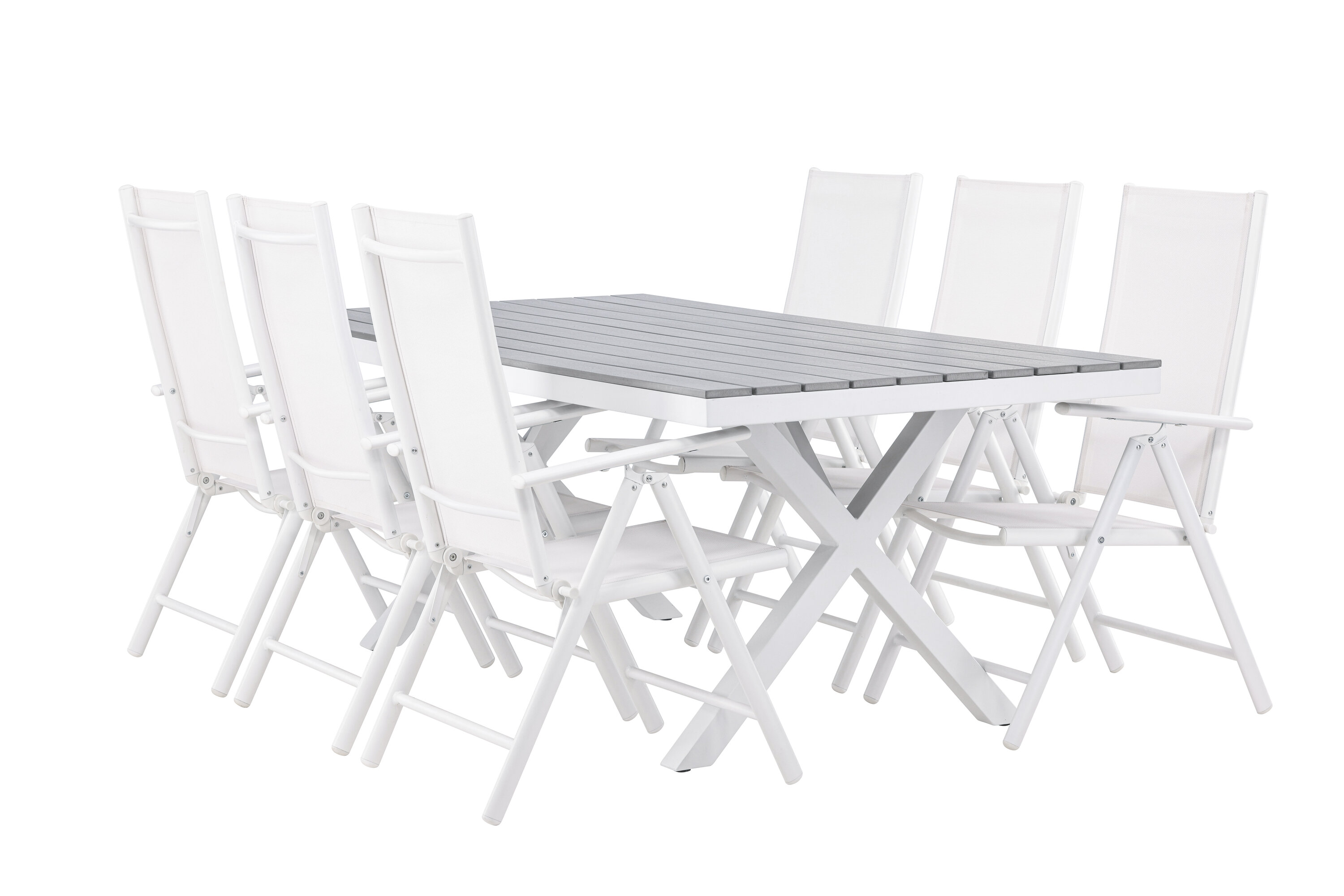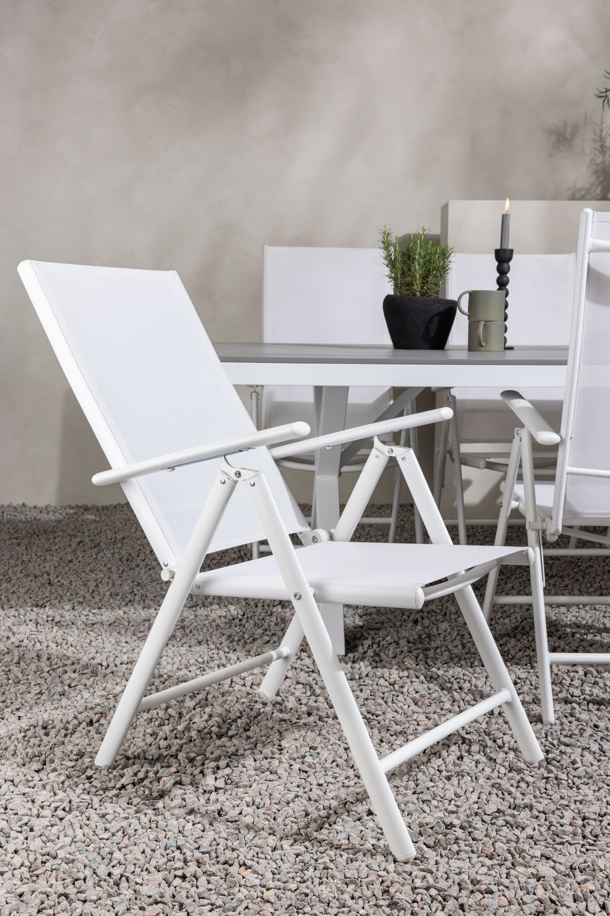 Loo oma terrassile särav ja luksuslik pilgupüüdja! Meie ristkülikukujuline söögilaud Garcia on klassikalise disainiga, mille lauaplaat on maitsekas aintpuidust ja ristatud lauajalad valgest alumiiniumist. Siin koos meie sama sarja kokkupandavate söögitoolidega: Break. Tooli iste on valgest tekstiilist ja toolijalad valgest alumiiniumist. Kokkupandav funktsioon annab teile praktilise ja kõrge mugavuse tasemega tooli. Olge sel suvel valmis silmapaistvaks ööeluks! Laua mõõdud: 200x100cm.