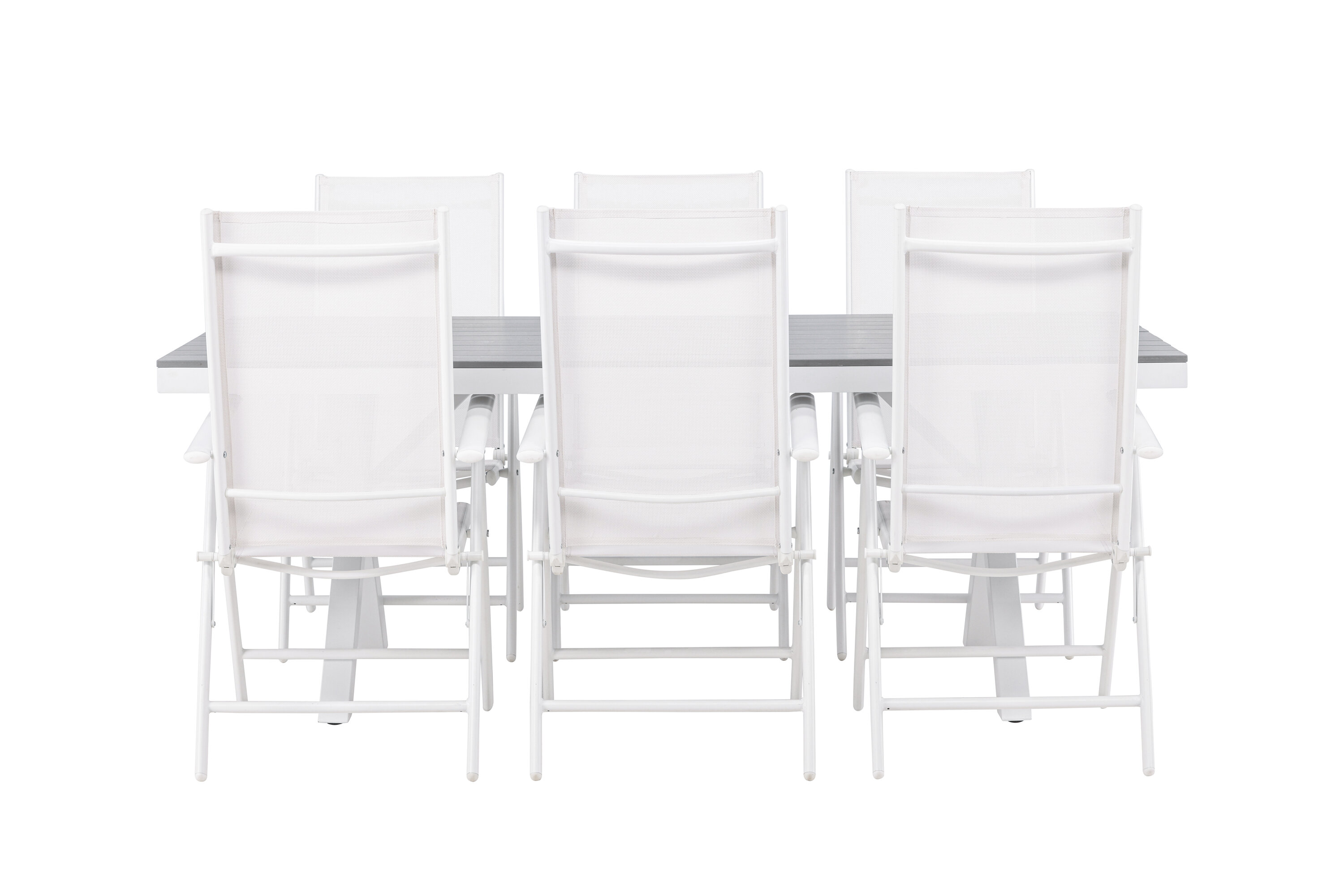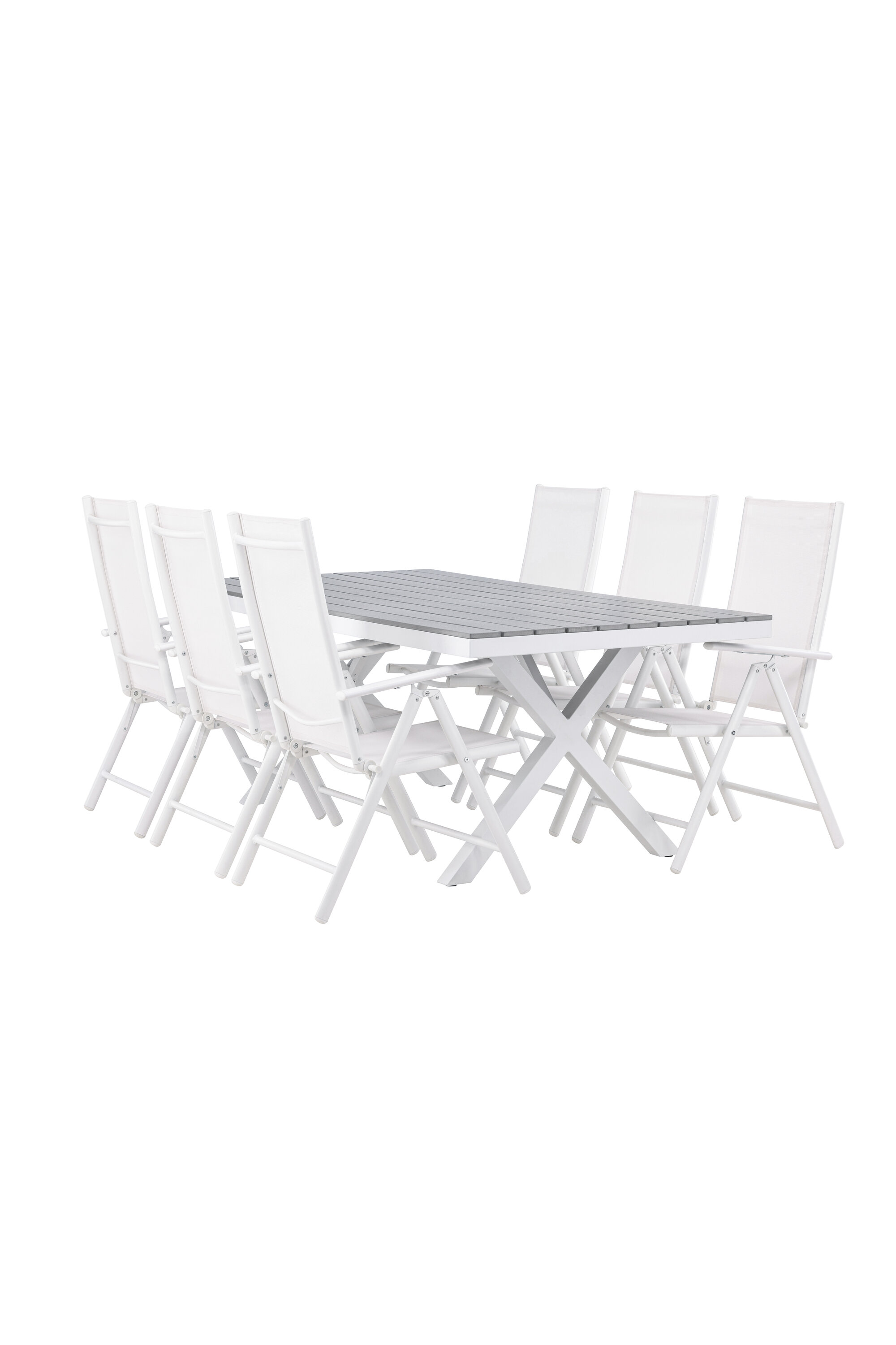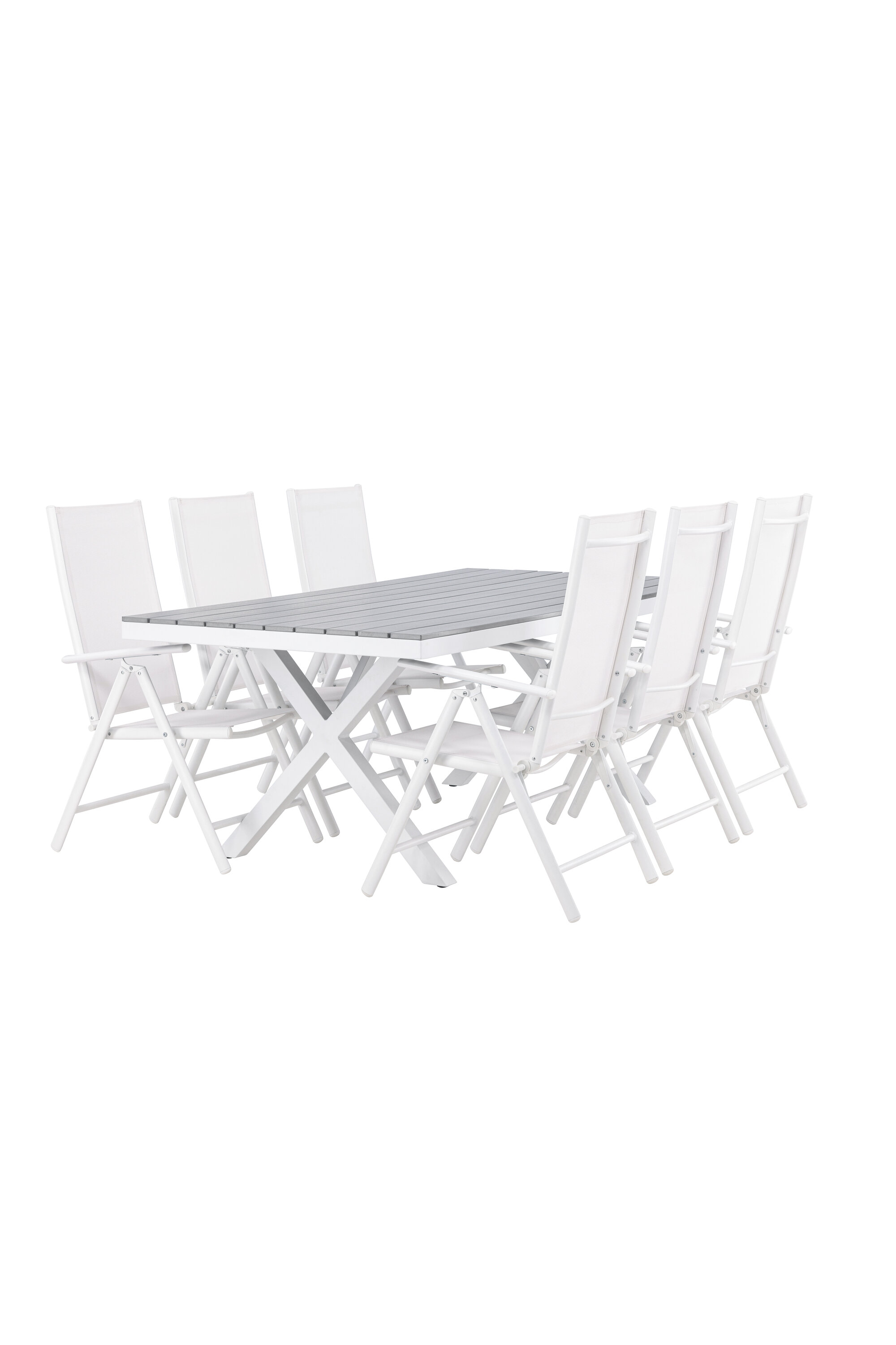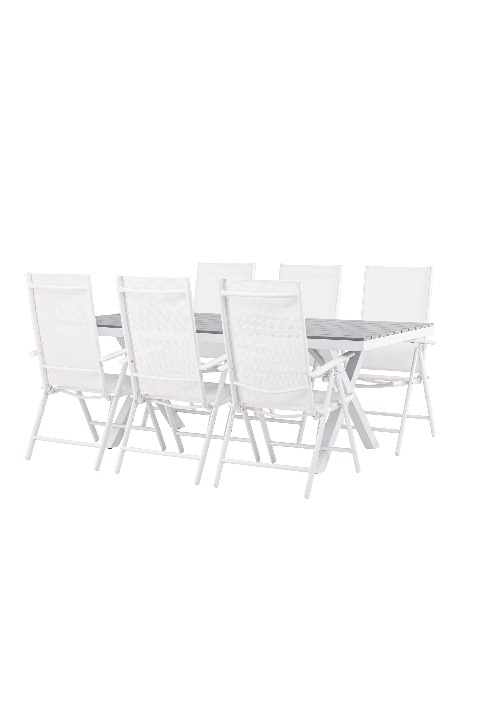 Loo oma terrassile särav ja luksuslik pilgupüüdja! Meie ristkülikukujuline söögilaud Garcia on klassikalise disainiga, mille lauaplaat on maitsekas aintpuidust ja ristatud lauajalad valgest alumiiniumist. Siin koos meie sama sarja kokkupandavate söögitoolidega: Break. Tooli iste on valgest tekstiilist ja toolijalad valgest alumiiniumist. Kokkupandav funktsioon annab teile praktilise ja kõrge mugavuse tasemega tooli. Olge sel suvel valmis silmapaistvaks ööeluks! Laua mõõdud: 200x100cm.