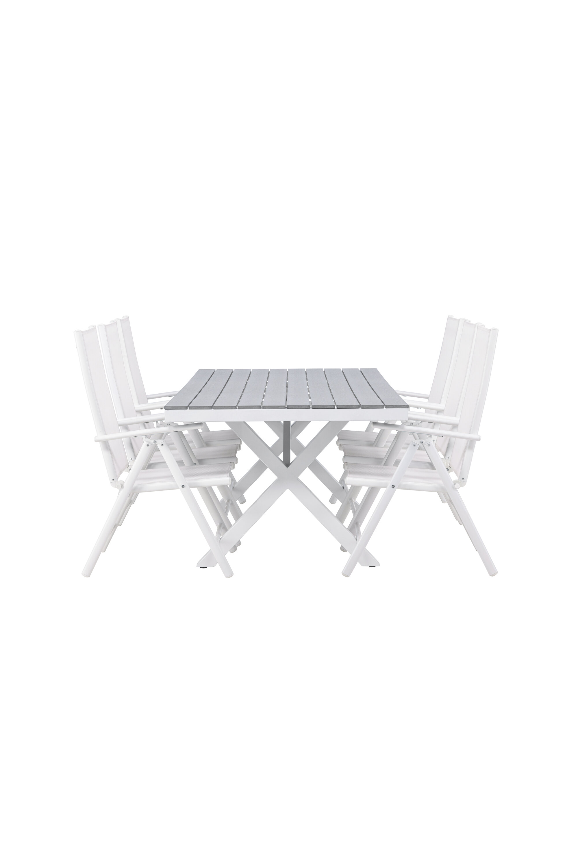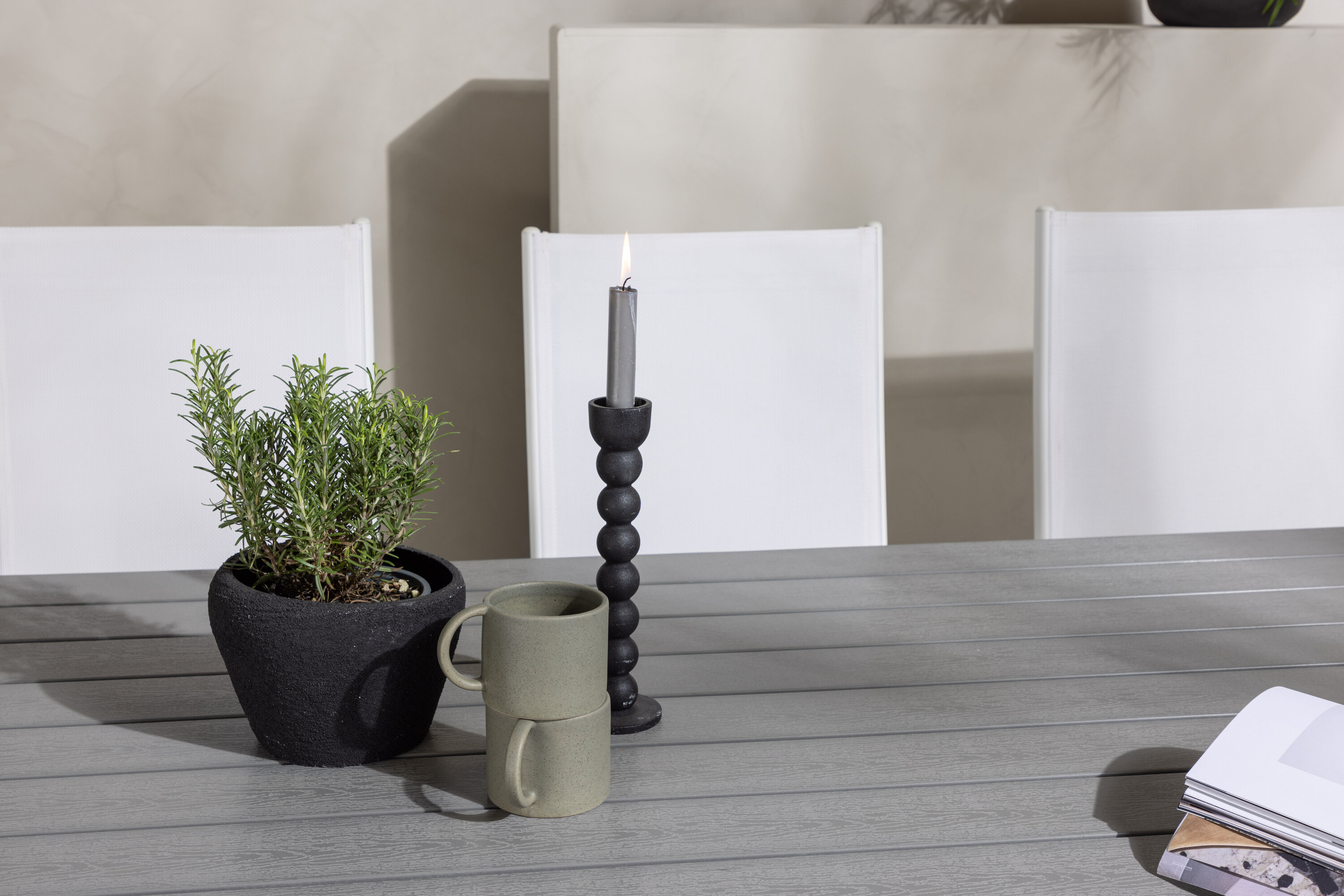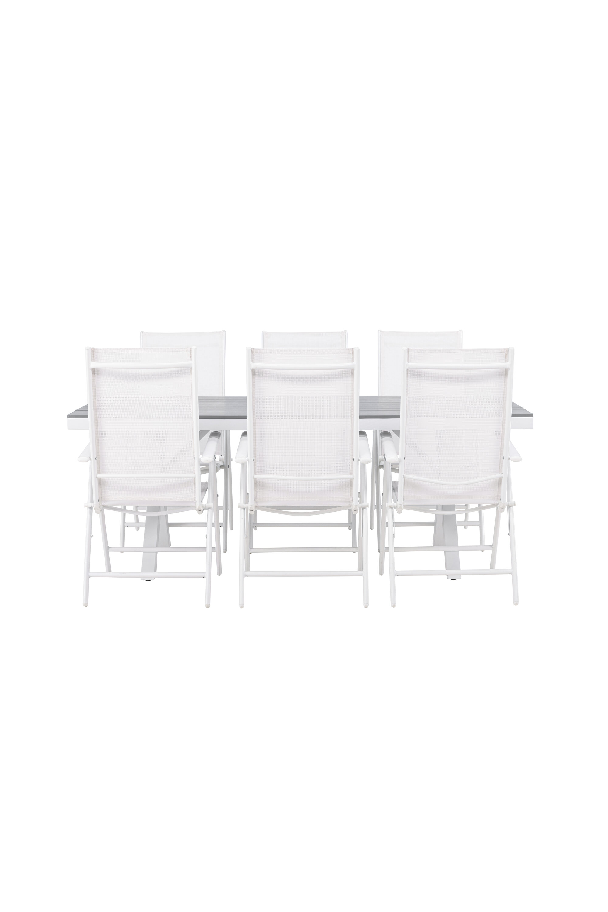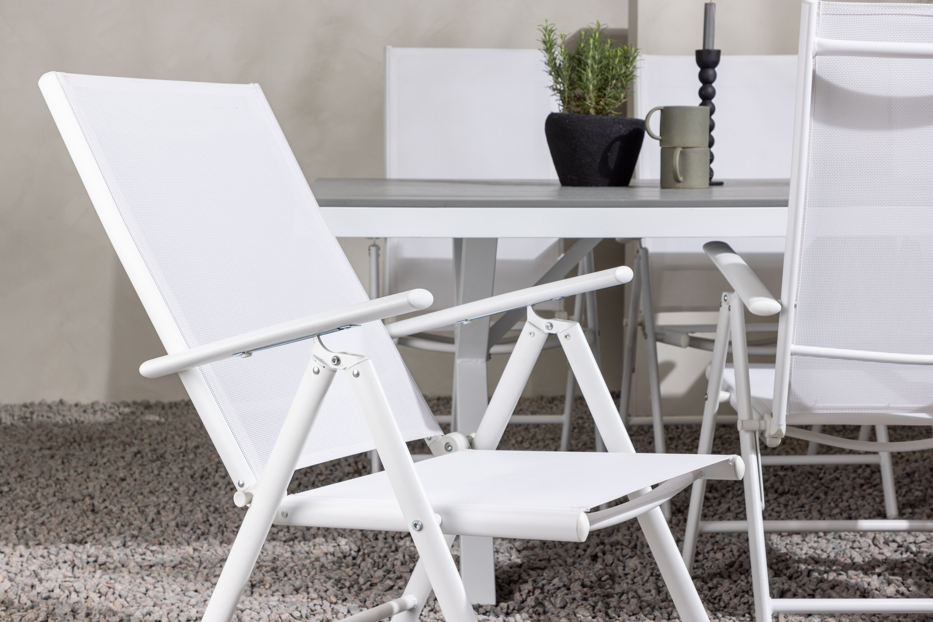 Loo oma terrassile särav ja luksuslik pilgupüüdja! Meie ristkülikukujuline söögilaud Garcia on klassikalise disainiga, mille lauaplaat on maitsekas aintpuidust ja ristatud lauajalad valgest alumiiniumist. Siin koos meie sama sarja kokkupandavate söögitoolidega: Break. Tooli iste on valgest tekstiilist ja toolijalad valgest alumiiniumist. Kokkupandav funktsioon annab teile praktilise ja kõrge mugavuse tasemega tooli. Olge sel suvel valmis silmapaistvaks ööeluks! Laua mõõdud: 200x100cm.