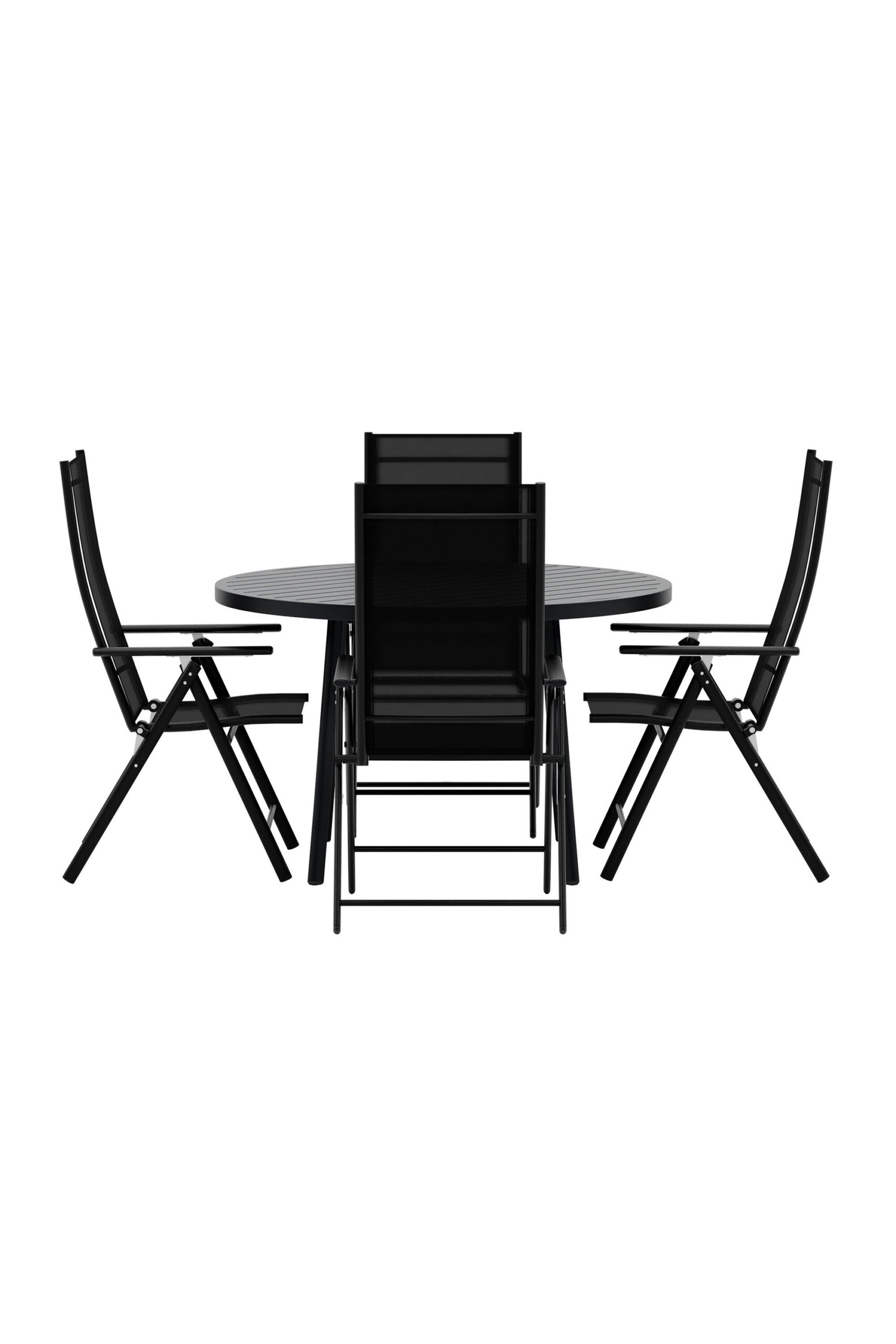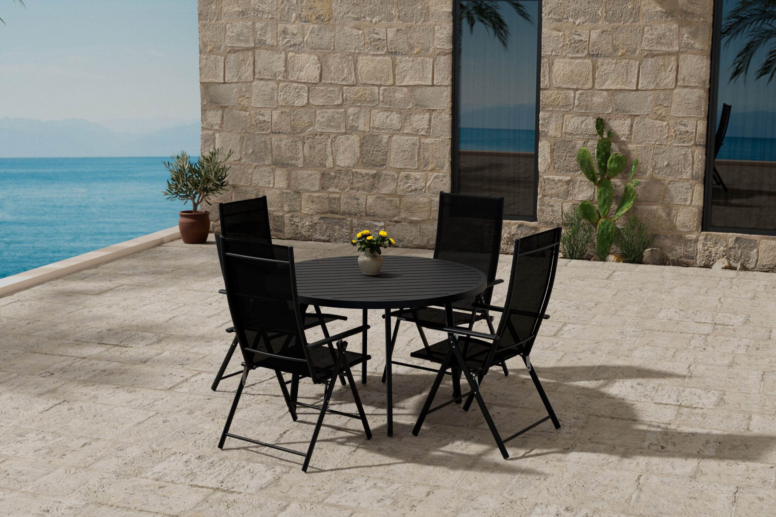 Looge Lavenzo söögitoolide ja ümmarguse Giardini söögilaua kombinatsiooniga moodne ja kutsuv väljas einestamisnurk. Koos moodustavad need elegantse komplekti, mis sobib ideaalselt siseõuele, terrassile või aeda. Lavenzo söögitoolil on elegantne must terasraam, mis annab modernse ilme, mida täiendab tekstiilist iste, mida on ühtaegu mugav ja lihtne värskena hoida. Tool on hõlpsaks hoiustamiseks kokkupandav ja reguleeritava seljatoega, nii et leiate alati mugava istumisasendi – olgu siis õhtust söömas või lihtsalt õues lõõgastumas.