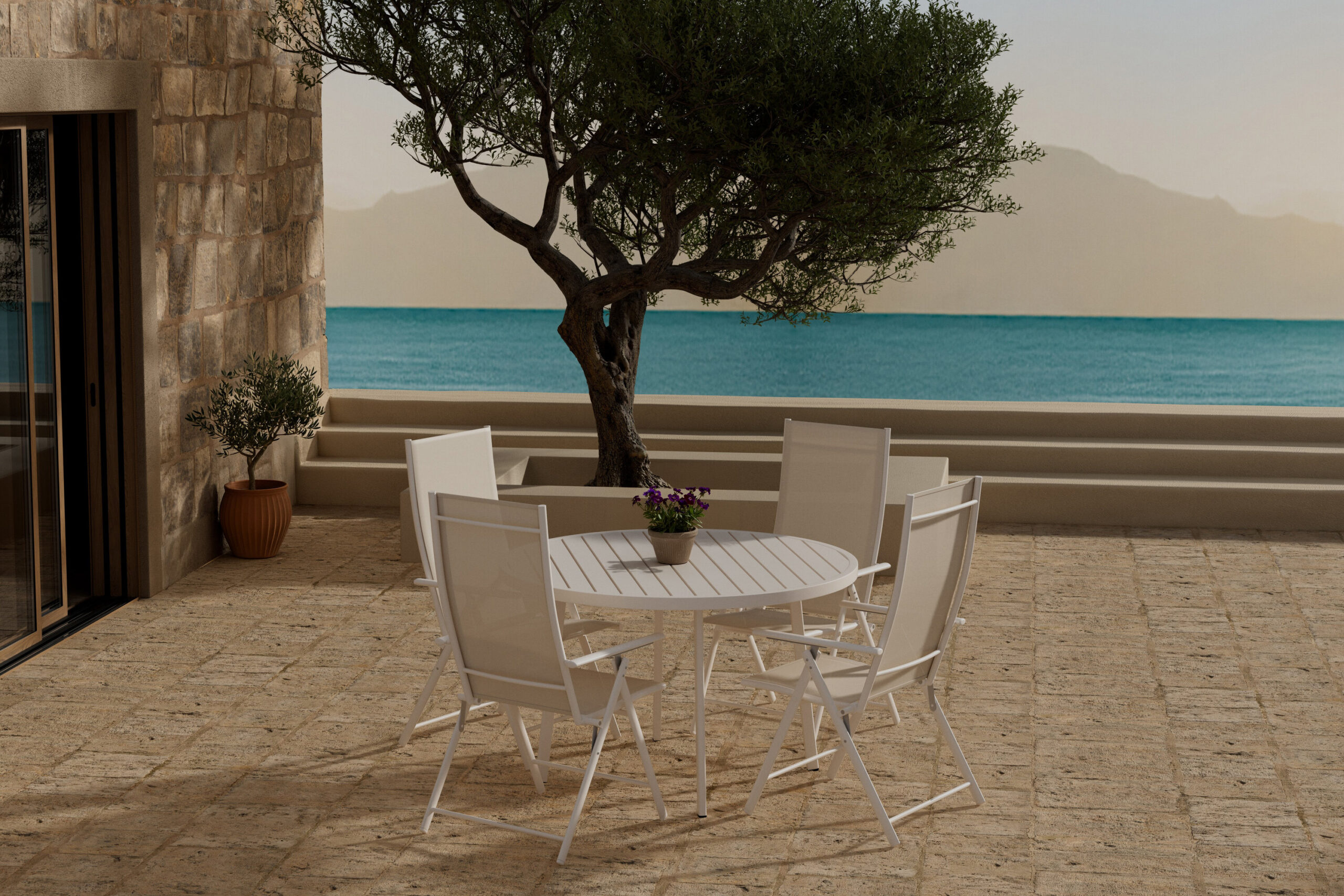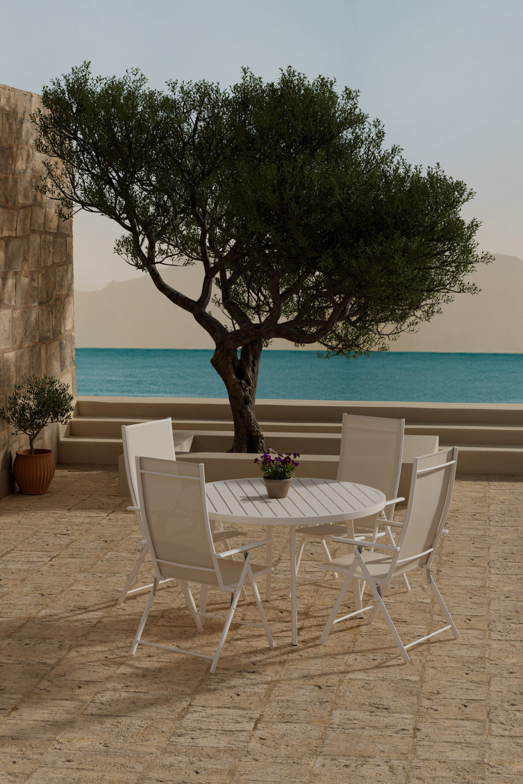 Loo hubane ja kaasaegne välisöögituba selle elegantse söögikomplektiga, mis ühendab paindlikud Lavenzo toolid stiilse ümmarguse Giardini söögilauaga. Üheskoos moodustavad need harmoonilise keskkonna, kus saavad aset leida nii igapäevased söögikorrad kui ka seltskondlikud hetked. Lavenzo söögitoolil on kaasaegne beež teraskonstruktsioon, mis annab elegantse ilme. Tekstiilist iste pakub suurt mugavust ja seda on lihtne puhtana hoida. Tänu kokkupandavale funktsioonile ja reguleeritavale seljatoele saate kohandada tooli nii hoiustamiseks kui ka istumismugavuseks – ideaalne, kui soovite vaheldumisi söögikordade ja lõõgastumise vahel. Giardini söögilaud on ümmargune 120 cm läbimõõduga, muutes selle loomulikuks vestluse ja koosolemise fookuspunktiks. Dekoratiivne liistuga lauaplaat annab lauale iseloomu, helebeež värv loob aga pehme ja ajatu tunde, mis sobib igasse väliskeskkonda.