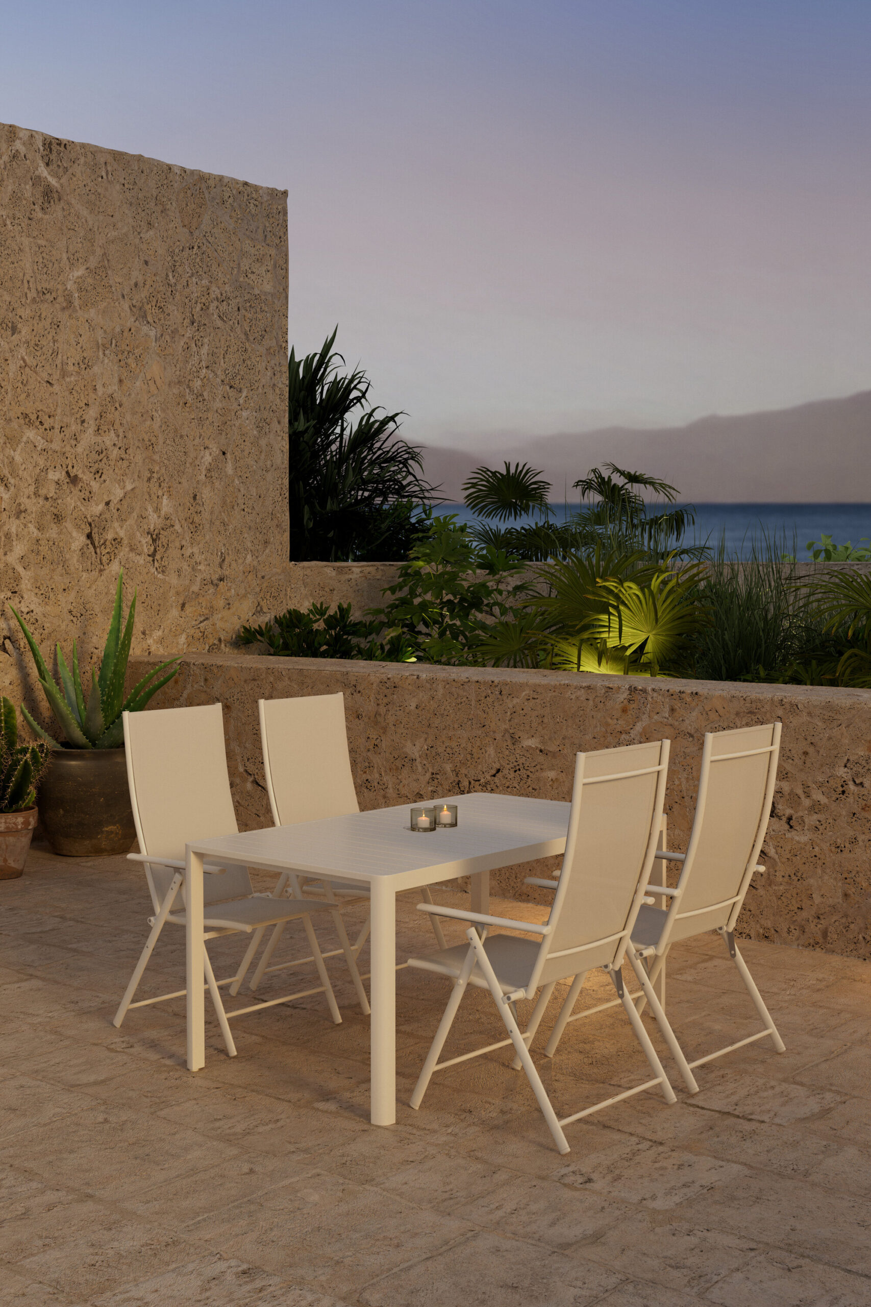 Lavenzo söögitool on loodud nii mugavust kui ka paindlikkust silmas pidades. Beež raam annab kaasaegse värske ilme, samas kui tekstiilist iste pakub mugavat tunnet ja seda on lihtne hooldada. Tool on ka kokkupandav, mistõttu on seda lihtne hoiustada või vajadusel teisaldada. Reguleeritava seljatoega saate hõlpsasti kohandada istumisasendit lõdvestunud hetkede jaoks – ideaalne nii söögikordade kui ka seisakuaegade jaoks. Giardini söögilaud täiendab komplekti oma elegantse disaini ja dekoratiivse välimusega. Ristkülikukujuline kuju pakub rohkelt ruumi igapäevasteks õhtusöökideks ja seltskondlikeks sündmusteks, samas kui restiga lauaplaat annab lauale ainulaadse ja elegantse iseloomu. Beež värv loob harmoonilise terviku, mis sulandub erinevatesse väliskeskkondadesse ja lisab tervitatava tunde.