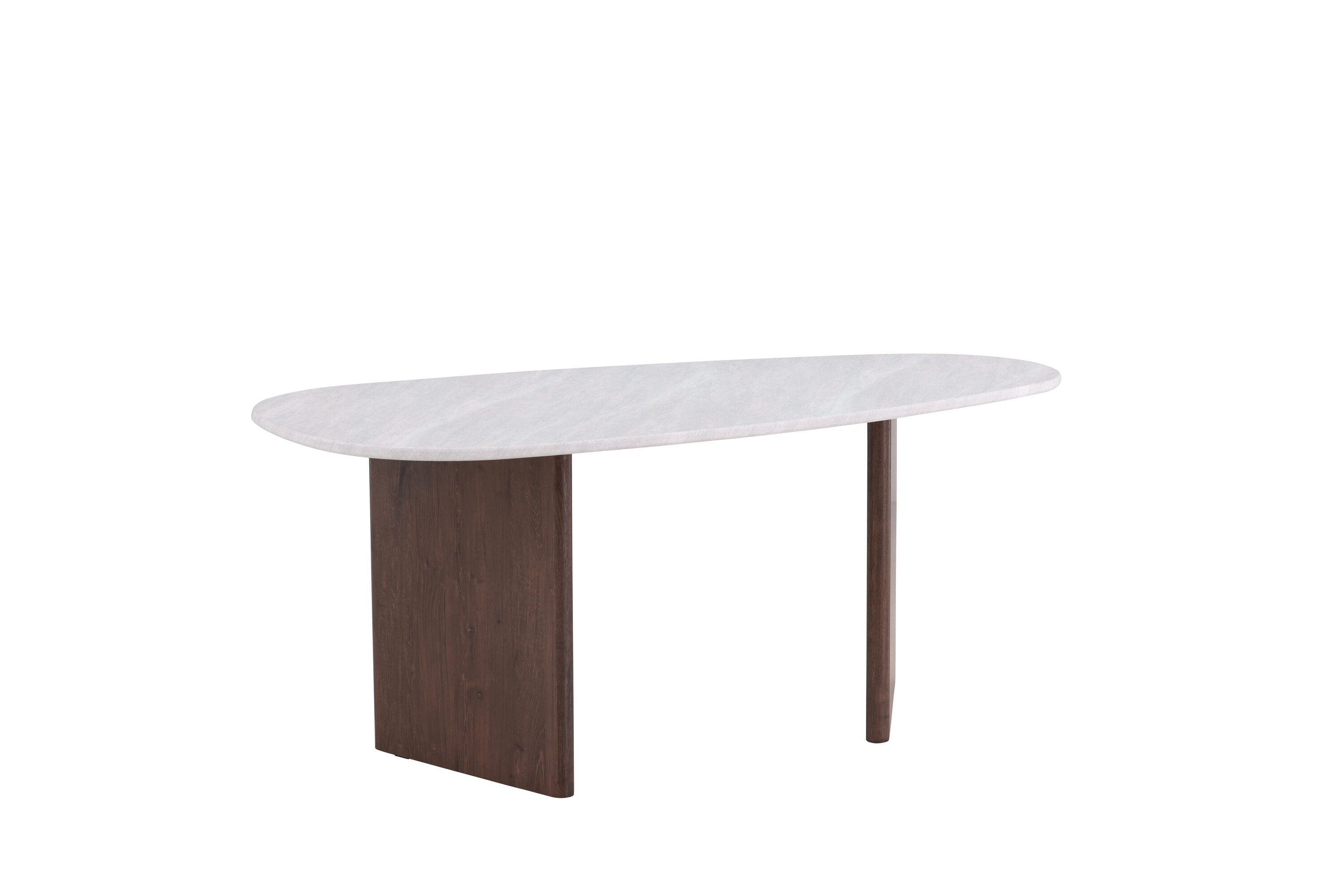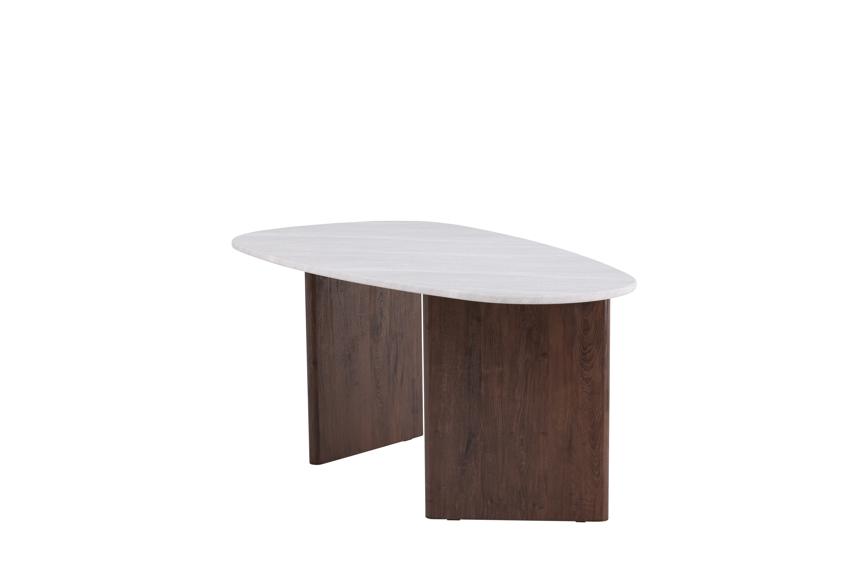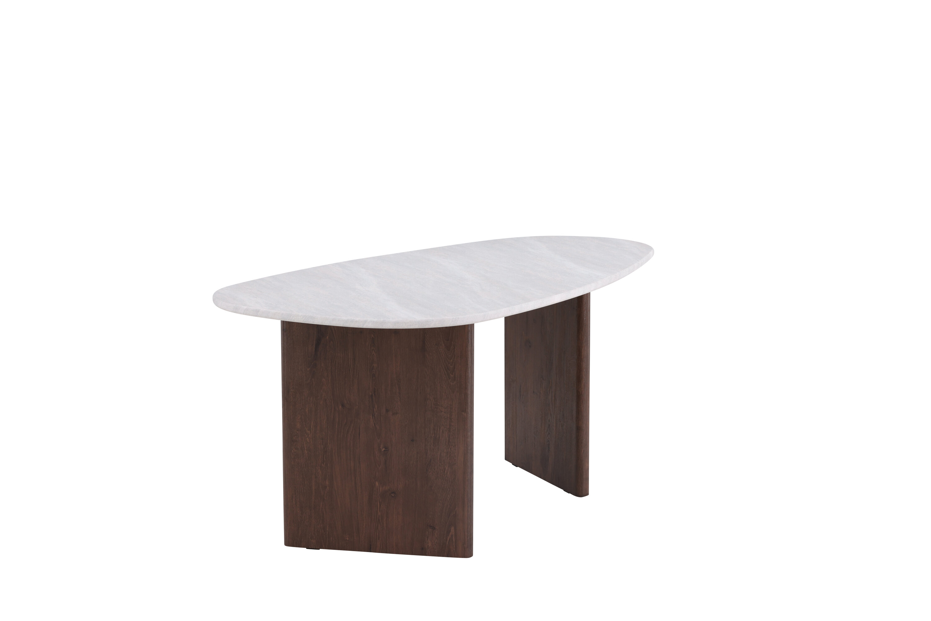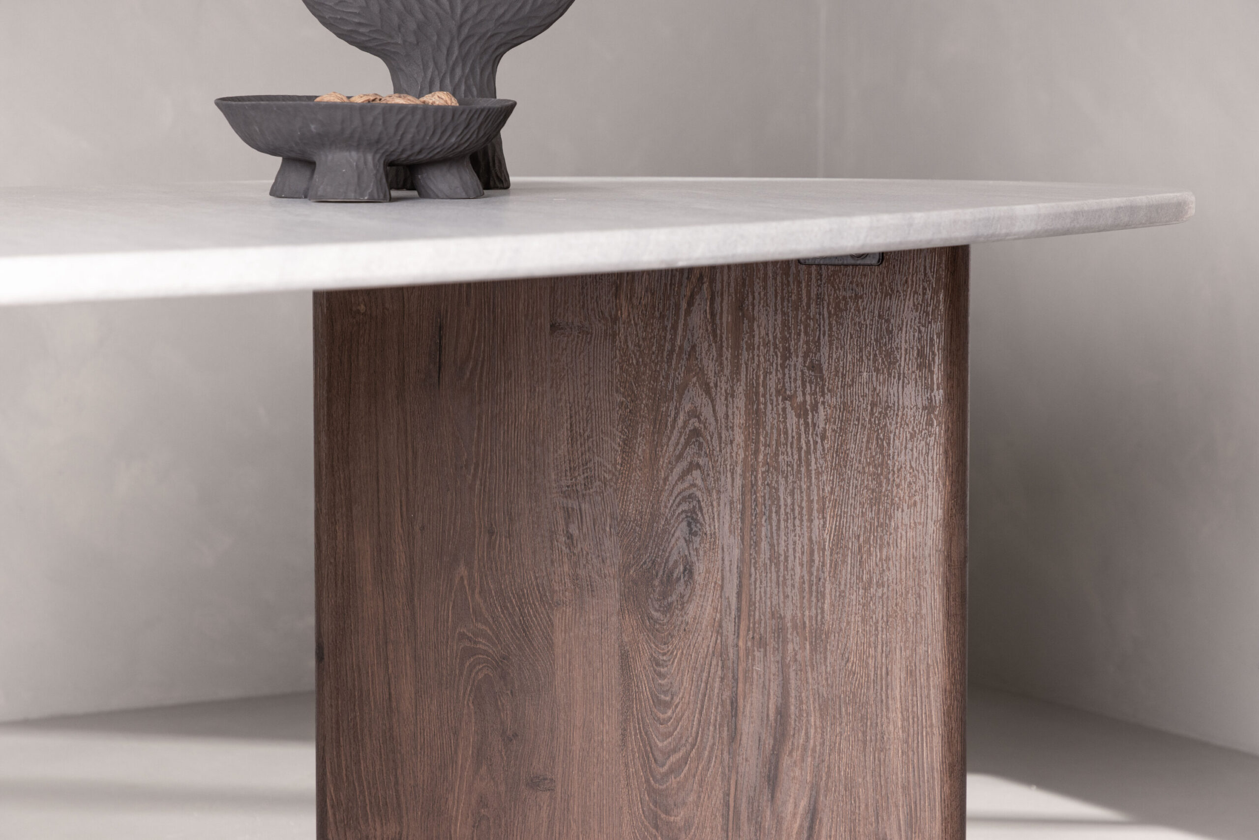 Unistuste laud GRÖNVIK loob teie koju kiiresti maitseka fookuspunkti! Skandinaavialiku disaini ja elegantse ülesehitusega lauast saab enamikus kodudes lemmik. Ebakorrapärane lauaplaat on valmistatud helehallist betooni välimusega MDF-ist ja seda toetavad kaks õhukest tumepruuni tooni puitpaneeli. Ühendage see paari stiilse söögitooliga ja teil on täielik söögigrupp kõigi ees ootavate veetlevate einete jaoks!