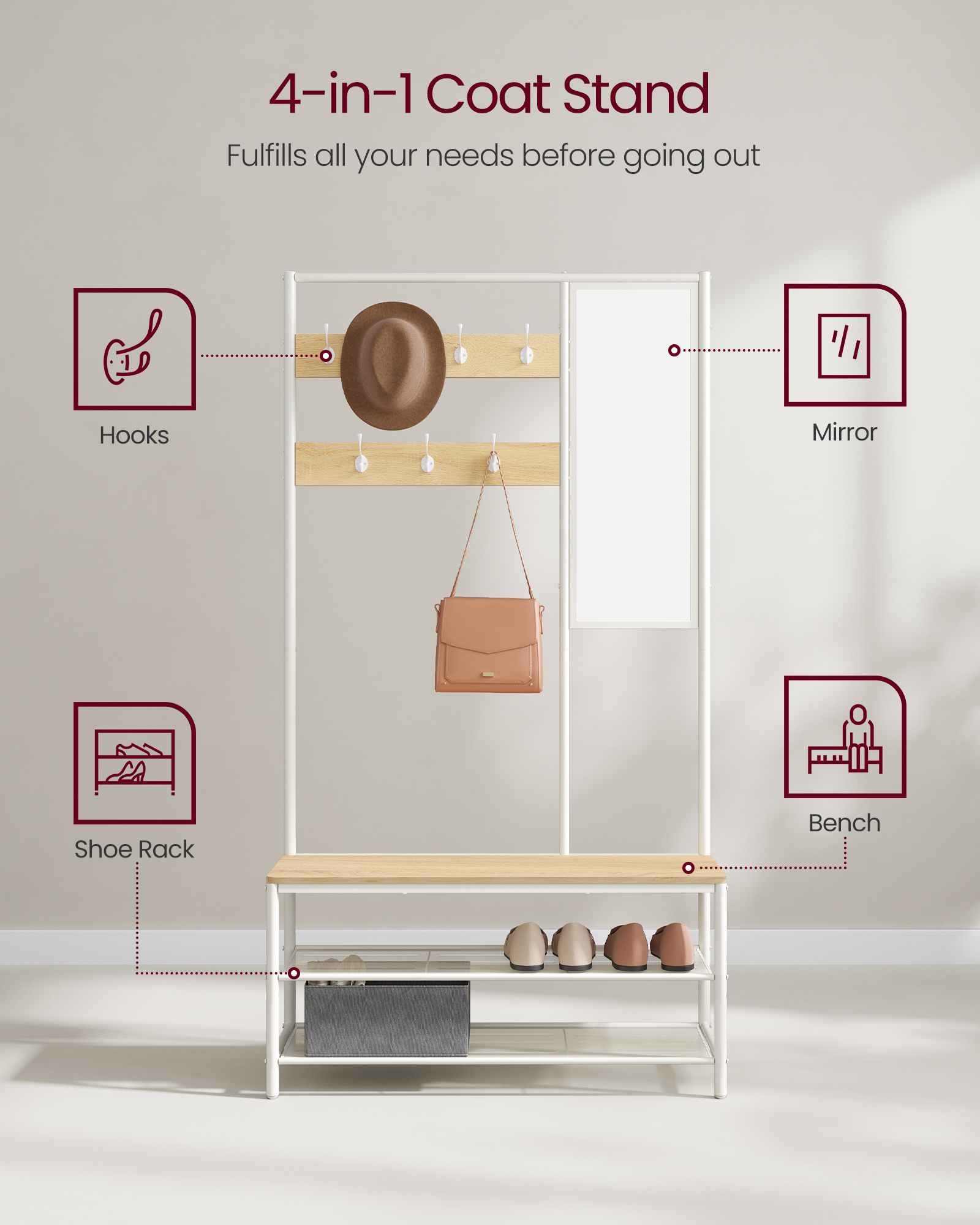 Spetsifikatsioonid: Värvus: Tamm, Valge Materjal: Puitlaastplaat, Teras Toote mõõdud: 35 x 98 x 180 cm (S x L x K) Toote kaal: 15,9 kg Maksimaalne staatiline kandevõime konksu kohta: 5 kg Maksimaalne staatiline kandevõime võrgust riiuli kohta: 15 kg Pingi maksimaalne staatiline kandevõime: 100 kg Pakisisu: 1 x Esiku tugipost 2 x Kallutusvastane komplekt 1 x Monteerimiskomplekt 1 x Juhend