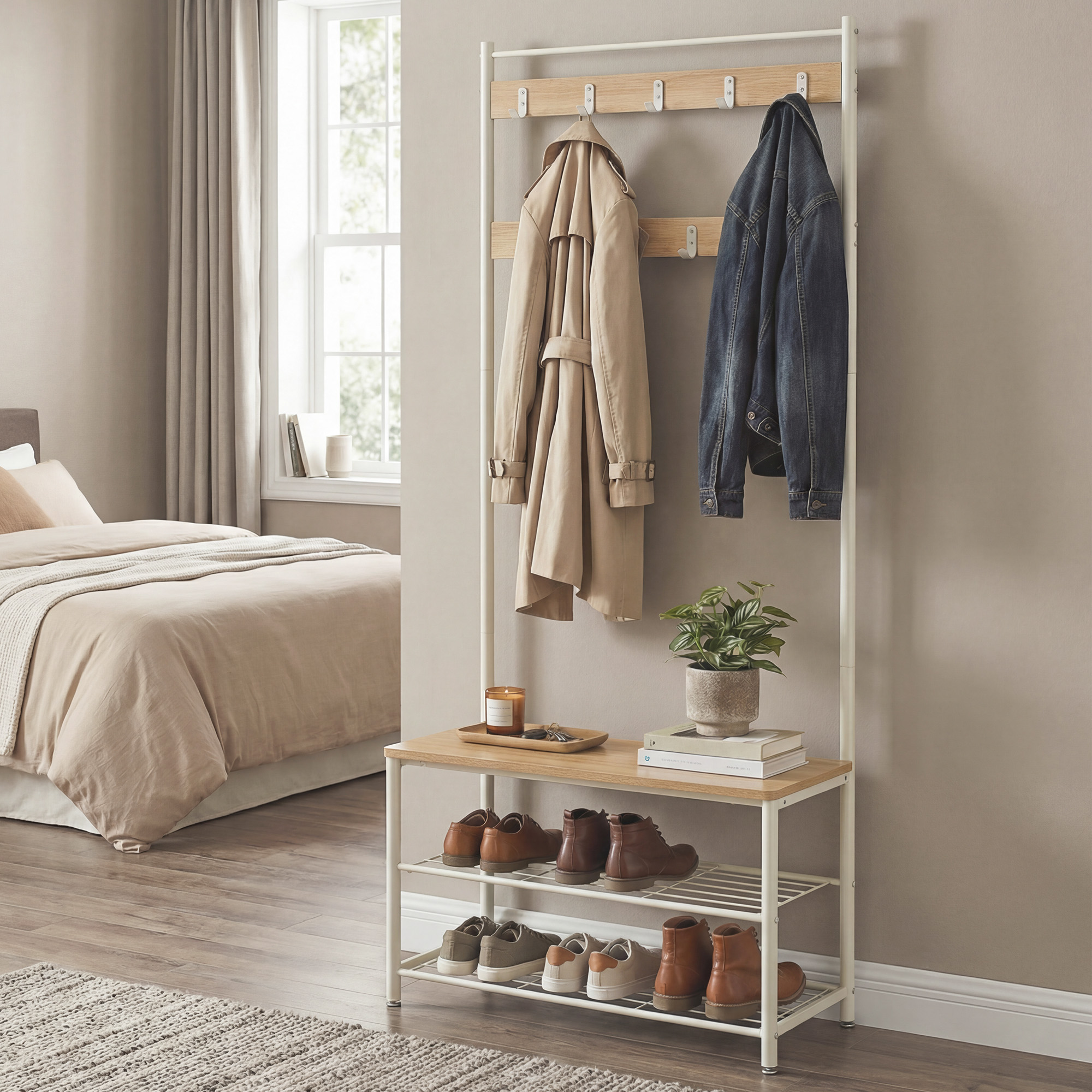 Parameetrid: – Toote mõõtmed: 32 x 70 x 175 cm – Netokaal: 7,8 kg – Iga konksu maksimaalne kandevõime: 3 kg – Pingi maksimaalne kandevõime: 136 kg – Iga võrgust riiuli maksimaalne kandevõime: 10 kg – Materjal: puitlaastplaat, teras – Värvus: naturaalne, valge Pakendi nimekiri: – 1 x riidenagi – 1 x ümberkukkumisvastane komplekt Märkused: – Ohutuse tagamiseks kinnitage toode ümberkukkumisvastase komplektiga seinale. – Pingi maksimaalne staatiline kandevõime on 136 kg. Palun ärge ületage selle kaalupiirangut.