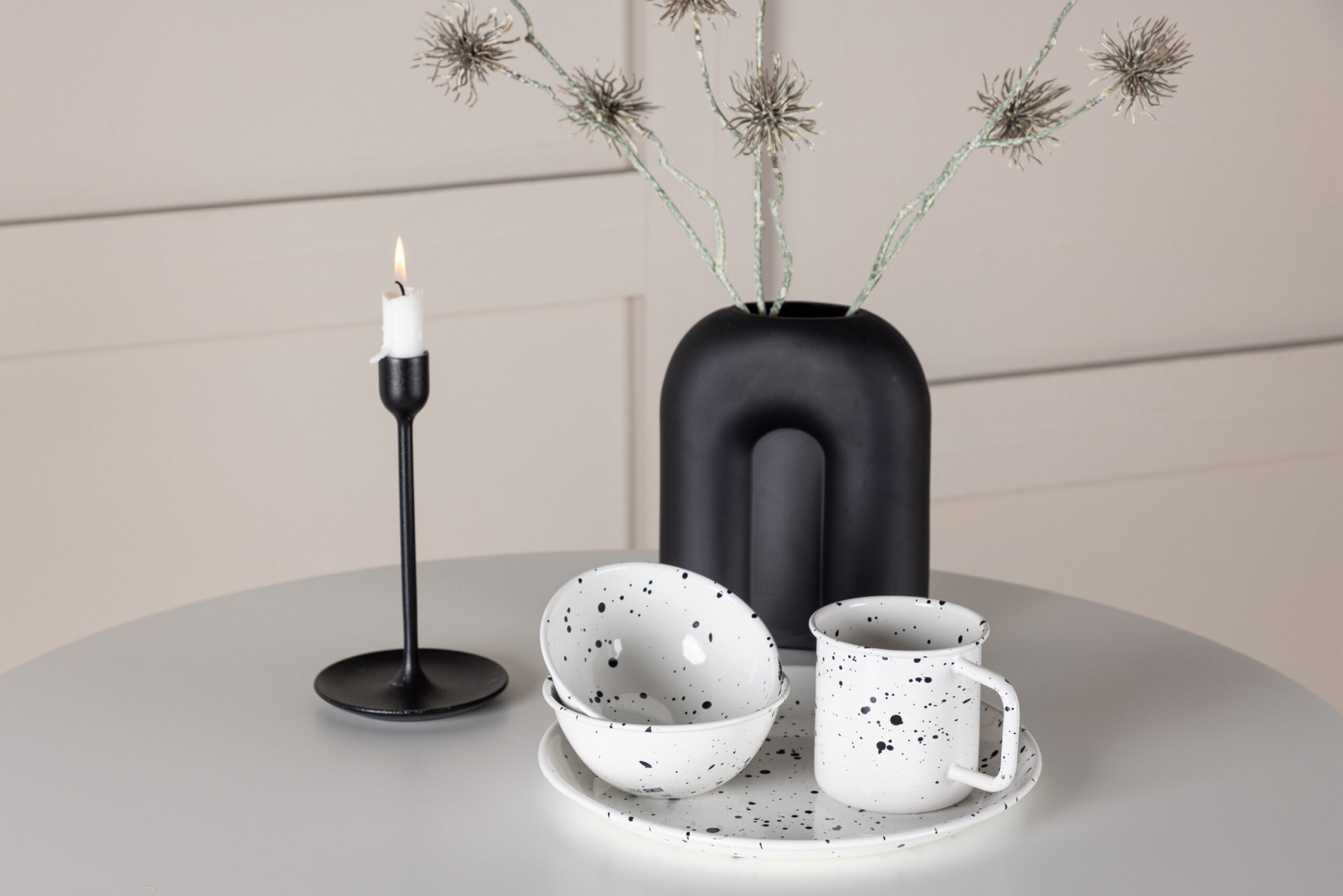 Hamdeni sarja söögilaud on sama pilkupüüdev kui praktiline! Ümmargune lauaplaat on helehallist MDF-ist ja veermik on valgest terasest sirgete põhjamaiste vormidega. Vastupidavad materjalid annavad teile aja jooksul püsiva söögilaua. Sobitage paari mugava söögitooliga ja sisustage kodu süda korralikult, nutikalt ja stiilselt!