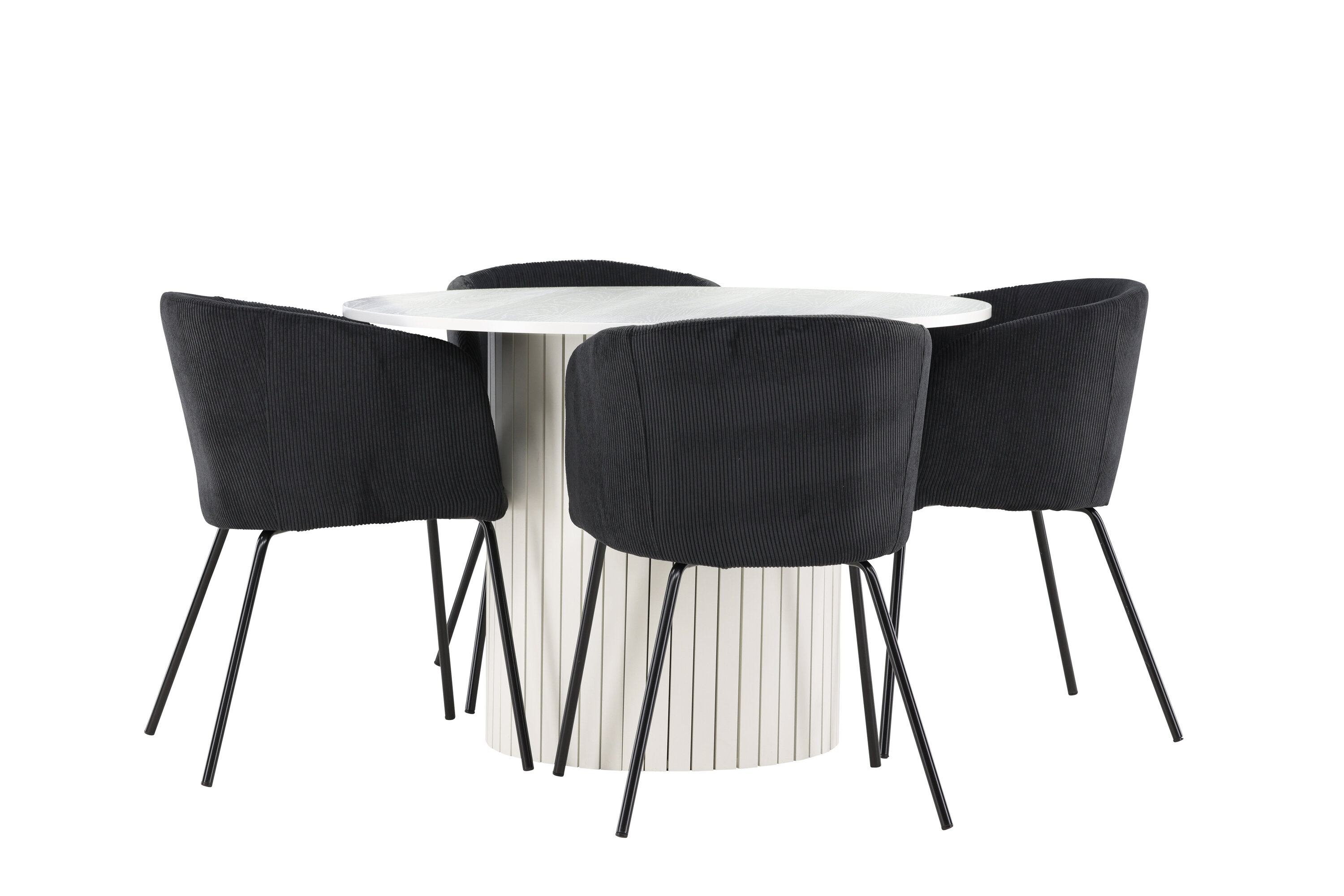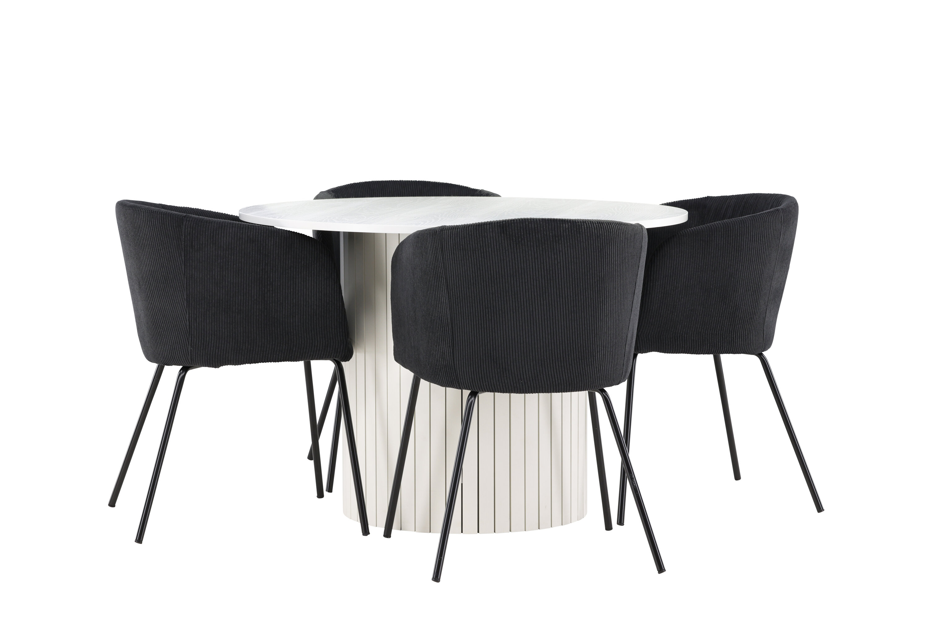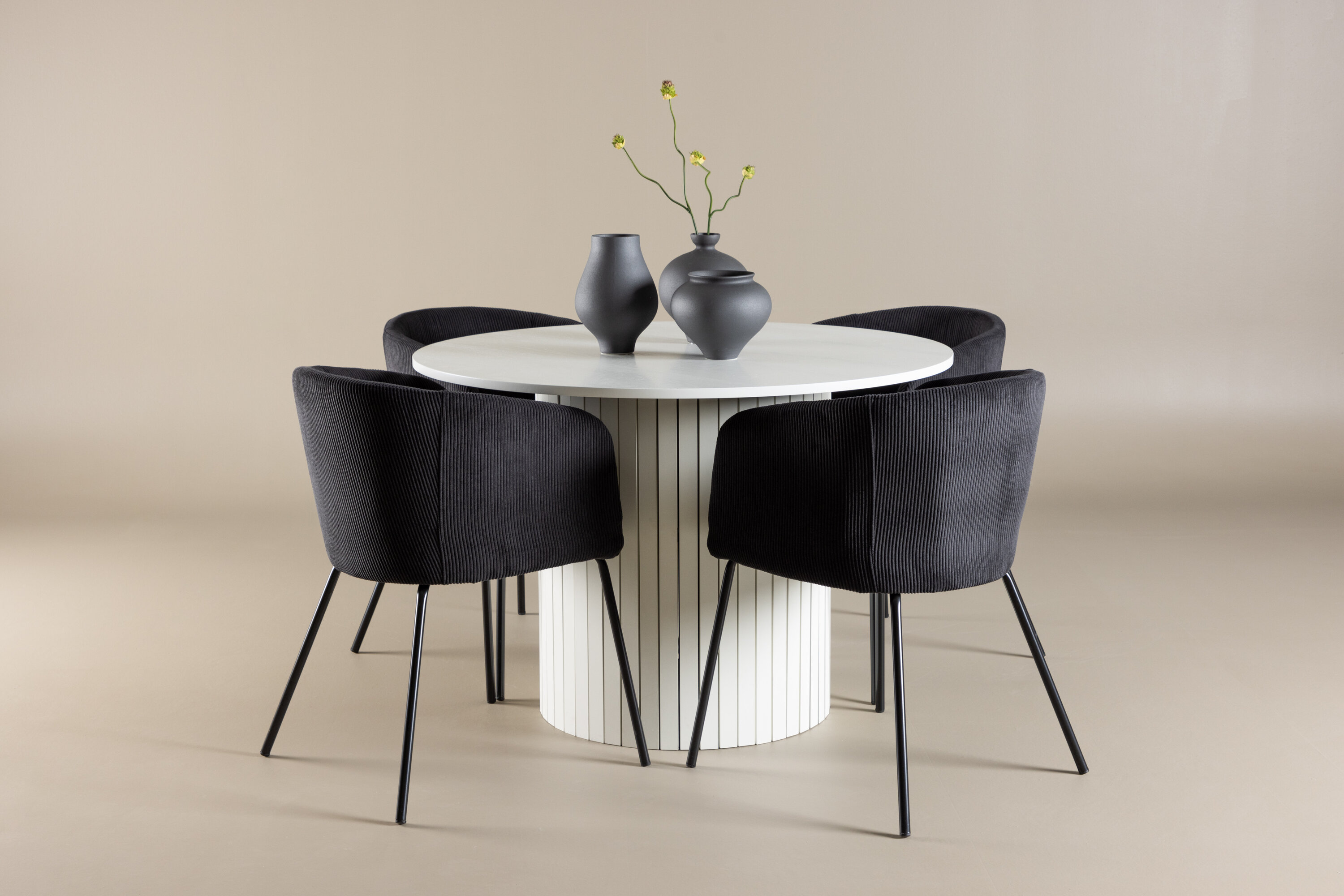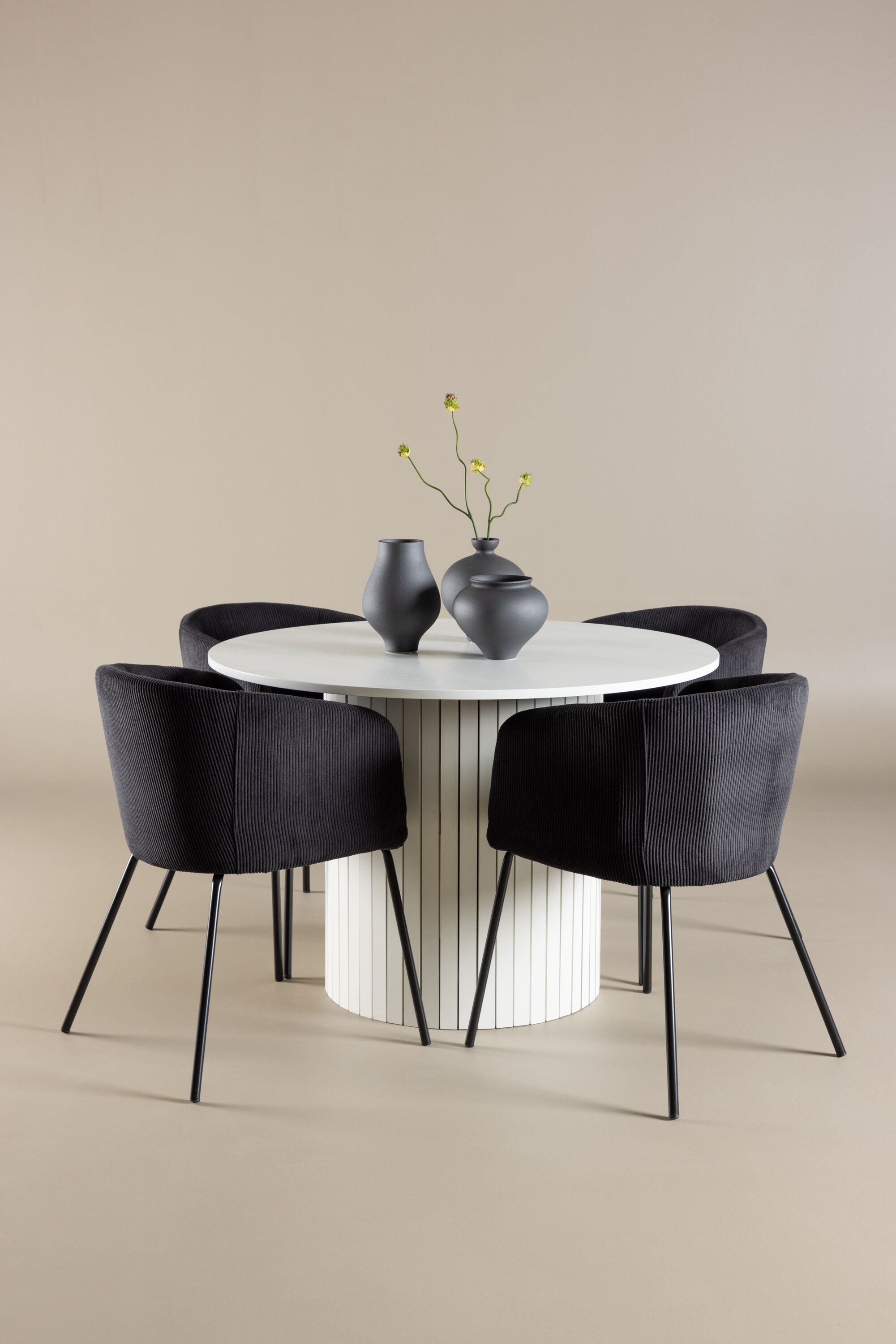 Looge stiilne ja kutsuv söögituba meie elegantse söögikomplektiga, mis ühendab endas kaasaegse Häroni laua mugavate Berit toolidega. See söögikomplekt sobib suurepäraselt nii igapäevaseks õhtusöögiks kui ka pidulikuks sündmuseks, andes teie söögitoale rafineeritud ja kaasaegse tunde. MDF-st valmistatud Häroni laud on puhta valge värviga, mis lisab teie söögituppa kerge ja värske atmosfääri. 110 cm läbimõõduga laud pakub rohkelt ruumi söögiks ja vestlusteks, ümar kuju loob aga harmoonilise ja tasakaalustatud keskkonna. Laua tugev konstruktsioon tagab pikaajalise kasutamise ja stabiilsuse. Neli Beriti tooli täiendavad lauda suurepäraselt oma elegantsete musta velvetist kaetud istmetega. Need toolid pakuvad nii mugavust kui ka stiili, muutes need ideaalseks pikaks ja nauditavaks õhtusöögiks pere ja sõpradega. Nende kaasaegne disain koos kõrgete seljatugede ja pehmete istmetega annab teie söögitoale rafineeritud ja kaasaegse ilme. See söögikomplekt on täiuslik segu esteetikast ja funktsionaalsusest, mistõttu on see suurepärane valik neile, kes otsivad elegantset ja mugavat söögituba. Täiustage oma söögituba Häroni laua ja Berit toolide kombinatsiooniga ning looge koht, kus jagatakse mälestusi ja rõõmu.