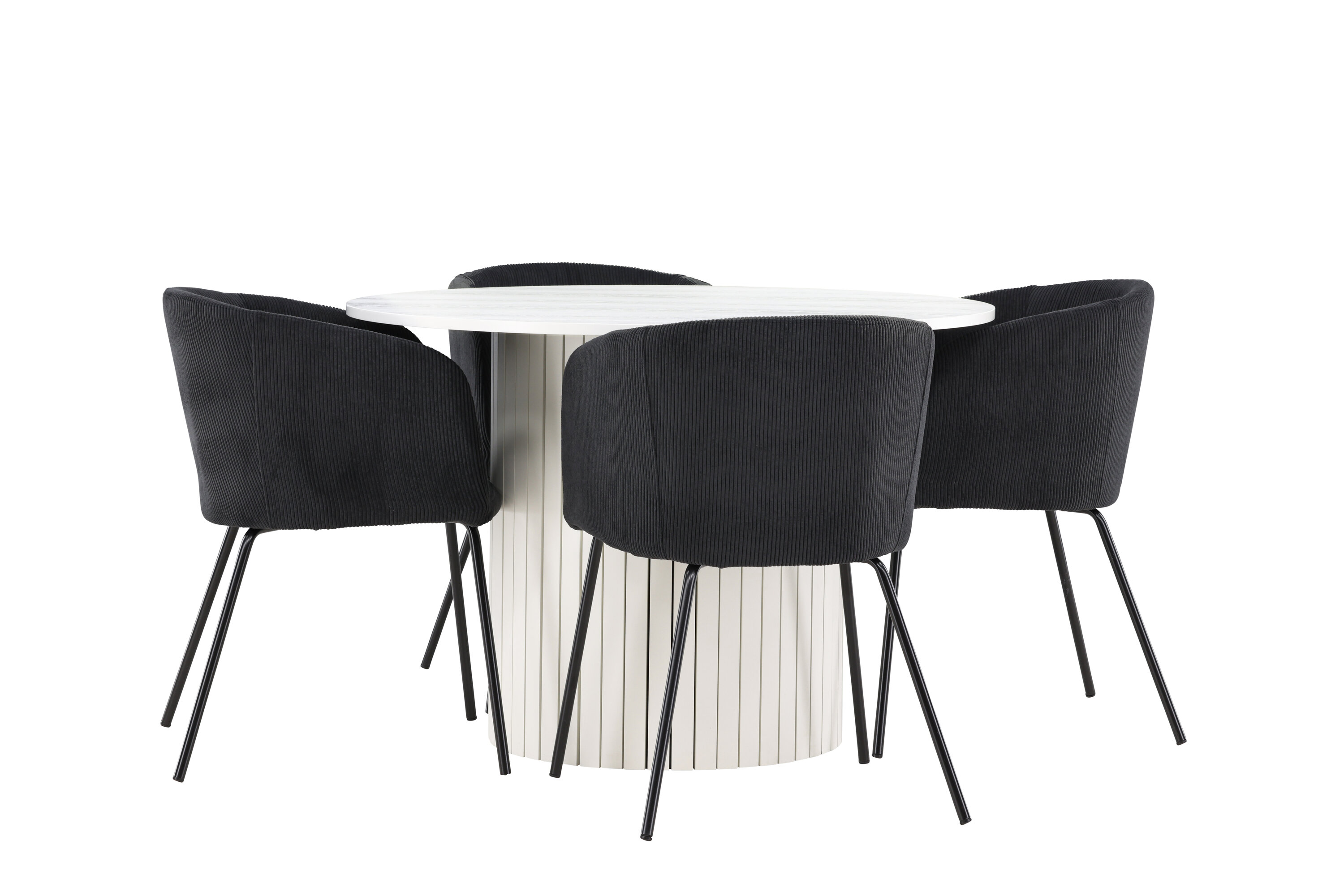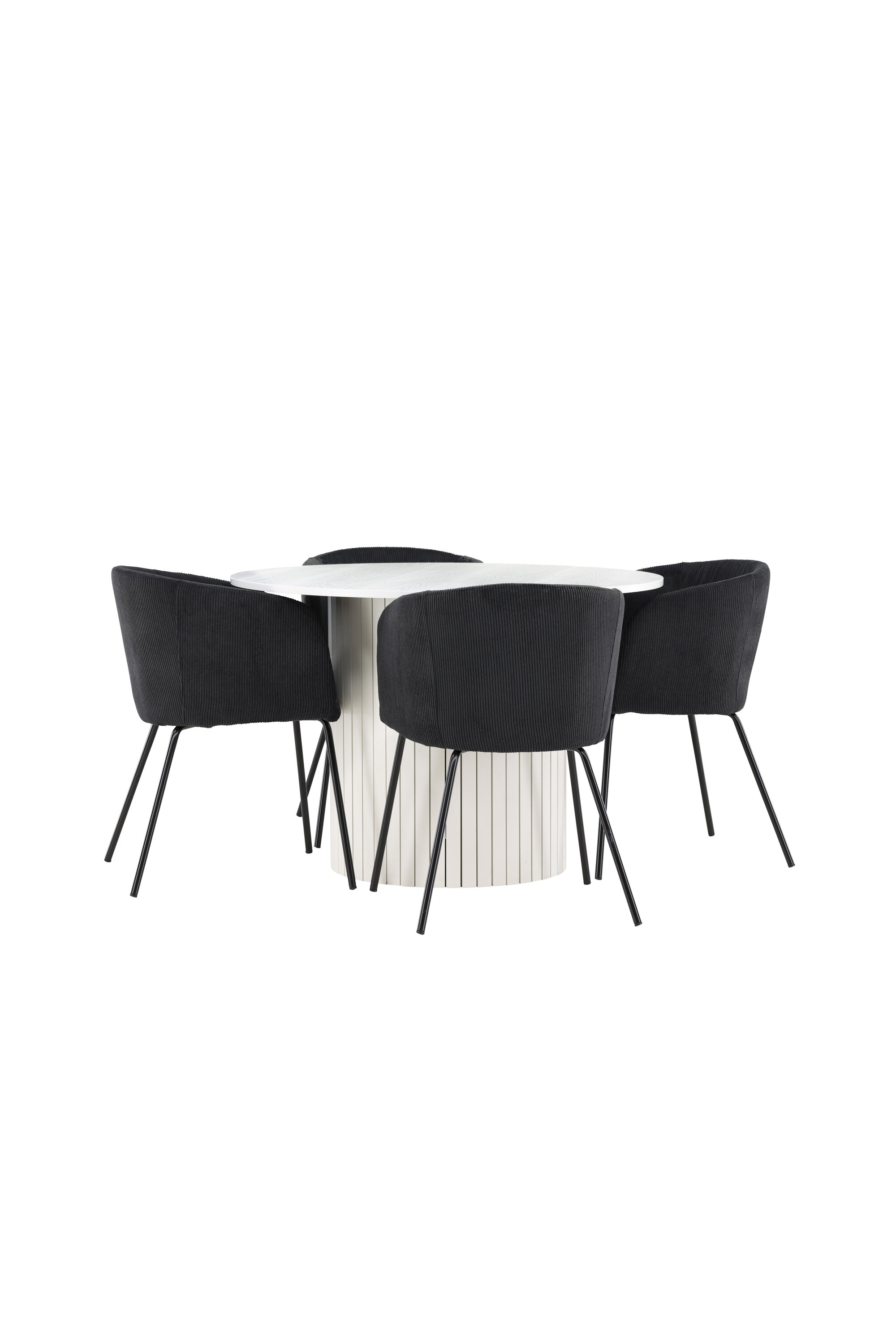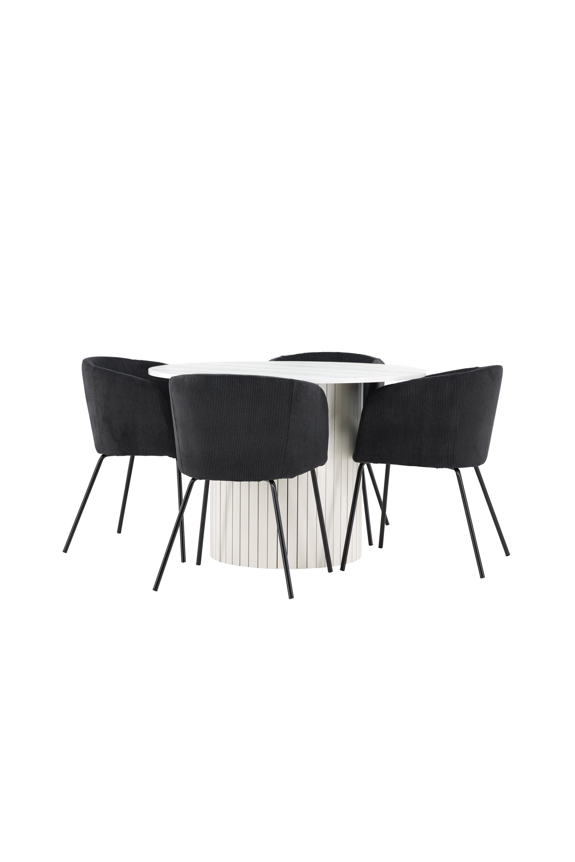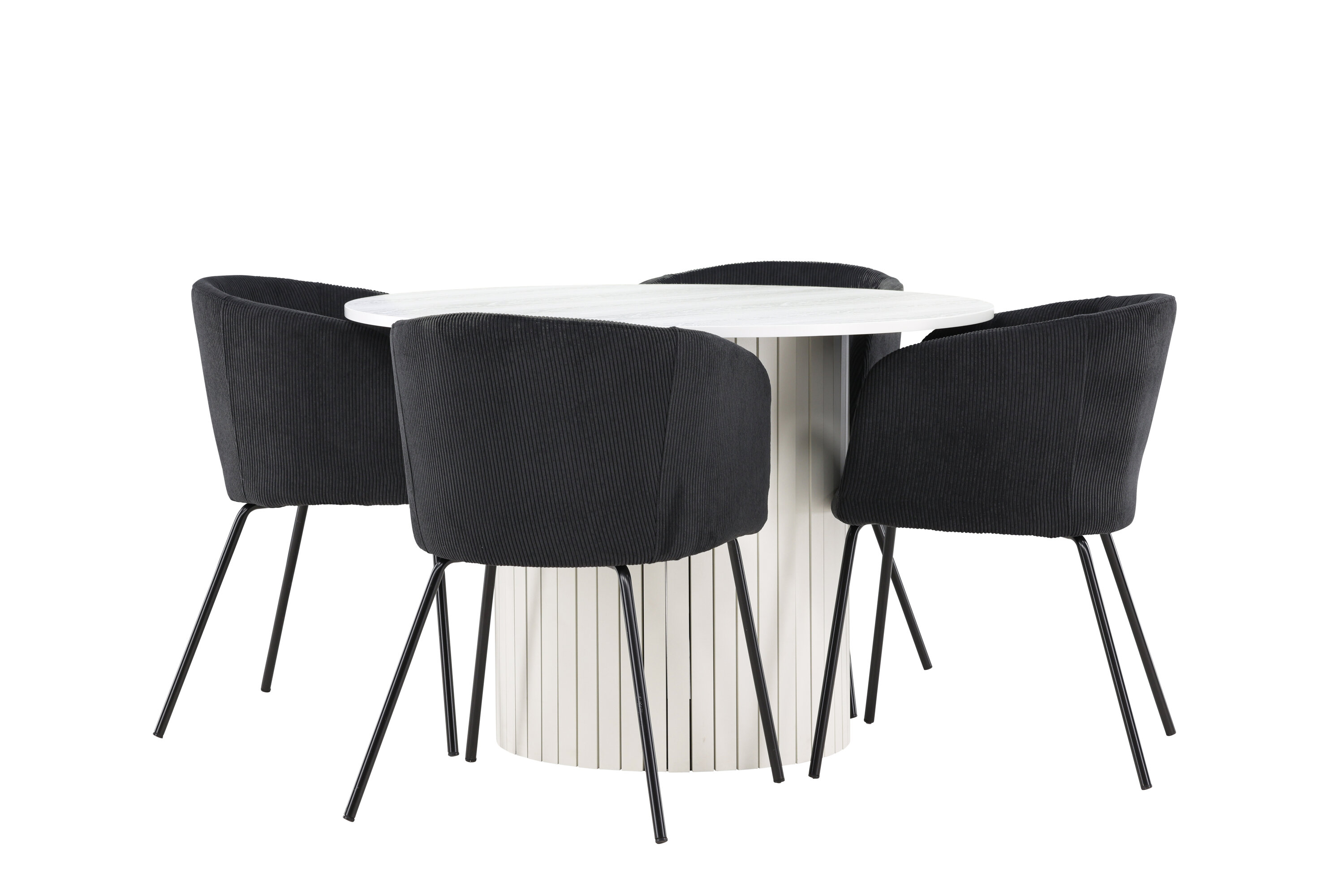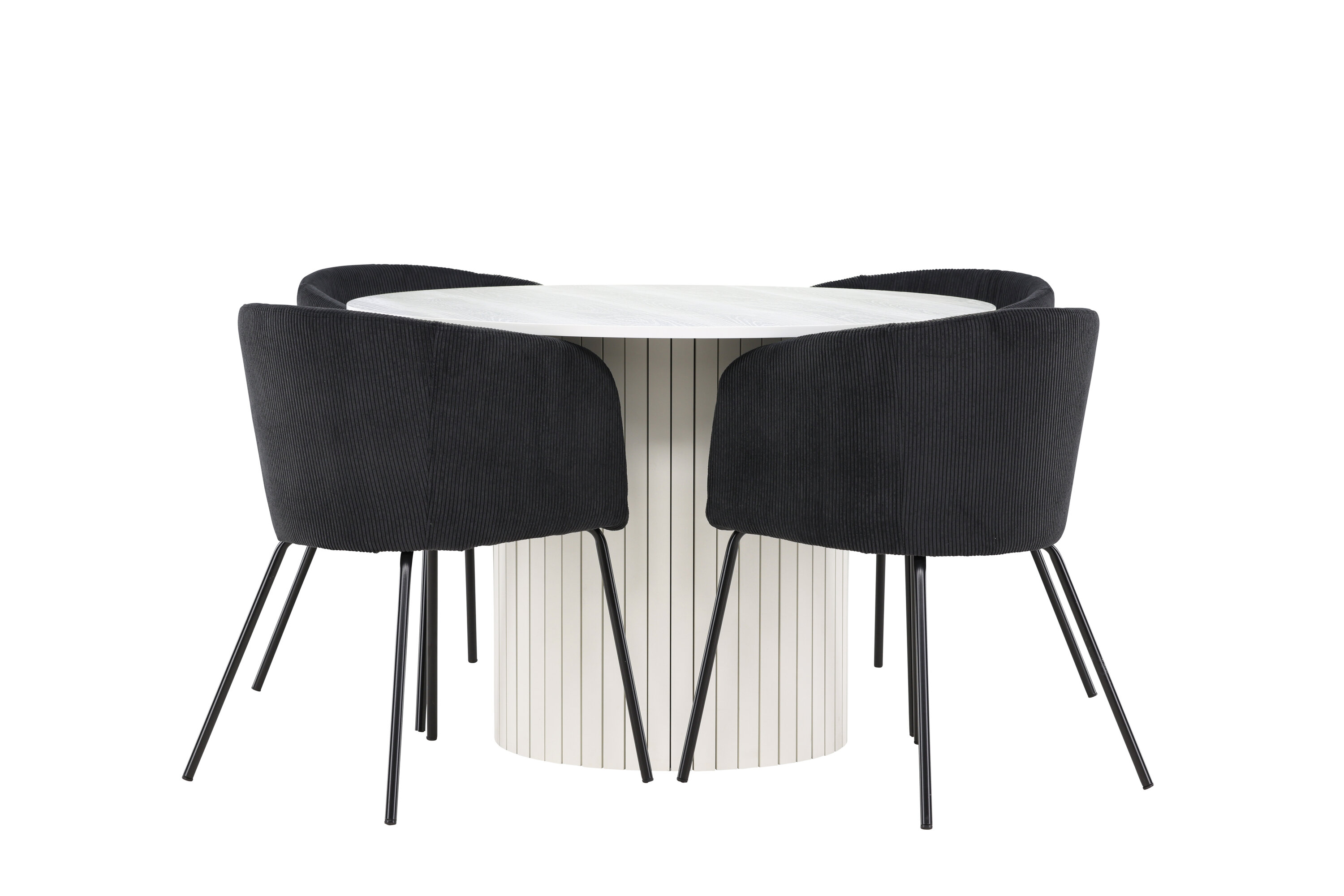 Looge stiilne ja kutsuv söögituba meie elegantse söögikomplektiga, mis ühendab endas kaasaegse Häroni laua mugavate Berit toolidega. See söögikomplekt sobib suurepäraselt nii igapäevaseks õhtusöögiks kui ka pidulikuks sündmuseks, andes teie söögitoale rafineeritud ja kaasaegse tunde. MDF-st valmistatud Häroni laud on puhta valge värviga, mis lisab teie söögituppa kerge ja värske atmosfääri. 110 cm läbimõõduga laud pakub rohkelt ruumi söögiks ja vestlusteks, ümar kuju loob aga harmoonilise ja tasakaalustatud keskkonna. Laua tugev konstruktsioon tagab pikaajalise kasutamise ja stabiilsuse. Neli Beriti tooli täiendavad lauda suurepäraselt oma elegantsete musta velvetist kaetud istmetega. Need toolid pakuvad nii mugavust kui ka stiili, muutes need ideaalseks pikaks ja nauditavaks õhtusöögiks pere ja sõpradega. Nende kaasaegne disain koos kõrgete seljatugede ja pehmete istmetega annab teie söögitoale rafineeritud ja kaasaegse ilme. See söögikomplekt on täiuslik segu esteetikast ja funktsionaalsusest, mistõttu on see suurepärane valik neile, kes otsivad elegantset ja mugavat söögituba. Täiustage oma söögituba Häroni laua ja Berit toolide kombinatsiooniga ning looge koht, kus jagatakse mälestusi ja rõõmu.
