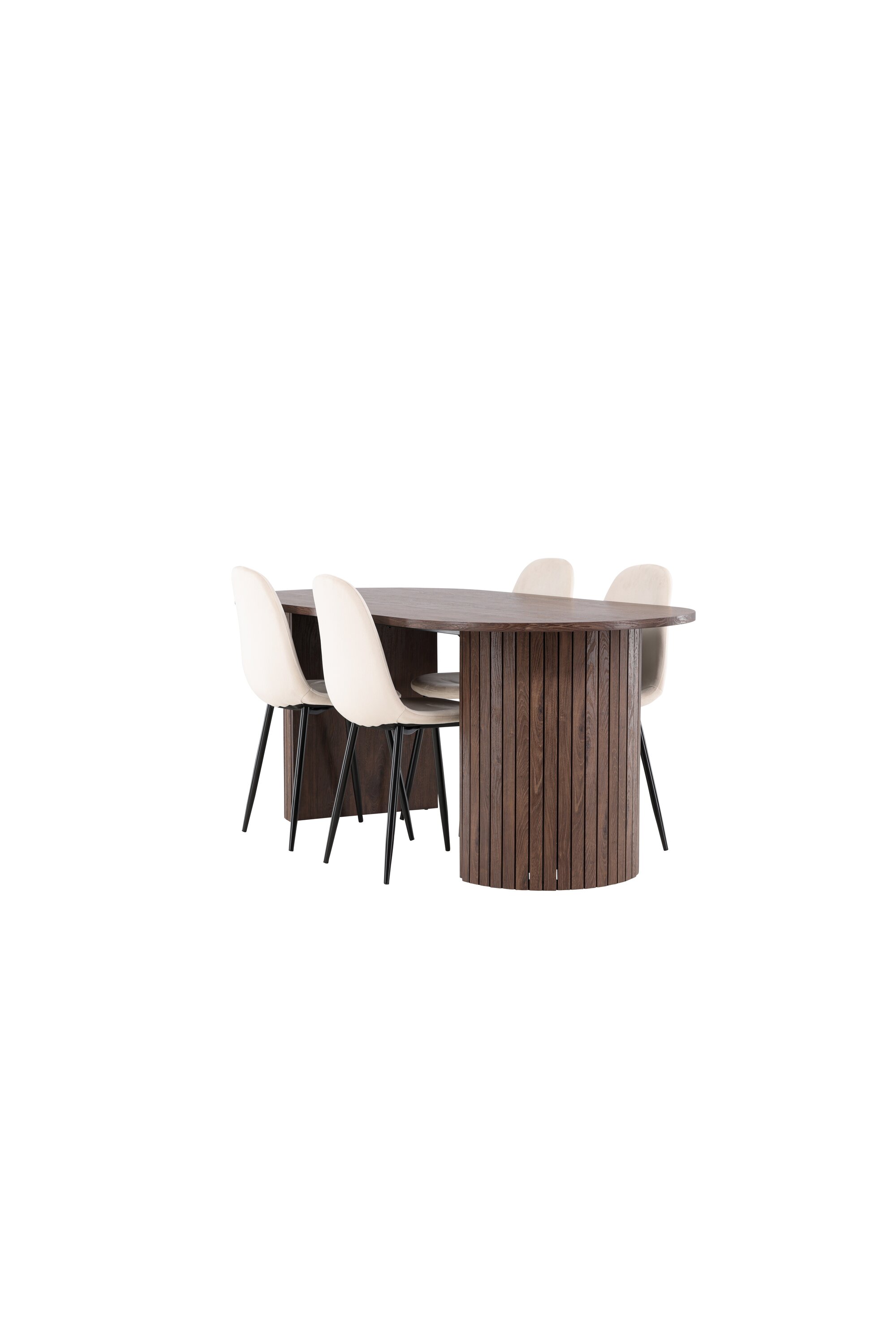 Avastage täiuslik söögikomplekt Polari söögitoolide ja Häröni söögilauaga – moodsa elegantsi ja funktsionaalsuse kombinatsioon teie koju. Polari söögitoolid on elegantse beeži värvi kaasaegne unistus. Nendel toolidel on täielikult polsterdatud disain, mille seljatugi ja iste on sametkangast veidi ümardatud ning jalad on mustast pulbervärvitud metallist. Need on nii mugavad kui ka pilkupüüdvad ning loovad teie söögituppa kutsuva atmosfääri. Vajalik kerge kokkupanek. Hooldusnõuanne: Enne kasutamist immutage kangas tekstiilisprei, mis muudab mustuse ja plekkide eemaldamise lihtsamaks. Eemaldage plekid kohe, pühkides neid õrnalt lapiga. Tugevamate plekkide korral kasuta esmalt plekieemaldajat, mida on testitud kanga vähemnähtavamal osal. Komplektis Häröni söögilaud, kus valmivad kogukonna õitsengud ja mälestused. Suurte mõõtmetega 200×90 cm laud pakub palju ruumi nii pere kui sõprade kogumiseks meeldivateks õhtusöökideks ja pikkadeks vestlusteks. Häröni söögilaud on elegantses mokavärvis, mis annab teie ruumile maalähedase ja neutraalse tunde. Lauaplaat on valmistatud MDF-st ja seda toetavad tugevad terasest jalad, mis tagavad stabiilsuse kõikide söögikordade ja koosviibimiste ajal. Looge selle söögikomplektiga sõpruse ja koosolemise atmosfäär, kus igast söögikorrast saab eriline hetk, mida mäletada. Olgu igapäevaseks söögiks või pidulikuks sündmuseks, Polari söögitoolid ja Häröni söögilaud on teie kodu süda, kus tugevdatakse suhteid ja jagatakse rõõmu.